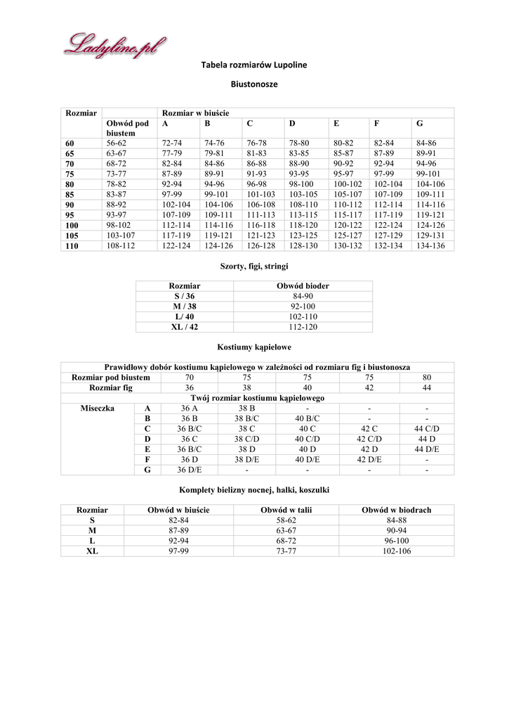 Tabela rozmiarów Lupoline Biustonosze Rozmiar 60 65 70 75 80 85 90 95 100 105 110 Obwód pod biustem 56-62 63-67 68-72 73-77 78-82 83-87 88-92 93-97 98-102 103-107 108-112 Rozmiar w biuście A B C D E F G 72-74 77-79 82-84 87-89 92-94 97-99 102-104 107-109 112-114 117-119 122-124 76-78 81-83 86-88 91-93 96-98 101-103 106-108 111-113 116-118 121-123 126-128 78-80 83-85 88-90 93-95 98-100 103-105 108-110 113-115 118-120 123-125 128-130 80-82 85-87 90-92 95-97 100-102 105-107 110-112 115-117 120-122 125-127 130-132 82-84 87-89 92-94 97-99 102-104 107-109 112-114 117-119 122-124 127-129 132-134 84-86 89-91 94-96 99-101 104-106 109-111 114-116 119-121 124-126 129-131 134-136 74-76 79-81 84-86 89-91 94-96 99-101 104-106 109-111 114-116 119-121 124-126 Szorty, figi, stringi Rozmiar S / 36 M / 38 L/ 40 XL / 42 Obwód bioder 84-90 92-100 102-110 112-120 Kostiumy kąpielowe Prawidłowy dobór kostiumu kąpielowego w zależności od rozmiaru fig i biustonosza 70 75 75 75 80 Rozmiar pod biustem 36 38 40 42 44 Rozmiar fig Twój rozmiar kostiumu kąpielowego 36 A 38 B Miseczka A 36 B 38 B/C 40 B/C B 36 B/C 38 C 40 C 42 C 44 C/D C 36 C 38 C/D 40 C/D 42 C/D 44 D D 36 B/C 38 D 40 D 42 D 44 D/E E 36 D 38 D/E 40 D/E 42 D/E F 36 D/E G Komplety bielizny nocnej, halki, koszulki Rozmiar S M L XL Obwód w biuście 82-84 87-89 92-94 97-99 Obwód w talii 58-62 63-67 68-72 73-77 Obwód w biodrach 84-88 90-94 96-100 102-106