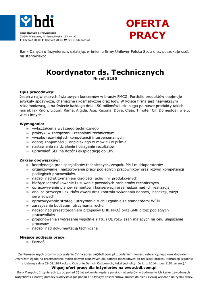 OFERTA PRACY Bank Danych o Inżynierach 02-304 Warszawa, Al. Jerozolimskie 133 lok. 42 T 022 572 78 00 F 022 572 78 03 W www.bdi.com.pl Bank Danych o Inżynierach, działając w imieniu firmy Unilever Polska Sp. z o.o., poszukuje osób na stanowisko: Koordynator ds. Technicznych Nr ref. 8190 Opis pracodawcy: Jeden z największych światowych koncernów w branży FMCG. Portfolio produktów obejmuje artykuły spożywcze, chemiczne i kosmetyczne oraz lody. W Polsce firma jest największym reklamodawcą, a na świecie każdego dnia 150 milionów ludzi sięga po nasze produkty takich marek jak Knorr, Lipton, Rama, Algida, Axe, Rexona, Dove, Clear, Timotei, Cif, Domestos i wielu, wielu innych. Wymagania: • wykształcenia wyższego technicznego • praktyki w zarządzaniu zespołami technicznymi • wysoko rozwiniętych kompetencji interpersonalnych • dobrej znajomości j. angielskiego w mowie i w piśmie • nastawienia na działanie i osiąganie rezultatów • uprawnień SEP na dozór i eksploatację do 1kV Zakres obowiązków: • koordynacja prac specjalistów technicznych, zespołu PM i multioperatorów • organizowanie i nadzorowanie pracy podległych pracowników oraz rozwój kompetencji podległych pracowników. • nadzór nad utrzymaniem ciągłości ruchu linii produkcyjnych • bieżące identyfikowanie i usuwanie powstałych problemów technicznych • opracowywanie planów remontów i konserwacji oraz nadzór nad ich realizacją • analiza przyczyn i skutków awarii oraz kontrola wykonania napraw, inspekcji, wizyt serwisowych • opracowywanie strategii utrzymania ruchu zgodnie ze standardami WCM • zarządzanie budżetem utrzymania ruchu • nadzór nad przestrzeganiem przepisów BHP, PPOŻ oraz GMP przez podległych pracowników • proponowanie i wdrażanie wspólnie z T&I i UE rozwiązań mających na celu ulepszenie procesów • nadzór nad dokumentacją techniczną Miejsce podjęcia pracy: • Poznań Zainteresowanych prosimy o przesłanie CV na adres [email protected] z podaniem numeru referencyjnego oraz dopiskiem: „Wyrażam zgodę na przetwarzanie moich danych osobowych dla potrzeb niezbędnych do realizacji procesu rekrutacji (zgodnie z Ustawą z dnia 29.08.1997 roku o Ochronie Danych Osobowych; tekst jednolity: Dz.U. z 2014r., poz.1182 ze zm.).” Więcej ofert pracy dla inżynierów na www.bdi.com.pl Bank Danych o Inżynierach już od ponad 23 lat aktywnie wspiera polskich inżynierów w budowaniu ich karier zawodowych. Dotychczas z naszej pomocy skorzystało już ponad 167 tysięcy absolwentów. Dołącz do nich i zyskaj wsparcie na rynku pracy.