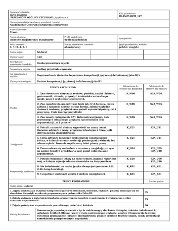 Nazwa przedmiotu: Kod przedmiotu: Język rosyjski (PRZEDMIOTY OGÓLNOUCZELNIANE / Języki obce ) 09.0V27AII99_127 Nazwa jednostki prowadzącej przedmiot / moduł: Akademickie Centrum Kształcenia Językowego Nazwa kierunku: Prawo Forma studiów: Profil kształcenia: jednolite magisterskie, stacjonarne ogólnoakademicki Rok / semestr: 2, 3 / 3, 4, 5, 6 Status przedmiotu / modułu: Język przedmiotu / modułu: obowiązkowy polski / rosyjski Specjalność: Forma zajęć: lektorat Wymiar zajęć: 120 Koordynator przedmiotu / modułu: Osoba prowadząca zajęcia Prowadzący zajęcia: według przydziału czynności Cel przedmiotu / modułu: Doprowadzenie studenta do poziomu kompetencji językowej definiowanej jako B2+ Wymagania wstępne: Poziom kompetencji językowej definiowanej jako B1 Odniesienie do efektów dla programu Odniesienie do efektów dla obszaru 1. Zna słownictwo dotyczące mediów, podróży, sztuki i historii, gastronomii, zdrowia, przyrody i środowiska naturalnego, nauki, pracy i problemów społecznych. K_W06 S2A_W06, 2. Zna zagadnienia gramatyczne takie jak: tryb łączący, mowa zależna i zgodność czasów, strona bierna, zaimki względne złożone i osobowe, przyimki oraz potrafi wyrażać hipotezę, cel i przyczynę. Umie tworzyć przysłówki. K_W06 S2A_W06, 3. Zna zasady redagowania CV i listu motywacyjnego, listu prywatnego i oficjalnego, artykułu, sprawozdania oraz argumentacji „za i przeciw”. K_W06 S2A_W06, 4. Potrafi zrozumieć dłuższą wypowiedź na znany temat. Rozumie artykuły z prasy, programy telewizyjne i filmy, jeśli dotyczą języka standardowego. K_U21 S2A_U11, 5. Czyta artykuły dotyczące problematyki współczesnego świata, w których autorzy zawierają pewien punkt widzenia lub własne opinie. Rozumie współczesny tekst pisany prozą. K_U21 S2A_U11, 6. Porozumiewa się swobodnie z rozmówcą rosyjskojęzycznym na ogólne tematy i przedstawia swój punkt widzenia oraz argumentuje. K_U04 S2A_U09, S2A_U10, 7. Potrafi redagować teksty na różne tematy, napisać raport lub esej, w którym zajmuje własne stanowisko na dany problem. K_U20 S2A_U09, S2A_U10, 8. Ma świadomość, że nauka języka obcego jest procesem LLL (Life-Long-Learning). K_K01 S2A_K01, 9. Uzupełnia i doskonali wiedzę i zdobyte umiejętności. K_K01 S2A_K01, EFEKTY KSZTAŁCENIA Wiedza Umiejętności Kompetencje społeczne TREŚCI PROGRAMOWE Liczba godzin Forma zajęć: lektorat 1. Zajęcia doskonalące wszystkie kompetencje językowe (słuchanie, mówienie, czytanie i pisanie) odnoszące się do słownictwa i tematyki w zakresie proponowanym w podręczniku Edito B2. 75 2. Zajęcia związane z materiałem leksykalno-gramatycznym zawartym w podręczniku i wynikającym z celów nauczania na poziomie B2. 25 3. Zajęcia poświęcone na powtórzenie przerobionego materiału i kolokwia. 20 Metody kształcenia Konwersacje; symulacja scenek z życia codziennego; słuchanie dialogów, tekstów i wiadomości; oglądanie krótkich filmów (sceny z życia codziennego); czytanie, analiza i tłumaczenie tekstów; ćwiczenia gramatyczne (pisane i interaktywne); pisanie krótkich tekstów (maile, listy); prezentacje samodzielnie przygotowanych zagadnień. Nr efektu kształcenia z sylabusa Metody weryfikacji efektów kształcenia Forma i warunki zaliczenia * prezentacje 1,2,3,6,7, * sprawdzian 1,2,3,4,5,6,7,9, * kolokwium 4,5,6,7, * zajęcia praktyczne (weryfikacja poprzez obserwację) 8,9, Zaliczenie z oceną. Warunki zaliczenia są następujące: obecność, aktywność na zajęciach, zaliczenie testów cząstkowych, prac pisemnych lub prezentacji. Ocena za semestr jest wyliczana na podstawie ocen z testów, prac pisemnych oraz oceny aktywności. Student otrzymuje ocenę z przedmiotu będącą konsekwencją zgromadzonych punktów w trakcie czterech semestrów lektoratu oraz prezentacji i testu końcowego (max. 25 punktów). Zasady oceniania są następujące: 20 - 25 pkt - ocena bardzo dobra; 14 24 pkt - ocena dobra; 8 - 13 pkt - ocena dostateczna; poniżej 7 pkt - ocena niedostateczna. Literatura podstawowa Pado A., (2011): Start.ru. Język rosyjski dla średniozaawansowanych, cz. 1 i 2. WSiP Literatura uzupełniająca Pado A., (2003): Ty za ili protiv. Materiały uzupełniające. WSiP NAKŁAD PRACY STUDENTA: Liczba godzin Zajęcia dydaktyczne 120 Udział w konsultacjach 40 Zdawanie egzaminu lub/i zaliczenia 4 Przygotowanie się do zajęć 15 Studiowanie literatury 31 Przygotowanie projektu / eseju / itp. 10 Przygotowanie się do egzaminu lub/i zaliczenia 30 ŁĄCZNY nakład pracy studenta w godz. 250 Liczba punktów ECTS 10