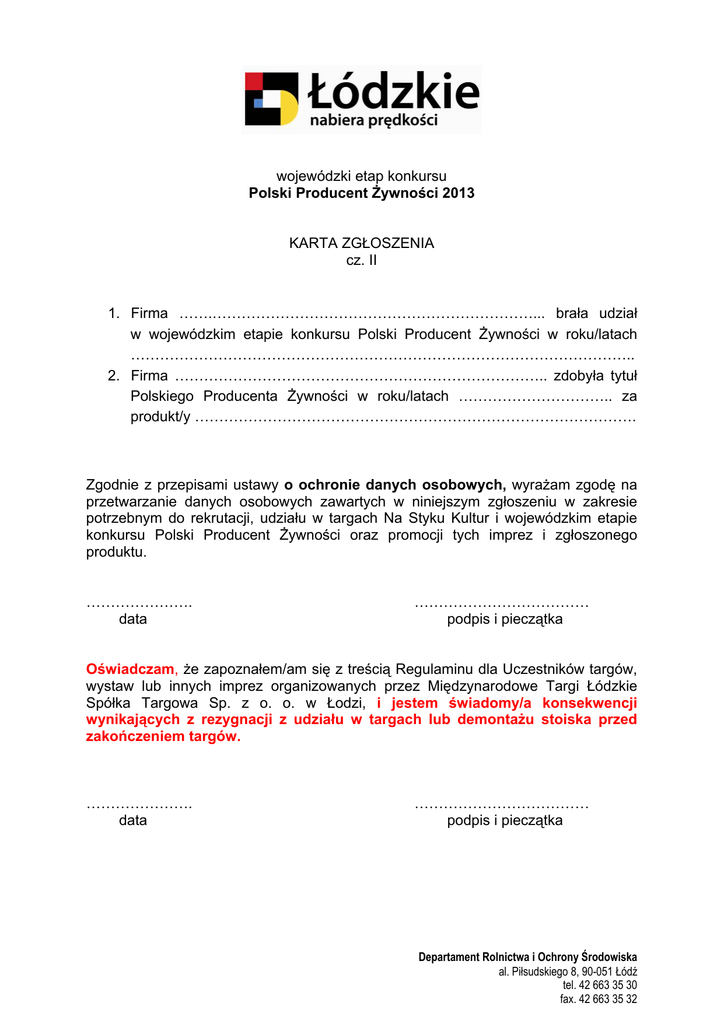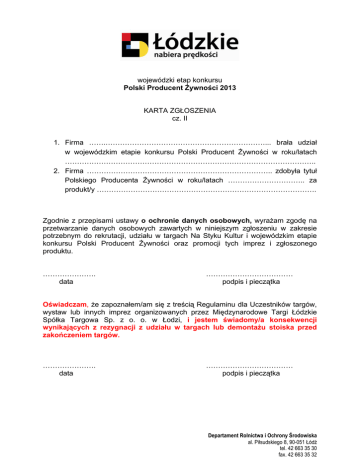 wojewódzki etap konkursu Polski Producent Żywności 2013 KARTA ZGŁOSZENIA cz. II 1. Firma …….…………………………………………………………... brała udział w wojewódzkim etapie konkursu Polski Producent Żywności w roku/latach ………………………………………………………………………………………….. 2. Firma ………………………………………………………………….. zdobyła tytuł Polskiego Producenta Żywności w roku/latach ………………………….. za produkt/y ………………………………………………………………………………. Zgodnie z przepisami ustawy o ochronie danych osobowych, wyrażam zgodę na przetwarzanie danych osobowych zawartych w niniejszym zgłoszeniu w zakresie potrzebnym do rekrutacji, udziału w targach Na Styku Kultur i wojewódzkim etapie konkursu Polski Producent Żywności oraz promocji tych imprez i zgłoszonego produktu. …………………. data ……………………………… podpis i pieczątka Oświadczam, że zapoznałem/am się z treścią Regulaminu dla Uczestników targów, wystaw lub innych imprez organizowanych przez Międzynarodowe Targi Łódzkie Spółka Targowa Sp. z o. o. w Łodzi, i jestem świadomy/a konsekwencji wynikających z rezygnacji z udziału w targach lub demontażu stoiska przed zakończeniem targów. …………………. data ……………………………… podpis i pieczątka Departament Rolnictwa i Ochrony Środowiska al. Piłsudskiego 8, 90-051 Łódź tel. 42 663 35 30 fax. 42 663 35 32