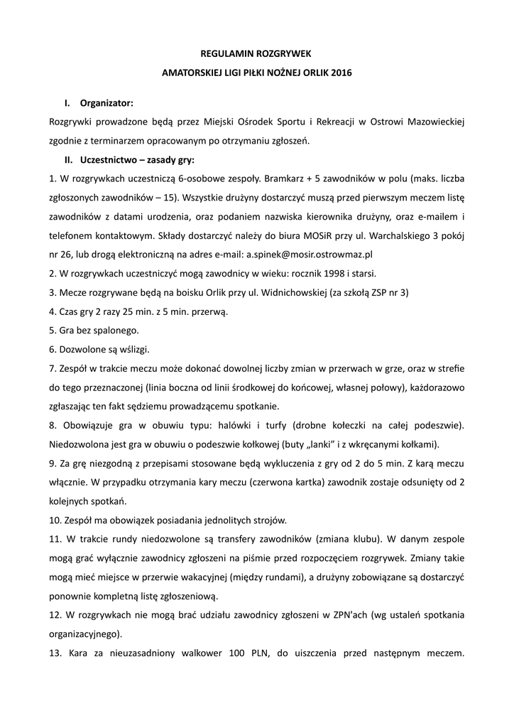 REGULAMIN ROZGRYWEK AMATORSKIEJ LIGI PIŁKI NOŻNEJ ORLIK 2016 I. Organizator: Rozgrywki prowadzone będą przez Miejski Ośrodek Sportu i Rekreacji w Ostrowi Mazowieckiej zgodnie z terminarzem opracowanym po otrzymaniu zgłoszeń. II. Uczestnictwo – zasady gry: 1. W rozgrywkach uczestniczą 6-osobowe zespoły. Bramkarz + 5 zawodników w polu (maks. liczba zgłoszonych zawodników – 15). Wszystkie drużyny dostarczyć muszą przed pierwszym meczem listę zawodników z datami urodzenia, oraz podaniem nazwiska kierownika drużyny, oraz e-mailem i telefonem kontaktowym. Składy dostarczyć należy do biura MOSiR przy ul. Warchalskiego 3 pokój nr 26, lub drogą elektroniczną na adres e-mail: [email protected] 2. W rozgrywkach uczestniczyć mogą zawodnicy w wieku: rocznik 1998 i starsi. 3. Mecze rozgrywane będą na boisku Orlik przy ul. Widnichowskiej (za szkołą ZSP nr 3) 4. Czas gry 2 razy 25 min. z 5 min. przerwą. 5. Gra bez spalonego. 6. Dozwolone są wślizgi. 7. Zespół w trakcie meczu może dokonać dowolnej liczby zmian w przerwach w grze, oraz w strefie do tego przeznaczonej (linia boczna od linii środkowej do końcowej, własnej połowy), każdorazowo zgłaszając ten fakt sędziemu prowadzącemu spotkanie. 8. Obowiązuje gra w obuwiu typu: halówki i turfy (drobne kołeczki na całej podeszwie). Niedozwolona jest gra w obuwiu o podeszwie kołkowej (buty „lanki” i z wkręcanymi kołkami). 9. Za grę niezgodną z przepisami stosowane będą wykluczenia z gry od 2 do 5 min. Z karą meczu włącznie. W przypadku otrzymania kary meczu (czerwona kartka) zawodnik zostaje odsunięty od 2 kolejnych spotkań. 10. Zespół ma obowiązek posiadania jednolitych strojów. 11. W trakcie rundy niedozwolone są transfery zawodników (zmiana klubu). W danym zespole mogą grać wyłącznie zawodnicy zgłoszeni na piśmie przed rozpoczęciem rozgrywek. Zmiany takie mogą mieć miejsce w przerwie wakacyjnej (między rundami), a drużyny zobowiązane są dostarczyć ponownie kompletną listę zgłoszeniową. 12. W rozgrywkach nie mogą brać udziału zawodnicy zgłoszeni w ZPN'ach (wg ustaleń spotkania organizacyjnego). 13. Kara za nieuzasadniony walkower 100 PLN, do uiszczenia przed następnym meczem. Nieuregulowanie skutkuje niedopuszczeniem do następnej kolejki i podwojeniem kary. Brak wpłaty za dwie kolejki wyklucza drużynę z rozgrywek. 14. Wszyscy uczestnicy zobowiązani są do kulturalnego zachowania na terenie ORLIKA ZSP Nr 3 oraz pozostawienie po zawodach porządku i czystości na obiekcie i w szatniach. III. Sposób przeprowadzenia turnieju: 1. Rozgrywki przeprowadzone zostaną w formie ligi , w dwóch rundach wiosennej i jesiennej. 2. O kolejności zajętych miejsc w rozgrywkach grupowych decydować będzie liczba zdobytych punktów: zwycięstwo – 3pkt., remis – 1 pkt., porażka – 0pkt. 3. W przypadku równej liczby zdobytych punktów przez dwa i więcej zespołów, o kolejności zdobytych miejsc decydować będzie kolejno: a) bezpośrednie spotkanie, b) różnica bramek między zainteresowanymi, c) większa liczba zdobytych bramek między zainteresowanymi, d) różnica bramek w całych rozgrywkach, e) większa liczba zdobytych bramek w całych rozgrywkach. IV. Finansowanie: Koszty organizacyjne (przygotowanie obiektu, ryczałty, dokumentacja, ufundowanie pucharów i medali) pokrywa Miejski Ośrodek Sportu i Rekreacji z wpłat uzyskanych od zespołów uczestniczących w rozgrywkach. Wpisowe za udział wynosi 500 PLN (brutto) od zespołu, z możliwością wpłaty w dwóch ratach, które należy uiścić w kasie MOSiR przy ul. Henryka Trębickiego 10, lub na konto BS Ostrów Maz. 87 8923 0008 0016 7976 2000 0102 . Pierwsza rata do 21.04.2015r. V. Nagrody:, Dla trzech najlepszych zespołów ufundowane zostaną puchary i medale, pozostałe uczestniczące zespoły na życzenie otrzymają pamiątkowe dyplomy. Przewidziana jest również statuetka dla najlepszego strzelca oraz bramkarza. Najlepszy strzelec – największa liczba zdobytych bramek. Najlepszy bramkarz – głosy kapitanów wszystkich drużyn. W przypadku jednakowej liczby głosów zdobytych przez dwóch i więcej bramkarzy, dodatkowy głos ma organizator. W sprawach nie uwzględnionych w regulaminie decyzje podejmuje organizator.