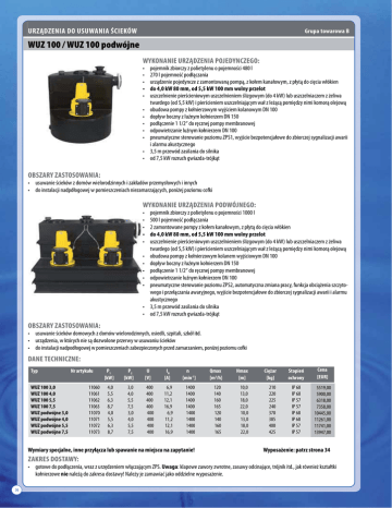 URZĄDZENIA DO USUWANIA ŚCIEKÓW Grupa towarowa B WUZ 100 / WUZ 100 podwójne WYKONANIE URZĄDZENIA POJEDYNCZEGO: t t t t t t t t t t t t pojemnik zbiorczy z polietylenu o pojemności 480 l 270 l pojemność podłączania urządzenie pojedyncze z zamontowaną pompą, z kołem kanałowym, z płytą do cięcia włókien do 4,0 kW 80 mm, od 5,5 kW 100 mm wolny przelot uszczelnienie pierścieniowym uszczelnieniem ślizgowym (do 4 kW) lub uszczelniaczem z żeliwa twardego (od 5,5 kW) i pierścieniem uszczelniającym wał z leżącą pomiędzy nimi komorą olejową obudowa pompy z kołnierzowym wyjściem kolanowym DN 100 dopływ boczny z luźnym kołnierzem DN 150 podłączenie 1 1/2“ do ręcznej pompy membranowej odpowietrzanie luźnym kołnierzem DN 100 pneumatyczne sterowanie poziomu ZPS1, wyjście bezpotencjałowe do zbiorczej sygnalizacji awarii i alarmu akustycznego 3,5 m przewód zasilania do silnika od 7,5 kW rozruch gwiazda-trójkąt OBSZARY ZASTOSOWANIA: t usuwanie ścieków z domów wielorodzinnych i zakładów przemysłowych i innych t do instalacji nadpdłogowej w pomieszczeniach niezamarzających, poniżej poziomu cofki WYKONANIE URZĄDZENIA PODWÓJNEGO: t t t t t t t t t t t t pojemnik zbiorczy z polietylenu o pojemności 1000 l 500 l pojemność podłączania 2 zamontowane pompy z kołem kanałowym, z płytą do cięcia włókien do 4,0 kW 80 mm, od 5,5 kW 100 mm wolny przelot uszczelnienie pierścieniowym uszczelnieniem ślizgowym (do 4 kW) lub uszczelniaczem z żeliwa twardego (od 5,5 kW) i pierścieniem uszczelniającym wał z leżącą pomiędzy nimi komorą olejową obudowa pompy z kołnierzowym kolanem wyjściowym DN 100 dopływ boczny z łuźnym kołnierzem DN 150 podłączenie 1 1/2“ do ręcznej pompy membranowej odpowietrzanie luźnym kołnierzem DN 100 pneumatyczne sterowanie poziomu ZPS2, automatyczna zmiana pracy, funkcja obciążenia szczytowego i przełączania awaryjnego, wyjście bezpotencjałowe do zbiorczej sygnalizacji awarii i alarmu akustycznego 3,5 m przewód zasilania do silnika od 7,5 kW rozruch gwiazda-trójkąt OBSZARY ZASTOSOWANIA: t usuwanie ścieków domowych z domów wielorodzinnych, osiedli, szpitali, szkół itd. t urządzenia, w których nie są dozwolone przerwy w usuwaniu ścieków t do instalacji nadpodłogowej w pomieszczeniach zabezpieczonych przed zamarzaniem, poniżej poziomu cofki DANE TECHNICZNE: Typ Typ artykułu P1 P1 P2 P2 U Nr Nr artykułu [kW] [kW][kW] [kW][V] WUZ 100 WUZ 1003,0 3,0 WUZ 100 WUZ 1004,0 4,0 WUZ 100 5,5 WUZ 100 5,5 WUZ 100 7,5 WUZ 100 7,5 3,0 WUZ podwójne WUZ podwójne WUZ podwójne 4,03,0 WUZ podwójne5,54,0 WUZ podwójne WUZ podwójne WUZ podwójne7,55,5 WUZ podwójne 7,5 11060 110604,0 11061 110615,5 11062 6,3 11062 11063 8,7 110634,0 11070 1107011071 4,05,5 1107111072 5,56,3 1107211073 6,38,7 11073 8,7 4,0 5,5 6,3 8,7 3,0 4,0 5,5 7,5 3,0 4,0 5,5 7,5 3,0 4,0 5,5 7,5 3,0400 4,0400 400 5,5 400 7,5400 400400 400400 400400 400 U IN [V][A] INn [min [A] -1] nQmax [m-13]/h] [min Qmax Hmax 3 [m[m] /h] Hmax Ciężar [kg] [m] Ciężar Stopień ochrony [kg] 4006,9 11,2 400 12,1 400 16,9 4006,9 6,9 11,2 11,2 12,1 16,9 12,1 16,9 1400 6,9 1400 11,2 1400 12,1 1400 16,9 1400 1400 1400 1400 1400 1400 1400 1400 1400120 1400140 160 1400 165 1400120 120140 140160 160165 165 10,0 120 13,0 140 18,0 160 22,0 165 10,0 10,0 13,0 13,0 18,0 22,0 18,0 22,0 210 10,0 220 13,0 225 18,0 240 22,0 370 370 385 385 400 425 400 425 IP 68 210 IP 68 220 IP 57 225 IP 57 240 IP 68 IP 68IP 68 IP 57IP 68 IP 57IP 57 Wymiary specjalne, inne przyłącza lub spawanie na miejscu na zapytanie! Cena Stopień [EUR] ochrony 5519,00 IP 68 5900,00 IP 68 6318,00 IP 57 7358,00 IP 57 10445,00 11261,00 11741,00 13947,00 IP 57 Wyposażenie: patrz strona 34 ZAKRES DOSTAWY: t gotowe do podłączenia, wraz z urzędzeniem włączającym ZPS. Uwaga: klapowe zawory zwrotne, zasuwy odcinające, trójnik itd., jak również kształtki kołnierzowe nie należą do zakresu dostawy! Należy je zamawiać jako oddzielne wyposażenie. 36