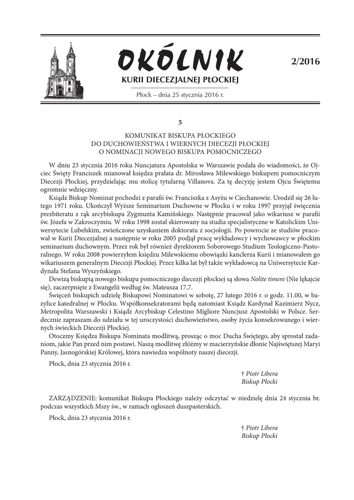 OKÓLNIK 2/2016 KURII DIECEZJALNEJ PŁOCKIEJ Płock – dnia 25 stycznia 2016 r. 5 KOMUNIKAT BISKUPA PŁOCKIEGO DO DUCHOWIEŃSTWA I WIERNYCH DIECEZJI PŁOCKIEJ O NOMINACJI NOWEGO BISKUPA POMOCNICZEGO W dniu 23 stycznia 2016 roku Nuncjatura Apostolska w Warszawie podała do wiadomości, że Ojciec Święty Franciszek mianował księdza prałata dr. Mirosława Milewskiego biskupem pomocniczym Diecezji Płockiej, przydzielając mu stolicę tytularną Villanova. Za tę decyzję jestem Ojcu Świętemu ogromnie wdzięczny. Ksiądz Biskup Nominat pochodzi z parafii św. Franciszka z Asyżu w Ciechanowie. Urodził się 26 lutego 1971 roku. Ukończył Wyższe Seminarium Duchowne w Płocku i w roku 1997 przyjął święcenia prezbiteratu z rąk arcybiskupa Zygmunta Kamińskiego. Następnie pracował jako wikariusz w parafii św. Józefa w Zakroczymiu. W roku 1998 został skierowany na studia specjalistyczne w Katolickim Uniwersytecie Lubelskim, zwieńczone uzyskaniem doktoratu z socjologii. Po powrocie ze studiów pracował w Kurii Diecezjalnej a następnie w roku 2005 podjął pracę wykładowcy i wychowawcy w płockim seminarium duchownym. Przez rok był również dyrektorem Soborowego Studium Teologiczno-Pastoralnego. W roku 2008 powierzyłem księdzu Milewskiemu obowiązki kanclerza Kurii i mianowałem go wikariuszem generalnym Diecezji Płockiej. Przez kilka lat był także wykładowcą na Uniwersytecie Kardynała Stefana Wyszyńskiego. Dewizą biskupią nowego biskupa pomocniczego diecezji płockiej są słowa Nolite timere (Nie lękajcie się), zaczerpnięte z Ewangelii według św. Mateusza 17,7. Święceń biskupich udzielę Biskupowi Nominatowi w sobotę, 27 lutego 2016 r. o godz. 11.00, w bazylice katedralnej w Płocku. Współkonsekratorami będą natomiast Ksiądz Kardynał Kazimierz Nycz, Metropolita Warszawski i Ksiądz Arcybiskup Celestino Migliore Nuncjusz Apostolski w Polsce. Serdecznie zapraszam do udziału w tej uroczystości duchowieństwo, osoby życia konsekrowanego i wiernych świeckich Diecezji Płockiej. Otoczmy Księdza Biskupa Nominata modlitwą, prosząc o moc Ducha Świętego, aby sprostał zadaniom, jakie Pan przed nim postawi. Naszą modlitwę złóżmy w macierzyńskie dłonie Najświętszej Maryi Panny, Jasnogórskiej Królowej, która nawiedza wspólnoty naszej diecezji. Płock, dnia 23 stycznia 2016 r. † Piotr Libera Biskup Płocki ZARZĄDZENIE: komunikat Biskupa Płockiego należy odczytać w niedzielę dnia 24 stycznia br. podczas wszystkich Mszy św., w ramach ogłoszeń duszpasterskich. Płock, dnia 23 stycznia 2016 r. † Piotr Libera Biskup Płocki – 14 – 6 ZAPROSZENIE BISKUPA PŁOCKIEGO NA DZIEŃ ŻYCIA KONSEKROWANEGO W święto Ofiarowania Pańskiego będziemy obchodzić kolejny już – ustanowiony przez św. Jana Pawła II – Dzień Życia Konsekrowanego. Tym razem nasze świętowanie zostanie połączone z uroczystym zakończeniem Roku Życia Konsekrowanego. Pragniemy podziękować za ten czas łaski i zarazem prosić o trwałe jego owoce w życiu Kościoła i każdej osoby powołanej przez Chrystusa, by na drodze rad ewangelicznych służyć Bogu i człowiekowi. Do wspólnej modlitwy w katedrze płockiej zapraszam 2 lutego na godz. 10:00 wszystkie osobowy konsekrowane z naszej diecezji oraz każdego, kto pragnie modlitewnie wyrazić im wdzięczność i wsparcie. Po Mszy Świętej spotkamy się w Opactwie Pobenedyktyńskim, na wspólnej agapie, ubogaconej występem międzyzakonnej scholi sióstr z naszej diecezji. W roku Jubileuszowym Bożego Miłosierdzia powierzamy nasze świętowanie wstawiennictwu Najświętszej Maryi Pannie, Matce Miłosierdzia prosząc, aby wszyscy powołani, swoją postawą na co dzień, coraz bardziej ukazywali światu miłosierne oblicze Ojca. Płock, dnia 21 stycznia 2016 r. † Piotr Libera Biskup Płocki INFORMACJA: Zgodnie z decyzją Konferencji Episkopatu Polski z dnia 29 listopada 2002 r. oraz decyzją Biskupa Płockiego, ofiary zebrane na tacę w Święto Ofiarowania Pańskiego, przeznaczone są na potrzeby zakonów kontemplacyjnych w Polsce. Wpłat proszę dokonywać na konto diecezjalne z dopiskiem: „Taca z 2 lutego”. Płock, dnia 22 stycznia 2016 r. Ks. Mirosław Milewski Wikariusz Generalny 7 LIST PASTERSKI EPISKOPATU POLSKI NA DZIEŃ ŻYCIA KONSEKROWANEGO 2 LUTEGO 2016 ROKU „Osoby konsekrowane świadkami miłosierdzia” Drodzy Bracia i Siostry, Liturgia święta Ofiarowania Pańskiego przypomina nam scenę, w której Maryja i Józef przynieśli do Jerozolimy Dzieciątko Jezus, aby – zgodnie z prawem żydowskim – poświęcić je Bogu. Kiedy Jezus umierał na krzyżu okazało się w pełni, że nie był to jedynie rytuał. Ofiarowując swe życie, objawił światu Boże miłosierdzie. Bez odniesień do Boga, który jest Miłością Miłosierną i który tej Miłości uczy każdego wierzącego, prawdy Ewangelii nie będą przekazywane i nie napełnią świata radością z tego, że: „[…] nasze oczy ujrzały Twoje zbawienie, któreś przygotował wobec wszystkich narodów” (Łk 2, 30-31). Ofiarowanie Jezusa w świątyni, które dzisiaj wspominamy, jest pierwszą manifestacją Miłości Miłosiernej i zapowiedzią Jego ofiary, którą złoży za zbawienie świata pod koniec swojego życia. W tym roku w święto Ofiarowania Pańskiego kończy się ogłoszony przez papieża Franciszka Rok Życia Konsekrowanego. Był to czas wielu wydarzeń organizowanych przez Kościół w Polsce i na świecie. Refleksja i modlitwa dotyczyła całego życia konsekrowanego w jego rozmaitych formach: zakonów i zgromadzeń zakonnych, instytutów świeckich, stowarzyszeń życia apostolskiego, dziewic, wdów konsekrowanych i pustelników. Pragniemy wyrazić wdzięczność wszystkim, którzy zaangażowali się w inicjatywy i wydarzenia Roku Życia Konsekrowanego, służąc swoim doświadczeniem i wiedzą. Dzięki temu mogliśmy spojrzeć z wdzięcznością na dar, jakim jest życie konsekrowane w Kościele i w społec