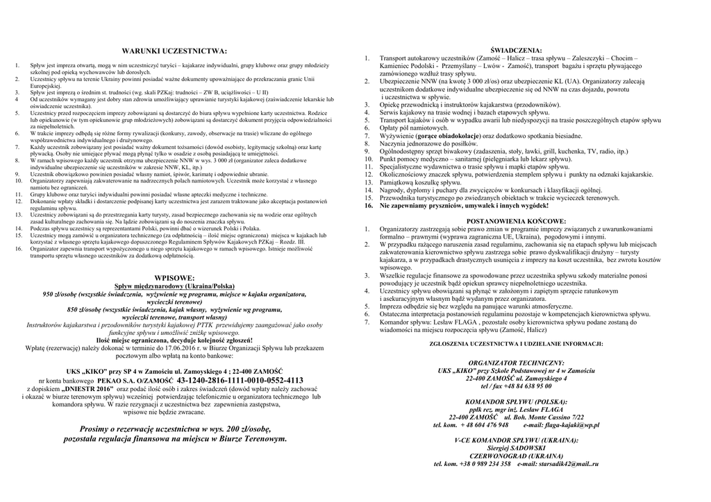 WARUNKI UCZESTNICTWA: 1. 1. 2. 3. 4 5. 6. 7. 8. 9. 10. 11. 12. 13. 14. 15. 16. Spływ jest impreza otwartą, mogą w nim uczestniczyć turyści – kajakarze indywidualni, grupy klubowe oraz grupy młodzieży szkolnej pod opieką wychowawców lub dorosłych. Uczestnicy spływu na terenie Ukrainy powinni posiadać ważne dokumenty upoważniające do przekraczania granic Unii Europejskiej. Spływ jest imprezą o średnim st. trudności (wg. skali PZKaj: trudności – ZW B, uciążliwości – U II) Od uczestników wymagany jest dobry stan zdrowia umożliwiający uprawianie turystyki kajakowej (zaświadczenie lekarskie lub oświadczenie uczestnika). Uczestnicy przed rozpoczęciem imprezy zobowiązani są dostarczyć do biura spływu wypełnione karty uczestnictwa. Rodzice lub opiekunowie (w tym opiekunowie grup młodzieżowych) zobowiązani są dostarczyć dokument przyjęcia odpowiedzialności za niepełnoletnich. W trakcie imprezy odbędą się różne formy rywalizacji (konkursy, zawody, obserwacje na trasie) wliczane do ogólnego współzawodnictwa indywidualnego i drużynowego. Każdy uczestnik zobowiązany jest posiadać ważny dokument tożsamości (dowód osobisty, legitymację szkolną) oraz kartę pływacką. Osoby nie umiejące pływać mogą płynąć tylko w osadzie z osobą posiadającą te umiejętności. W ramach wpisowego każdy uczestnik otrzyma ubezpieczenie NNW w wys. 3 000 zł (organizator zaleca dodatkowe indywidualne ubezpieczenie się uczestników w zakresie NNW, KL, itp.) Uczestnik obowiązkowo powinien posiadać własny namiot, śpiwór, karimatę i odpowiednie ubranie. Organizatorzy zapewniają zakwaterowanie na nadrzecznych polach namiotowych. Uczestnik może korzystać z własnego namiotu bez ograniczeń. Grupy klubowe oraz turyści indywidualni powinni posiadać własne apteczki medyczne i techniczne. Dokonanie wpłaty składki i dostarczenie podpisanej karty uczestnictwa jest zarazem traktowane jako akceptacja postanowień regulaminu spływu. Uczestnicy zobowiązani są do przestrzegania karty turysty, zasad bezpiecznego zachowania się na wodzie oraz ogólnych zasad kulturalnego zachowania się. Na lądzie zobowiązani są do noszenia znaczka spływu. Podczas spływu uczestnicy są reprezentantami Polski, powinni dbać o wizerunek Polski i Polaka. Uczestnicy mogą zamówić u organizatora technicznego (za odpłatnością – ilość miejsc ograniczona) miejsca w kajakach lub korzystać z własnego sprzętu kajakowego dopuszczonego Regulaminem Spływów Kajakowych PZKaj – Rozdz. III. Organizator zapewnia transport wypożyczonego u niego sprzętu kajakowego w ramach wpisowego. Istnieje możliwość transportu sprzętu własnego uczestników za dodatkową odpłatnością. WPISOWE: Spływ międzynarodowy (Ukraina/Polska) 950 zł/osobę (wszystkie świadczenia, wyżywienie wg programu, miejsce w kajaku organizatora, wycieczki terenowe) 850 zł/osobę (wszystkie świadczenia, kajak własny, wyżywienie wg programu, wycieczki terenowe, transport własny) Instruktorów kajakarstwa i przodowników turystyki kajakowej PTTK przewidujemy zaangażować jako osoby funkcyjne spływu i umożliwić zniżkę wpisowego. Ilość miejsc ograniczona, decyduje kolejność zgłoszeń! Wpłatę (rezerwację) należy dokonać w terminie do 17.06.2016 r. w Biurze Organizacji Spływu lub przekazem pocztowym albo wpłatą na konto bankowe: UKS „KIKO” przy SP 4 w Zamościu ul. Zamoyskiego 4 ; 22-400 ZAMOŚĆ nr konta bankowego PEKAO S.A. O/ZAMOŚĆ 43-1240-2816-1111-0010-0552-4113 z dopiskiem „DNIESTR 2016” oraz podać ilość osób i zakres świadczeń (dowód wpłaty należy zachować i okazać w biurze terenowym spływu) wcześniej potwierdzając telefonicznie u organizatora technicznego lub komandora spływu. W razie rezygnacji z uczestnictwa bez zapewnienia zastępstwa, wpisowe nie będzie zwracane. Prosimy o rezerwację uczestnictwa w wys. 200 zł/osobę, pozostała regulacja finansowa na miejscu w Biurze Terenowym. 2. 3. 4. 5. 6. 7. 8. 9. 10. 11. 12. 13. 14. 15. 16. 1. 2. 3. 4. 5. 6. 7. ŚWIADCZENIA: Transport autokarowy uczestników (Zamość – Halicz – trasa spływu – Zaleszczyki – Chocim – Kamieniec Podolski - Przemyślany – Lwów - Zamość), transport bagażu i sprzętu pływającego zamówionego wzdłuż trasy spływu. Ubezpieczenie NNW (na kwotę 3 000 zł/os) oraz ubezpieczenie KL (UA). Organizatorzy zalecają uczestnikom dodatkowe indywidualne ubezpieczenie się od NNW na czas dojazdu, powrotu i uczestnictwa w spływie. Opiekę przewodnicką i instruktorów kajakarstwa (przodowników). Serwis kajakowy na trasie wodnej i bazach etapowych spływu. Transport kajaków i osób w wypadku awarii lub niedyspozycji na trasie poszczególnych etapów spływu Opłaty pól namiotowych. Wyżywienie (gorące obiadokolacje) oraz dodatkowo spotkania biesiadne. Naczynia jednorazowe do posiłków. Ogólnodostępny sprzęt biwakowy (zadaszenia, stoły, ławki, grill, kuchenka, TV, radio, itp.) Punkt pomocy medyczno – sanitarnej (pielęgniarka lub lekarz spływu). Specjalistyczne wydawnictwa o trasie spływu i mapki etapów spływu. Okolicznościowy znaczek spływu, potwierdzenia stemplem spływu i punkty na odznaki kajakarskie. Pamiątkową koszulkę spływu. Nagrody, dyplomy i puchary dla zwycięzców w konkursach i klasyfikacji ogólnej. Przewodnika turystycznego po zwiedzanych obiektach w trakcie wycieczek terenowych. Nie zapewniamy pryszniców, umywalek i innych wygódek! POSTANOWIENIA KOŃCOWE: Organizatorzy zastrzegają sobie prawo zmian w programie imprezy związanych z uwarunkowaniami formalno – prawnymi (wyprawa zagraniczna UE, Ukraina), pogodowymi i innymi. W przypadku rażącego naruszenia zasad regulaminu, zachowania się na etapach spływu lub miejscach zakwaterowania kierownictwo spływu zastrzega sobie prawo dyskwalifikacji drużyny – turysty kajakarza, a w przypadkach drastycznych usunięcia z imprezy na koszt uczestnika, bez zwrotu kosztów wpisow