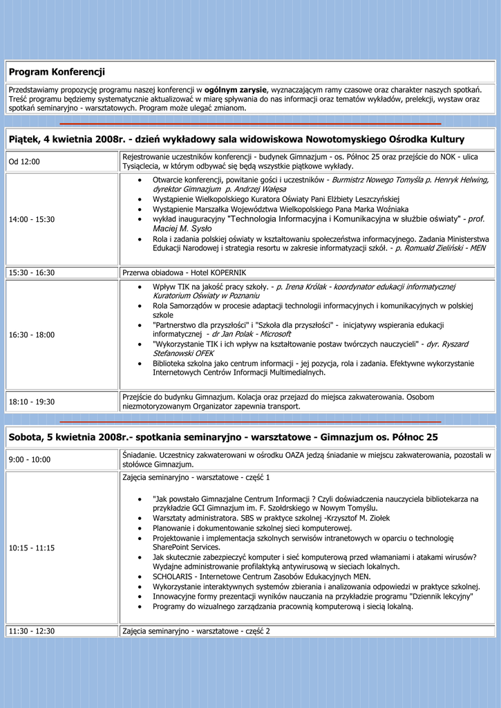 Program Konferencji Przedstawiamy propozycję programu naszej konferencji w ogólnym zarysie, wyznaczającym ramy czasowe oraz charakter naszych spotkań. Treść programu będziemy systematycznie aktualizować w miarę spływania do nas informacji oraz tematów wykładów, prelekcji, wystaw oraz spotkań seminaryjno - warsztatowych. Program może ulegać zmianom. Piątek, 4 kwietnia 2008r. - dzień wykładowy sala widowiskowa Nowotomyskiego Ośrodka Kultury Od 12:00 14:00 - 15:30 Rejestrowanie uczestników konferencji - budynek Gimnazjum - os. Północ 25 oraz przejście do NOK - ulica Tysiąclecia, w którym odbywać się będą wszystkie piątkowe wykłady. Otwarcie konferencji, powitanie gości i uczestników - Burmistrz Nowego Tomyśla p. Henryk Helwing, Wystąpienie Wielkopolskiego Kuratora Oświaty Pani Elżbiety Leszczyńskiej Wystąpienie Marszałka Województwa Wielkopolskiego Pana Marka Woźniaka wykład inauguracyjny "Technologia Informacyjna i Komunikacyjna w służbie oświaty" - prof. Maciej M. Sysło 15:30 - 16:30 Wpływ TIK na jakość pracy szkoły. - p. Irena Królak - koordynator edukacji informatycznej Rola Samorządów w procesie adaptacji technologii informacyjnych i komunikacyjnych w polskiej szkole "Partnerstwo dla przyszłości" i "Szkoła dla przyszłości" - inicjatywy wspierania edukacji informatycznej - dr Jan Polak - Microsoft "Wykorzystanie TIK i ich wpływ na kształtowanie postaw twórczych nauczycieli" - dyr. Ryszard 18:10 - 19:30 Rola i zadania polskiej oświaty w kształtowaniu społeczeństwa informacyjnego. Zadania Ministerstwa Edukacji Narodowej i strategia resortu w zakresie informatyzacji szkół. - p. Romuald Zieliński - MEN Przerwa obiadowa - Hotel KOPERNIK 16:30 - 18:00 dyrektor Gimnazjum p. Andrzej Wałęsa Kuratorium Oświaty w Poznaniu Stefanowski OFEK Biblioteka szkolna jako centrum informacji - jej pozycja, rola i zadania. Efektywne wykorzystanie Internetowych Centrów Informacji Multimedialnych. Przejście do budynku Gimnazjum. Kolacja oraz przejazd do miejsca zakwaterowania. Osobom niezmotoryzowanym Organizator zapewnia transport. Sobota, 5 kwietnia 2008r.- spotkania seminaryjno - warsztatowe - Gimnazjum os. Północ 25 9:00 - 10:00 Śniadanie. Uczestnicy zakwaterowani w ośrodku OAZA jedzą śniadanie w miejscu zakwaterowania, pozostali w stołówce Gimnazjum. Zajęcia seminaryjno - warsztatowe - część 1 10:15 - 11:15 11:30 - 12:30 "Jak powstało Gimnazjalne Centrum Informacji ? Czyli doświadczenia nauczyciela bibliotekarza na przykładzie GCI Gimnazjum im. F. Szołdrskiego w Nowym Tomyślu. Warsztaty administratora. SBS w praktyce szkolnej -Krzysztof M. Ziołek Planowanie i dokumentowanie szkolnej sieci komputerowej. Projektowanie i implementacja szkolnych serwisów intranetowych w oparciu o technologię SharePoint Services. Jak skutecznie zabezpieczyć komputer i sieć komputerową przed włamaniami i atakami wirusów? Wydajne administrowanie profilaktyką antywirusową w sieciach lokalnych. SCHOLARIS - Internetowe Centrum Zasobów Edukacyjnych MEN. Wykorzystanie interaktywnych systemów zbierania i analizowania odpowiedzi w praktyce szkolnej. Innowacyjne formy prezentacji wyników nauczania na przykładzie programu "Dziennik lekcyjny" Programy do wizualnego zarządzania pracownią komputerową i siecią lokalną. Zajęcia seminaryjno - warsztatowe - część 2 Blaski i cienie wykorzystania ICIM - warsztat opiekuna. Warsztaty administratora. SBS w praktyce szkolnej -Krzysztof M. Ziołek Planowanie i dokumentowanie szkolnej sieci komputerowej. Projektowanie i implementacja szkolnych serwisów intranetowych w oparciu o technologię SharePoint Services. Jak skutecznie zabezpieczyć komputer i sieć komputerową przed włamaniami i atakami wirusów? Wydajne administrowanie profilaktyką antywirusową w sieciach lokalnych. Komputery iMac nowoczesnym i optymalnym środowiskiem edukacyjnym Przegląd propozycji wydawniczych jako narzędzie pracy z uczniem na lekcjach. SCHOLARIS - Internetowe Centrum Zasobów Edukacyjnych MEN. Wykorzystanie interaktywnych systemów zbierania i analizowania odpowiedzi w praktyce szkolnej. Zajęcia seminaryjno - warsztatowe - część 3 12:45 - 13:45 14:00 - 15:00 Rola biblioteki w zakresie udostępniania TIK. Jak organizować udostępnianie technologii? Warsztaty administratora. SBS w praktyce szkolnej -Krzysztof M. Ziołek Kamery IP w monitoringu i dydaktyce. Optymalne wykorzystanie technologii bezprzewodowych w szkole. Projektowanie i budowa Głównego Punktu Dystrybucyjnego szkolnej infrastruktury informatycznej jako element sprawnej i wydajnej sieci lokalnej. Komputery iMac nowoczesnym i optymalnym środowiskiem edukacyjnym Przegląd propozycji wydawniczych jako narzędzie pracy z uczniem na lekcjach. SCHOLARIS - Internetowe Centrum Zasobów Edukacyjnych MEN. Tablice interaktywne nowoczesnym narzędziem efektywnego kształcenia. Kompleksowe wsparcie realizacji procesu edukacyjnego w oparciu o wizualny system zarządzający treściami edukacyjnymi. Przerwa obiadowa Zajęcia seminaryjno - warsztatowe - część 4 15:00 - 16:00 16:05 - 17:00 Technologie Informacyjne i Komunikacyjne nowoczesnym źródłem informacji w bibliotece szkolnej. Warsztaty administratora. SBS w praktyce szkolnej -Krzysztof M. Ziołek Kamery IP w monitoringu i dydaktyce. Optymalne wykorzystanie technologii bezprzewodowych w szkole. Projektowanie i budowa Głównego Punktu Dystrybucyjnego szkolnej infrastruktury informatycznej jako element sprawnej i wydajnej sieci lokalnej. Komputery iMac nowoczesnym i optymalnym środowiskiem edukacyjnym Przegląd propozycji wydawniczych jako narzędzie pracy z uczniem na lekcjach. SCHOLARIS - Internetowe Centrum Zasobów Edukacyjnych MEN. Wykorzystanie multimedialnych technologii strumieniowych, intenetowej telewizji jako element nowoczesnej i atrakcyjnej formy kształcenia. Tablice interaktywne nowoczesnym narzędziem efektywnego kształcenia. Kontrola treści internetowych w szkolnych pracowni