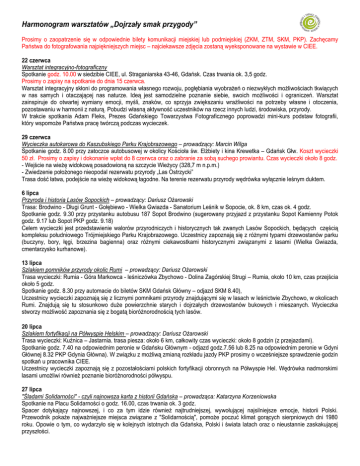 Harmonogram warsztatów „Dojrzały smak przygody” Prosimy o zaopatrzenie się w odpowiednie bilety komunikacji miejskiej lub podmiejskiej (ZKM, ZTM, SKM, PKP). Zachęcamy Państwa do fotografowania najpiękniejszych miejsc – najciekawsze zdjęcia zostaną wyeksponowane na wystawie w CIEE. 22 czerwca Warsztat integracyjno-fotograficzny Spotkanie godz. 10.00 w siedzibie CIEE, ul. Straganiarska 43-46, Gdańsk. Czas trwania ok. 3,5 godz. Prosimy o zapisy na spotkanie do dnia 15 czerwca. Warsztat integracyjny skłoni do programowania własnego rozwoju, pogłębiania wyobrażeń o niezwykłych możliwościach tkwiących w nas samych i otaczającej nas naturze. Ideą jest samodzielne poznanie siebie, swoich możliwości i ograniczeń. Warsztat zainspiruje do otwartej wymiany emocji, myśli, znaków, co sprzyja zwiększaniu wrażliwości na potrzeby własne i otoczenia, pozostawaniu w harmonii z naturą. Pobudzi własną aktywność uczestników na rzecz innych ludzi, środowiska, przyrody. W trakcie spotkania Adam Fleks, Prezes Gdańskiego Towarzystwa Fotograficznego poprowadzi mini-kurs podstaw fotografii, który wspomoże Państwa pracę twórczą podczas wycieczek. 29 czerwca Wycieczka autokarowa do Kaszubskiego Parku Krajobrazowego – prowadzący: Marcin Wilga Spotkanie godz. 8.00 przy zatoczce autobusowej w okolicy Kościoła św. Elżbiety i kina Krewetka – Gdańsk Głw. Koszt wycieczki 50 zł. Prosimy o zapisy i dokonanie wpłat do 8 czerwca oraz o zabranie za sobą suchego prowiantu. Czas wycieczki około 8 godz. - Wejście na wieżę widokową posadowioną na szczycie Wieżycy (328,7 m n.p.m.) - Zwiedzenie położonego nieopodal rezerwatu przyrody „Las Ostrzycki” Trasa dość łatwa, podejście na wieżę widokową łagodne. Na terenie rezerwatu przyrody wędrówka wyłącznie leśnym duktem. 6 lipca Przyroda i historia Lasów Sopockich – prowadzący: Dariusz Ożarowski Trasa: Brodwino - Długi Grunt - Gołębiewo - Wielka Gwiazda - Sanatorium Leśnik w Sopocie, ok. 8 km, czas ok. 4 godz. Spotkanie godz. 9.30 przy przystanku autobusu 187 Sopot Brodwino (sugerowany przyjazd z przystanku Sopot Kamienny Potok godz. 9.17 lub Sopot PKP godz. 9.18) Celem wycieczki jest przedstawienie walorów przyrodniczych i historycznych tak zwanych Lasów Sopockich, będących częścią kompleksu południowego Trójmiejskiego Parku Krajobrazowego. Uczestnicy zapoznają się z różnymi typami drzewostanów parku (buczyny, bory, łęgi, brzezina bagienna) oraz różnymi ciekawostkami historycznymi związanymi z lasami (Wielka Gwiazda, cmentarzysko kurhanowe). 13 lipca Szlakiem pomników przyrody okolic Rumi – prowadzący: Dariusz Ożarowski Trasa wycieczki: Rumia - Góra Markowca - leśniczówka Zbychowo - Dolina Zagórskiej Strugi – Rumia, około 10 km, czas przejścia około 5 godz. Spotkanie godz. 8.30 przy automacie do biletów SKM Gdańsk Główny – odjazd SKM 8.40), Uczestnicy wycieczki zapoznają się z licznymi pomnikami przyrody znajdującymi się w lasach w leśnictwie Zbychowo, w okolicach Rumi. Znajdują się tu stosunkowo duże powierzchnie starych i dojrzałych drzewostanów bukowych i mieszanych. Wycieczka stworzy możliwość zapoznania się z bogatą bioróżnorodnością tych lasów. 20 lipca Szlakiem fortyfikacji na Półwyspie Helskim – prowadzący: Dariusz Ożarowski Trasa wycieczki: Kuźnica – Jastarnia. trasa piesza: około 6 km, całkowity czas wycieczki: około 8 godzin (z przejazdami). Spotkanie godz. 7.40 na odpowiednim peronie w Gdańsku Głównym - odjazd godz.7.56 lub 8.25 na odpowiednim peronie w Gdyni Głównej 8.32 PKP Gdynia Główna). W związku z możliwą zmianą rozkładu jazdy PKP prosimy o wcześniejsze sprawdzenie godzin spotkań u pracownika CIEE. Uczestnicy wycieczki zapoznają się z pozostałościami polskich fortyfikacji obronnych na Półwyspie Hel. Wędrówka nadmorskimi lasami umożliwi również poznanie bioróżnorodności półwyspu. 27 lipca "Śladami Solidarności" - czyli najnowsza karta z historii Gdańska – prowadząca: Katarzyna Korzeniowska Spotkanie na Placu Solidarności o godz. 16.00, czas trwania ok. 3 godz. Spacer dotykający najnowszej, i co za tym idzie również najtrudniejszej, wywołującej najsilniejsze emocje, historii Polski. Przewodnik pokaże najważniejsze miejsca związane z "Solidarnością", pomoże poczuć klimat gorących sierpniowych dni 1980 roku. Opowie o tym, co wydarzyło się w kolejnych istotnych dla Gdańska, Polski i świata latach oraz o nieustannie zaskakującej przyszłości. 3 sierpnia Mierzeja Rewska, okolice rezerwatu „Mechelińskie łąki” prowadzący: Marcin Wilga z ornitologiem (Spotkanie 8.45, przystanek Gdynia Dworzec Główny PKP HALA – odjazd autobusu 146 godz. 9.02), czas przejścia ok. 3 godz. Wycieczka przybliży walory przyrodnicze rezerwatu „Mechelińskie Łąki”, którego wizytówką jest bogata populacja chronionego mikołajka nadmorskiego oraz najbliższych okolic. 10 sierpnia „Franciszkanie, Gimnazjum, kolej i fabryka karabinów ” – rozmaitości Starego Przedmieścia – prowadząca: Katarzyna Korzeniowska Spotkanie przed Kościołem Św. Trójcy o godz. 16.00, czas trwania ok. 3 godz. Kościół św. Trójcy – trzy świątynie w jednej a każda o jakże barwnej historii, przylega doń dawny klasztor franciszkański, w którym mieściła się przez długie lata najznakomitsza szkoła w Gdańsku – Gimnazjum Akademickie, dziś zaś siedziba Muzeum Narodowego z hipnotyzującym obrazem Hansa Memlinga „Sąd ostateczny”. Nieopodal kolejna niezwykła świątynia – Kościół św. Piotra i Pawła – będąca również Sanktuarium Ormiańskim. Spacer zakończy się na ul. Łąkowej, gdzie czas stanął jakby w miejscu u progu XX wieku... 17 sierpnia Rezerwat Przyrody „Dolina Strzyży” – prowadzący: Marcin Wilga Spotkanie godz. 8.40 - przystanek autobusu 116 Gdańsk Wrzeszcz PKP, odjazd godz. 8.53. Trasa dość łatwa, czas wycieczki ok. 3 godz. 
