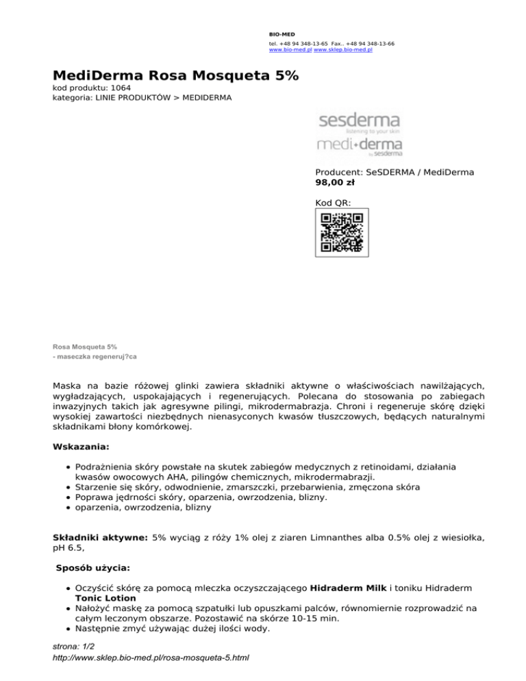 BIO-MED tel. +48 94 348-13-65 Fax.. +48 94 348-13-66 www.bio-med.pl www.sklep.bio-med.pl MediDerma Rosa Mosqueta 5% kod produktu: 1064 kategoria: LINIE PRODUKTÓW > MEDIDERMA Producent: SeSDERMA / MediDerma 98,00 zł Kod QR: Rosa Mosqueta 5% - maseczka regeneruj?ca Maska na bazie różowej glinki zawiera składniki aktywne o właściwościach nawilżających, wygładzających, uspokajających i regenerujących. Polecana do stosowania po zabiegach inwazyjnych takich jak agresywne pilingi, mikrodermabrazja. Chroni i regeneruje skórę dzięki wysokiej zawartości niezbędnych nienasyconych kwasów tłuszczowych, będących naturalnymi składnikami błony komórkowej. Wskazania: Podrażnienia skóry powstałe na skutek zabiegów medycznych z retinoidami, działania kwasów owocowych AHA, pilingów chemicznych, mikrodermabrazji. Starzenie się skóry, odwodnienie, zmarszczki, przebarwienia, zmęczona skóra Poprawa jędrności skóry, oparzenia, owrzodzenia, blizny. oparzenia, owrzodzenia, blizny Składniki aktywne: 5% wyciąg z róży 1% olej z ziaren Limnanthes alba 0.5% olej z wiesiołka, pH 6.5, Sposób użycia: Oczyścić skórę za pomocą mleczka oczyszczającego Hidraderm Milk i toniku Hidraderm Tonic Lotion Nałożyć maskę za pomocą szpatułki lub opuszkami palców, równomiernie rozprowadzić na całym leczonym obszarze. Pozostawić na skórze 10-15 min. Następnie zmyć używając dużej ilości wody. strona: 1/2 http://www.sklep.bio-med.pl/rosa-mosqueta-5.html Nałożyć kilka kropel ampułek Rosa Masqueta na obszar skóry poddawany zabiegowi ( twarz, szyja, biust, uda) i wmasować opuszkami palców Nałożyć krem przeciwwsłoneczny Skład: Woda, Olejek różany ( Rosa Aff. Rubiginosa oil), Titanium dioxide, Kaolin, Propylene glycol, Glycerin, Meadow foam ( Limnanthes alba), olej z wiesiołka (Oenothera biennis), olej kukurydziany ( Zena Mays), alantoina, kwas linolenowy, kwas linolowy, octan tokoferylu, Carbomer, Farnesol, Poliakryamid, C 13-14 Isoparaffin, Polisorbat 20, PEG 300, PEG-4 dilaurate, Laureth-7, Iodopropynyl butylcarbamate, PEG 4, alkohol, Linalool,fenoksyetanol, Metylparaben, Etylparaben, Propylparaben Butylparaben Pojemność: 100 ml Opak. profesjonalne 100 ml. --------------------------------Właściwości chemiczne: Różowa glinka powstaje z połączenia białej i czerwonej. Posiada właściwości odkażające i wygładzające. Działa bardzo łagodnie dlatego polecana jest do suchej i wrażliwej skóry. Wyciąg z wiesiołka (Oenothera biennis) zwiększa stężenie kluczowych kwasów tłuszczowych – linolenowego i gama linolenowego, będących naturalnymi składnikami błon komórkowych i mających znaczenie w gojeniu i regeneracji skóry. Dodatkowo podtrzymują elastyczność komórek i chronią je przed szkodliwym działaniem wolnych rodników. Są prekursorami prostaglandyn PGEI ( działanie przeciwzapalne), wzmacniają ochronną barierę naskórkową, zapobiegają utracie wody. Normalizują również poziom ceramidów w skórze atopowej ( zwiększenie efektu nawilżenia). Suplementacja kluczowych kwasów tłuszczowych zapobiega wysuszaniu skóry i łuszczeniu, co jest charakterystycznym objawem niedoboru NNKT. Olejek różany ( Rosa Mosqueta) utrzymuje prawidłowy poziom nawilżenia skóry. Usprawnia naturalne mechanizmy ochronne skóry. Ma właściwości regenerujące. Poprawia wygląd i opóźnia proces starzenia ( zmniejsza zmarszczki, rozjaśnia, ujędrnia.) Olejek różany zawiera wysokie stężenie wielonienasyconych kwasów tłuszczowych (77% kwasu linolenowego), stanowi znakomitą terapię odbudowującą i regenerującą zniszczoną skórę ( rozstępy, blizny, oparzenia, owrzodzenia). Zawiera naturalną tretinoinę - pochodną wit. A, która opóźnia efekty starzenia. Przyspiesza odnowę komórkową, zwiększa poziom kolagenu i elastyny, ujędrniając i wygładzając w ten sposób skórę. Formuła tego preparatu daje natychmiastowy efekt upiększający, eliminując oznaki zmęczenia i przywracając skórze napięcie i blask. Olej z ziaren Meadow Foam (Limnanthes Alba), zawiera NNKT o długich łańcuchach (C 20 – 22) i niskie stężenie nasyconych kwasów tłuszczowych . NNKT zawierają dużą ilość podwójnych wiązań, co daje wysoką stabilność i odporność na oksydację. Stabilizuje również inne oleje. strona: 2/2 http://www.sklep.bio-med.pl/rosa-mosqueta-5.html