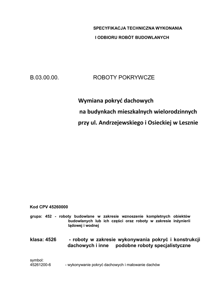 SPECYFIKACJA TECHNICZNA WYKONANIA I ODBIORU ROBÓT BUDOWLANYCH B.03.00.00. ROBOTY POKRYWCZE Wymiana pokryć dachowych na budynkach mieszkalnych wielorodzinnych przy ul. Andrzejewskiego i Osieckiej w Lesznie Kod CPV 45260000 grupa: 452 - roboty budowlane w zakresie wznoszenie kompletnych obiektów budowlanych lub ich części oraz roboty w zakresie inżynierii lądowej i wodnej klasa: 4526 symbol: 45261200-6 - roboty w zakresie wykonywania pokryć i konstrukcji dachowych i inne podobne roboty specjalistyczne - wykonywanie pokryć dachowych i malowanie dachów 45261210-9 45261213-0 - wykonywanie pokryć dachowych - kładzenie dachów metalowych 1. WSTĘP 1.1. Przedmiot SST Przedmiotem niniejszej standardowej specyfikacji technicznej (SST) są wymagania dotyczące wykonania i odbioru pokryć dachowych wraz z obróbkami blacharskimi. 1. 2 . Zastosowania SST Niniejsza szczegółowa specyfikacja techniczna (SST) jest częścią dokumentów przetargowych i kontraktowych przy zlecaniu i realizacji robót wymienionych w pkt. 1.1. 1.3. Zakres robót objętych SST Niniejsze warunki wykonania i odbioru robót odnoszą się jedynie do wymagań dotyczących pokryć dachowych - nie obejmują wymagań odnośnie do całości przykrycia dachowego w rozumieniu następujących definicji: - przekrycie dachowe - przegroda składająca się z elementów nośnych, izolacji termicznej i izolacji wodochronnej pełniąca rolę dachu zarówno pod względem konstrukcyjnym, jak i funkcjonalnym, W warunkach wykonania i odbioru robót związanych z pokryciami dachowymi jako zasadę przyjęto określanie wymagań w następującej kolejności: - wymagania związane z projektem, - wymagania dotyczące przyjmowania materiałów na budowę, wymagania dotyczące wykonywania pokryć, - kryteria odbioru. 1.4. Określenia podstawowe Określenia podane w niniejszej SST są zgodne z ustawą Prawo budowlane, wydanymi do niej rozporządzeniami wykonawczymi, nomenklaturą Polskich Norm, aprobat technicznych, a mianowicie : - pokrycie dachowe - wierzchnia, wodochronna warstwa dachu lub stropodachu, przymocowana do podłoża lub podkładu i odporna na działanie czynników atmosferycznych. - roboty budowlane przy wykonaniu pokryć dachowych - wszystkie prace budowlane związane z wykonaniem pokrycia dachu zgodnie z ustaleniami projektowymi, - Wykonawca - osoba lub organizacja wykonująca ww. roboty budowlane, - procedura - dokument zapewniający jakość, definiujący „jak, kiedy, gdzie i kto"? wykonuje i kontroluje poszczególne operacje robocze - procedura może być zastąpiona przez normy, aprobaty techniczne i instrukcje, - ustalenia projektowe - ustalenia podane w dokumentacji technicznej zawierające dane opisujące przedmiot i wymagania jakościowe wykonania okładzin. 1.5. Ogólne wymagania dotyczące robót Przy wykonywaniu pokryć dachowych należy przestrzegać zasad podanych w normie PN63/B10243 - Roboty pokrywcze dachówką cementową. Wymagania i badania przy odbiorze. Wykonawca robót jest odpowiedzialny za jakość ich wykonania oraz za ich zgodność z dokumentacją projektową, ST i poleceniami Inspektora nadzoru. Ogólne wymagania dotyczące wykonania i odbioru robót podano w ST B-00.00.00 „Wymagania ogólne" pkt 1.5. 2. MATERIAŁY Ogólne wymagania dotyczące materiałów, ich pozyskiwania i składowania podano w ST B00.00.00 „Wymagania ogólne" pkt 2. 2.1. Wymagania ogólne Materiały stosowane do wykonywania pokryć dachowych powinny mieć aprobaty techniczne lub powinny być produkowane zgodnie z obowiązującymi normami. Materiały stosowane do robót dekarskich do dnia uzyskania przez Polskę członkostwa w Unii Europejskiej powinny mieć certyfikat na znak bezpieczeństwa, certyfikat zgodności lub deklarację zgodności z aprobatą techniczną lub z Polską Normą. Z dniem uzyskania przez Polskę członkostwa w Unii Europejskiej wyroby dekarskie powinny: - mieć certyfikat zgodności ze zharmonizowaną normą europejską wprowadzoną do zbioru norm polskich, z europejską aprobatą techniczną lub krajową specyfikacją techniczną państwa członkowskiego uznaną za zgodną z wymaganiami podstawowymi, a następnie być oznaczone znakowaniem CE, - mieć deklarację zgodności z uznanymi regułami sztuki budowlanej wydaną przez producenta - w przypadku wyrobów podanych w wykazie Komisji Europejskiej mających niewielkie znaczenie dla zdrowia i bezpieczeństwa. Na opakowaniach materiałów stosowanych do wykonywania robót dekarskich powinien się znajdować termin przydatności do stosowania. Sposób transportu i składowania materiałów do robót dekarskich powinien być zgodny z wymaganiami producenta. Wykonawca obowiązany jest posiadać na budowie pełną dokumentację dotyczącą składowanych na budowie materiałów przeznaczonych do wykonywania robót dekarskich. 2.2. Przyjęcie materiałów na budowie Podstawę przyjęcia wyrobów pokrywczych na budowę stanowią: projekt techniczny, - dokumenty od producenta, - sprawdzenie oznaczenia wyrobów, - sprawdzenie zgodności wybranych właściwości wyrobów z dokumentami. Projekt techniczny powinien zawierać charakterystykę wyrobów przeznaczonych do wykonania pokrycia. Na budowę mogą być przyjęte jedynie wyroby wymienione w projekcie lub wyroby zastępcze według specjalnej dokumentacji dotyczącej odstępstw od projektu. Niedopuszczalne jest stosowanie wyrobów nieznanego pochodzenia. Producent jest zobowiązany dostarczyć dla każdego wyrobu certyfikat na znak bezpieczeństwa, certyfikat zgodności z dokumentem odniesienia lub deklarację zgodności dla partii wyrobu oraz kartę katalogową wyrobu lub firmowe wytyczne stosowania wyrobu. Kontrolne badania właściwości wyrobów pokrywczych należy przeprowadzać zgodnie z wymaganiami norm dotyczącymi wyrobu lub innych dokumentów odniesienia, typu „aprobata techniczna". Wyroby pokrywcze mogą być przyjęte na budowę, jeśli spełniają następujące warunki: - odpowiadają wyrobom