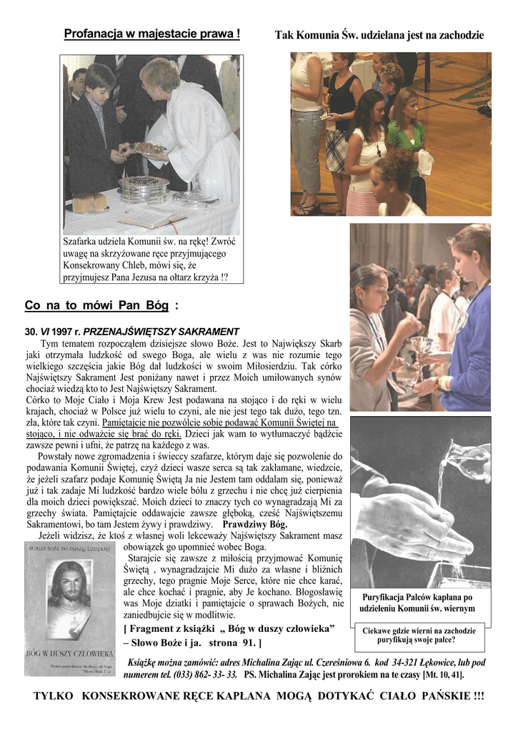 Profanacja w majestacie prawa ! Tak Komunia Św. udzielana jest na zachodzie Szafarka udziela Komunii św. na rękę! Zwróć uwagę na skrzyżowane ręce przyjmującego Konsekrowany Chleb, mówi się, że przyjmujesz Pana Jezusa na ołtarz krzyża !? Co na to mówi Pan Bóg : 30. VI 1997 r. PRZENAJŚWIĘTSZY SAKRAMENT Tym tematem rozpocząłem dzisiejsze słowo Boże. Jest to Największy Skarb jaki otrzymała ludzkość od swego Boga, ale wielu z was nie rozumie tego wielkiego szczęścia jakie Bóg dał ludzkości w swoim Miłosierdziu. Tak córko Najświętszy Sakrament Jest poniżany nawet i przez Moich umiłowanych synów chociaż wiedzą kto to Jest Najświętszy Sakrament. Córko to Moje Ciało i Moja Krew Jest podawana na stojąco i do ręki w wielu krajach, chociaż w Polsce już wielu to czyni, ale nie jest tego tak dużo, tego tzn. zła, które tak czyni. Pamiętajcie nie pozwólcie sobie podawać Komunii Świętej na stojąco, i nie odważcie się brać do ręki. Dzieci jak wam to wytłumaczyć bądźcie zawsze pewni i ufni, że patrzę na każdego z was. Powstały nowe zgromadzenia i świeccy szafarze, którym daje się pozwolenie do podawania Komunii Świętej, czyż dzieci wasze serca są tak zakłamane, wiedzcie, że jeżeli szafarz podaje Komunię Świętą Ja nie Jestem tam oddalam się, ponieważ już i tak zadaje Mi ludzkość bardzo wiele bólu z grzechu i nie chcę już cierpienia dla moich dzieci powiększać. Moich dzieci to znaczy tych co wynagradzają Mi za grzechy świata. Pamiętajcie oddawajcie zawsze głęboką, cześć Najświętszemu Sakramentowi, bo tam Jestem żywy i prawdziwy. Prawdziwy Bóg. Jeżeli widzisz, że ktoś z własnej woli lekceważy Najświętszy Sakrament masz obowiązek go upomnieć wobec Boga. Starajcie się zawsze z miłością przyjmować Komunię Świętą , wynagradzajcie Mi dużo za własne i bliźnich grzechy, tego pragnie Moje Serce, które nie chce karać, ale chce kochać i pragnie, aby Je kochano. Błogosławię was Moje dziatki i pamiętajcie o sprawach Bożych, nie zaniedbujcie się w modlitwie. [ Fragment z książki „ Bóg w duszy człowieka” – Słowo Boże i ja. strona 91. ] Puryfikacja Palców kapłana po udzieleniu Komunii św. wiernym Ciekawe gdzie wierni na zachodzie puryfikują swoje palce? Książkę można zamówić: adres Michalina Zając ul. Czereśniowa 6. kod 34-321 Łękowice, lub pod numerem tel. (033) 862- 33- 33. PS. Michalina Zając jest prorokiem na te czasy [Mt. 10, 41]. TYLKO KONSEKROWANE RĘCE KAPŁANA MOGĄ DOTYKAĆ CIAŁO PAŃSKIE !!!