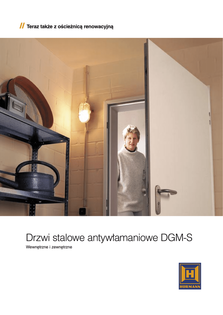 // Teraz tak˝e z oÊcie˝nicà renowacyjnà Drzwi stalowe antyw∏amaniowe DGM-S Wewn´trzne i zewn´trzne Drzwi stalowe antyw∆amaniowe DGM-S Poczujesz si™ bezpieczniej Drzwi są często usytuowane w miejscach, w których włamywacz czuje się niewidoczny. A gdy jeszcze łatwo jest takie drzwi pokonać, wówczas złodziej błyskawicznie osiągnie swój cel. Niestety problem ten dotyczy jeszcze wielu drzwi. Spowodowane jest to pozornymi oszczędnościami - i to w obliczu rosnącej ilości przestępstw. Zabezpiecz swój dom stalowymi drzwiami antywłamaniowymi DGM-S Hörmann’a. Nasze nowe stalowe drzwi zostały sprawdzone pod kątem zgodności z Normą Europejską (WK2 według V ENV 1627 po stronie przeciwpożarowej i po stronie bez zawiasów), oraz wymaganiami Aprobaty Technicznej COBR “Metalplast” o Numerze AT-06-0366/2000 dla drzwi w klasie A i są wyposażone w wielopunktowe ryglowanie. Niezwykle wytrzymała płyta drzwiowa Ocieplana, o grubości 40 mm, z trójstronną grubą przylgą. Blacha stalowa z obydwu stron płyty drzwiowej (grubość blachy 0,8 mm), rama wzmacniająca i klejony na całej powierzchni wkład z wełny mineralnej. Na dolnej krawędzi zamontowano podwójną uszczelkę wargową z aluminiowym półokrągłym progiem. wełna mineralna klej stal warstwa cynku farba proszkowa Gotowy do montażu zestaw z ościeżnicą Specjalna ościeżnica kątowa, grubość 1,5 mm, z trójstronną dźwiękoszczelną uszczelką z EPDM i progiem nabiegowym (załączony luzem). Łatwy montaż dzięki przyspawanym kotwom do zamurowania lub pod kołki rozporowe. Atrakcyjny wygląd i zabezpieczenie przed korozją Płyta drzwiowa i ościeżnica z cynkowanej stali, pokrytej wysokiej jakości farbą gruntującą (farba proszkowa) w kolorze białym (na bazie RAL 9016). Ościeżnica renowacyjna ułatwiająca wymianę drzwi Ościeżnica kątowa spawana, grubość 1,5 mm, trójstronna uszczelka z EPDM, próg nabiegowy bez elementu wpuszczanego w posadzkę, przygotowany pod montaż przy pomocy kołków rozporowych. Ç ¤ O NOW Bezpieczne wielopunktowe ryglowanie Zamek wpuszczany pod klamkę z gałką, zgodny z DIN 18250, z dwoma dodatkowymi ryglami stalowymi, tworzy system wielopunktowego ryglowania. Okucia (klamka z gałką) z zabezpieczeniem przed wyrwaniem Komplet okuć antywłamaniowych (klamki łożyskowane) zgodnych z DIN 18527, z podłużnym szyldem (klasa ES 1). Aluminium eloksalowane w kolorze naturalnym (F1). Na życzenie: polerowana stal nierdzewna. Wkładka bębenkowa odporna na rozwiercenie Wkładka zgodna z DIN 18524, PZ-2-BS z trzema kluczami i kartą bezpieczeństwa do klucza zapasowego. Łożyskowane zawiasy Trzyczęściowe, cynkowane i wyjątkowo wytrzymałe gwarantują swobodne otwieranie i zamykanie drzwi. 2 masywne trzpienie antywłamaniowe Po stronie zawiasów 2 trzpienie stalowe uniemożliwiające wyważenie drzwi. Uszczelka obwiedniowa Uszczelki zamontowane na płycie drzwiowej i ościeżnicy stanowią doskonałą ochronę przed kurzem i warunkami atmosferycznymi. Izolacja akustyczna i cieplna Drzwi antywłamaniowe DGM-S chronią dodatkowo przed hałasem i zimnem: Współczynnik izolacji akustycznej: w przypadku opadającej uszczelki podłogowej Rw ok. 32 dB, Współczynnik izolacji cieplnej: k = 1,2 W/m2K. Gotowy do montażu zestaw drzwiowy z ościeżnicą kątową, na życzenie z ościeżnicą obejmującą. Stabilny kształt, wypaczenie nie możliwe Drzwi DGM-S spełniają wysokie wymagania klasy klimatycznej III (grupa obciążeniowa S), oraz są kontrolowane według RAL-RG 426. wysokość otworu w świetle wysokość zestawcza BR wysokość przejścia w świetle LDM Wymiary drzwi i dane monta†owe Poziom posadzki Poziom posadzki Ościeżnica kątowa z kotwami do zamurowania lub pod kołki rozporowe szerokość otworu w świetle szerokość zestawcza szerokość przejścia w świetle* * Przy kącie rozwarcia równym 90° szerokość przejścia w świetle zmniejsza się o 15 mm, bez uwzględnienia uchwytów i klamek. Ościeżnica obejmująca z kotwami do zamurowania lub pod kołki rozporowe Zakres wielkości Wymiary zestawcze szerokość 625 - 1125 mm wysokość 1750 - 2125 mm W zamówieniu proszę podać typ mocowania: lewe wg DIN prawe wg DIN Wymiary znormowane Wymiary zamówieniowe Wymiary zestawcze BR szerokość x wysokość 750 x 2000 750 x 2125 764 x 2032 864 x 2032 875 x 1875 875 x 2000 875 x 2125 964 x 2032 1000 x 1875 1000 x 2000 1000 x 2125 1064 x 2032 Wymiary otworu w świetle szerokość x wysokość 760 x 2005 760 x 2130 774 x 2037 874 x 2037 885 x 1880 885 x 2005 885 x 2130 974 x 2037 1010 x 1880 1010 x 2005 1010 x 2130 1074 x 2037 Wymiary przejścia w świetle LDM szerokość x wysokość 686 x 1968 686 x 2093 700 x 2000 800 x 2000 811 x 1843 811 x 1968 811 x 2093 900 x 2000 936 x 1843 936 x 1968 936 x 2093 1000 x 2000 Opis projektowy Drzwi stalowe antyw∆amaniowe DGM-S Model Stalowe drzwi antywłamaniowe Nazwa drzwi jednoskrzydłowe DGM-S Badanie • antywłamaniowe zgodnie z DIN V ENV 1627 (Klasa WK2) Dodatkowe funkcje • izolacja cieplna k = 1,2 W/m2K • izolacja akustyczna DIN 52210 Rw ca. 32 dB (w przypadku opadającej uszczelki podłogowej) Wymiary Wymiary zestawcze (zamówieniowe): szerokość: 625 - 1125 mm wysokość: 1750 - 2125 mm BR szerokość ___________ mm BR wysokość ___________ mm Typ mocowania ° lewe wg DIN ° prawe wg DIN Płyta drzwiowa Ocieplana, z trójstronną przylgą. Izolacja: wkład z wełny mineralnej (na życzenie płyta wiórowa otworowana lub pełna) Wzmocnienie: rama stalowa, rama drewniana Grubość płyty drzwiowej: 40 mm Grubość blachy: 0,8 mm Dolna krawędź: podwójna uszczelka wargowa • drzwi pełne (gruba przylga) Tekst przykładowy Na podstawie danych technicznych zestawić wg potrzeb i wypełnić. Ościeżnice Typ montażu • specjalna ościeżnica kątowa, spawana, grub. 1,5 mm, trójstronna uszczelka z EPDM, przyspawane kotwy do zamurowania lub pod kołki rozporowe, próg nabiegowy (luzem); °