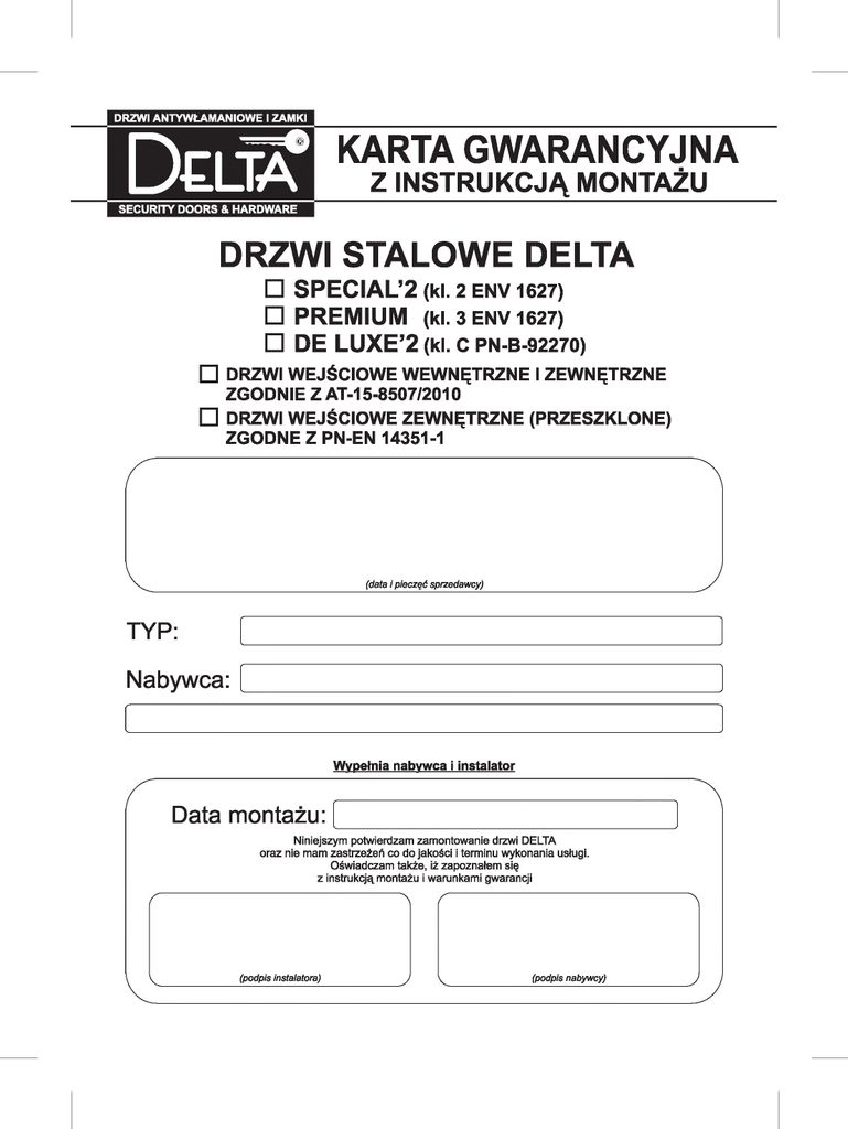 KARTA GWARANCYJNA Z INSTRUKCJĄ MONTAŻU DRZWI STALOWE DELTA □ SPECIAL’2 (kl. 2 EN V 1627) □ PREMIUM (kl. 3 E N V 1 6 2 7 ) □ DE LUXE’2 (kl. C PN-B-92270) □ DRZWI WEJŚCIOWE WEWNĘTRZNE I ZEWNĘTRZNE ZGODNIE Z AT-15-8507/2010 □ DRZWI WEJŚCIOWE ZEWNĘTRZNE (PRZESZKLONE) ZGODNE Z PN-EN 14351-1 WARUNKI GWARANCJI 1. Producent udziela 24 miesięcznej gwarancji od daty sprzedaży, na drzwi prawidłowo zamontowane przez autoryzowanego instalatora partnera handlowego. W przypadku sprzedaży drzwi DELTA bez montażu gwarancja wynosi 12 miesięcy. 2. Gwarancją objęte są drzwi wraz z mechanizmami umożliwiającymi ich zamknięcie oraz okucia i akcesoria dystrybuowane przez Producenta, wyszczególnione na rachunku lub fakturze. 3. Wady lub uszkodzenia wyrobu ujawnione w okresie gwarancji będą usuwane, po uprzednim złożeniu pisemnego zgłoszenia reklamacyjnego, w terminie możliwie najszybszym, jednak nie dłużej jak 20 dni roboczych, wyłącznie gdy były sprzedawane z usługą montażu. W przypadku sprzedaży towaru bez montażu, wymianie gwarancyjnej podlegają elementy składowe drzwi, po dostarczeniu ich (na koszt Kupującego) do miejsca zakupu towaru, bądź bezpośrednio do siedziby Producenta. 4. Reklamacje na wady jawne drzwi (rysy, wgniecenia, przebarwienia, różnice w odcieniach i skazy widoczne gołym okiem) należy składać w momencie rozpakowania towaru jeszcze przed montażem. Po zamontowaniu towaru reklamacje na wady jawne nie będą rozpatrywane. 5. Gwarancji nie podlegają uszkodzenia powstałe wskutek: - uszkodzeń mechanicznych powstałych po sprzedaży lub po zamontowaniu drzwi jak również podczas własnego transportu i składowania - usiłowania sforsowania drzwi przy użyciu siły i narzędzi - wystąpienia zdarzeń losowych (powódź, pożar, wybuch itp.) - samowolnych napraw lub zmian konstrukcyjnych 6. Podstawą do przyjęcia reklamacji jest posiadanie przedmiotowej karty gwarancyjnej z pieczątką salonu sprzedaży (lub instalatora) r faktury montażu bądź zakupu drzwi. 7. Przed przystąpieniem do montażu należy porównać otwory w ościeżnicy do wypuszczonych rygli skrzydła drzwiowego. Producent dopuszcza możliwość korygowania otworów w ościeżnicy poprzez ich podpiłowanie. W przypadku stwierdzenia przez Kupującego niezgodności towaru z zawartą umową wymagane jest, pod groźbą utraty gwarancji, aby reklamowany towar został starannie zapakowany w oryginalny karton, bądź inny karton zastępczy gwarantujący, że w trakcie prawidłowego transportowania do Producenta, towar nie ulegnie uszkodzeniom mechanicznym. g. UWAGA! Ścieranie się powłoki progu na skutek naturalnego użytkowania, nie podlega reklamacji. 9. Drzwi o zwiększonej odporności na włamanie winny mieć okucia zgodne z ENV 1627 lub PN-B-92270. Zamontowanie przeszkleń (nie montuje się w drzwiach De Luxe’2) powoduje utratę atestu antywłamaniowego. 10. Udzielona gwarancja nie wyłącza, nie ogranicza i nic zawiesza uprawnień kiupująceg wynikającego z niezgodności towaru z umową. UWAGI EKSPLOATACYJNE 1. Zabrania się, pod groźbą utraty gwarancji, smarowania zamka, a w szczególności wstrzykiwania substancji oleistych do otworu kluczowego - może to grozić trudnością otwarcia zamka. 2. Skrzydła drzwi pokiyte folią PVC należy myć delikatnie gąbką z czystą wodą. Przy silnym zabrudzeniu można użyć mydła lub alkoholu i miękkiej szczoteczki, następnie dobrze spłukać wodą i wytrzeć. Nie używać proszków i rozpuszczalników !!! 3. Okucia metalowe drzwi (klamki, szyldy, zawiasy, listwy czołowe zamków, itp.) należy regularnie czyścić mleczkiem typu „CIF" przynajmniej dwa razy do roku. W przypadku montażu na zewnątrz budynku wszystkie okucia metalowe muszą być dodatkowo pielęgnowane substancją natłuszczającą typu „wazelina techniczna" co najmniej dwa razy w roku, najlepiej na wiosnę i na jesień. Okucia drzwi zamontowanych w budynkach będących w fezie budowy lub remontu muszą być bezwzględnie osłonięte przed działaniem materiałów budowlanych, np. gips, wapno, cement, farby. 4. Montaż drzwi stalowych na ścianach zewnętrznych, nasłonecznionych bez zadaszenia osłaniającego drzwi przed nadmiernym nasłonecznieniem, może powodować czasowe naprężenia blachy stalowej oraz trudności w użytkowaniu. Utrudnienia te nie są uważane za wady towaru, gdyż jest to właściwość fizyczna blachy stalowej. W związku z tym faktem zaleca się zastosowanie zadaszenia nad drzwiami, a w przypadku montażu drzwi w kolorach ciemnych - jest to wymóg konieczny. 5. Regulacje zawiasów drzwi spowodowane ich niewłaściwą eksploatacją lub czynnikami niezależnymi od producenta lub sprzedawcy / instalatora nie będą uwzględniane i mogą być realizowane wyłącznie na koszt użytkownika. 6. Folia ochronna drzwi zewnętrznych powinna być zdarta ze skrzydła do 1 miesiąca czasu od montażu. W przypadku pozostawienia jej na skrzydle dłużej, pod wpływem warunków atmosferycznych może dochodzić do wtopienia się jej w powłokę właściwą drzwi, co uniemożliwi jej całkowite usunięcie. 7. W drzwiach montowanych na zewnątrz budynków zalecane jest zastosowanie dodatkowej uszczelki samoprzylepnej na ościeżnicy - zgodnie z instrukcją montażu. UTRATA GWARANCJI | Bezpowrotna utrata gwarancji następuje po: 1. Usiłowaniu napraw we własnym zakresie lub przez osoby nieuprawnione. 2. Dokonaniu samodzielnych przeróbek - np. nawiercanie konstrukcji itp. lub dokonaniu innych uszkodzeń mechanicznych np. skracanie drzwi powyżej dopuszczalnych wymiarów zawartych w instrukcji. 3. Uszkodzeniu mechanicznym towaru, powstałym na skutek niewłaściwego użytkowania. 4. Ujawnieniu rażących odstępstw od instrukcji montażu. 5. Zagubieniu niniejszej karty gwarancyjnej. NAPRAWY GWARANCYJNE D ATA O P IS W Y K O N A N E J N A P R A W Y 2 DELTA SPECIAL'2, PREMIUM, DE LUXE’2 N A Z W IS K O S E R W IS A N T A L U B N A Z W A F IR M