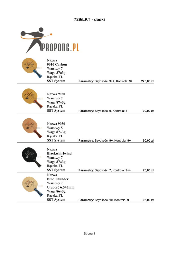 729/LKT - deski Nazwa 9010 Carbon Warstwy 7 Waga 87±3g Rączka FL SST System Parametry: Szybkość: 9++, Kontrola: 9+ Nazwa 9020 Warstwy 7 Waga 87±3g Rączka FL SST System Parametry: Szybkość: 9, Kontrola: 8 90,00 zł Nazwa 9030 Warstwy 5 Waga 87±3g Rączka FL SST System Parametry: Szybkość: 9+, Kontrola: 9+ 90,00 zł Parametry: Szybkość: 7, Kontrola: 9++ 75,00 zł Parametry: Szybkość: 10, Kontrola: 9 95,00 zł Nazwa Blackwhirlwind Warstwy 7 Waga 87±3g Rączka FL SST System Nazwa Blue Thunder Warstwy 7 Grubość 6.5±3mm Waga 86±3g Rączka FL SST System Strona 1 220,00 zł 729/LKT - deski Nazwa Zebra Warstwy 7 Grubość 6.7±2mm Waga 82±3g Rączka FL SST System Parametry: Szybkość: 9+, Kontrola: 10 160,00 zł Nazwa Puma Warstwy 7 Grubość 6.2±2mm Waga 85±3g Rączka FL SST System Parametry: Szybkość: 7++, Kontrola: 9 80,00 zł Nazwa Red Spirit Warstwy 7 Waga 88±3g Rączka FL Parametry: Szybkość: 7+, Kontrola: 9 80,00 zł Nazwa Blackwhirlwind Warstwy 5 Waga 88±3g Rączka FL Parametry: Szybkość: 7, Kontrola: 9+++ 80,00 zł Nazwa 8010 Carbon Warstwy 7 Waga 90±3g Rączka FL Parametry: Szybkość: 9-, Kontrola: 9 130,00 zł Nazwa 8030 Carbon Warstwy 5 Waga 88±3g Rączka FL Parametry: Szybkość: 9, Kontrola: 9++ 130,00 zł Strona 2 729/LKT - deski Nazwa 8040 Carbon Warstwy 7 Waga 88±3g Rączka FL Parametry: Szybkość: FH 9+/BH 9 Kontrola: FH 9/BH 9++ 130,00 zł Nazwa 8041 Carbon Warstwy 7 Waga 88±3g Rączka FL Parametry: Szybkość: 9++, Kontrola: 9- 130,00 zł Nazwa Bomb Warstwy 7 Grubość 6.5±0.2mm Waga 85±3g Rączka FL Parametry: Szybkość: 8++, Kontrola: 10 60,00 zł Nazwa Sensor Grip Warstwy 5 Grubość 6.3±0.2mm Waga 82±3g Rączka FL Parametry: Szybkość: 9, Kontrola: 9 70,00 zł Nazwa 6030 Warstwy 5 Grubość 6.2±0.2mm Waga 88±3g Rączka FL Parametry: Szybkość: 9, Kontrola: 9+ 70,00 zł Nazwa Hinoki Carbon Warstwy 7 Grubość 6.4±0.2mm Waga 85±3g Rączka FL Parametry: Szybkość: 9++, Kontrola: 9- Strona 3 150,00 zł 729/LKT - deski Nazwa Hinoki Warstwy 5 Grubość 6.3±0.2mm Waga 84±3g Rączka FL Parametry: Szybkość: 9, Kontrola: 9+ 140,00 zł Nazwa Super Carbon Warstwy 7 Grubość 6.4±0.2mm Waga 84±3g Rączka FL Parametry: Szybkość: 9++, Kontrola: 8+ 140,00 zł Nazwa Two Speed Carbon Warstwy 6 Grubość 6.3±0.2mm Waga 84±3g Rączka FL Parametry: Szybkość: 9++, Kontrola: 8+ Nazwa Hao Shuai Champion Carbon Warstwy 5 Grubość 6.3±0.2mm Waga 84±3g Rączka FL Parametry: Szybkość: 10, Kontrola: 9 Nazwa Pro XF Warstwy 5 Grubość 6.9±0.3mm Waga 85±3g Rączka FL SST System Parametry: Szybkość: 9+, Kontrola: 8 Strona 4 135,00 zł 170,00 zł 65,00 zł 729/LKT - deski Nazwa Pro XC Warstwy 5 Grubość 6.6±0.3mm Waga 84±3g Rączka FL SST System Parametry: Szybkość: 7++, Kontrola: 9 65,00 zł Nazwa Lord of the Speed Warstwy 7 Grubość 6.9±0.3mm Waga 85±3g Rączka FL Parametry: Szybkość: 9++, Kontrola: 7- 75,00 zł Nazwa Lord of the Balance Warstwy 7 Grubość 6.7±0.3mm Waga 84±3g Rączka FL Parametry: Szybkość: 8++, Kontrola: 9- 70,00 zł Nazwa Lord of the Control Warstwy 7 Grubość 6.5±0.3mm Waga 85±3g Rączka FL Parametry: Szybkość: 7++, Kontrola: 9 65,00 zł Nazwa Mind Game Warstwy 5 Grubość 6.9±0.3mm Waga 83±3g Rączka FL Parametry: Szybkość: 9, Kontrola: 8 60,00 zł Nazwa Will Power Warstwy 7 Grubość 7.1±0.3mm Waga 83±3g Rączka FL Parametry: Szybkość: 9+, Kontrola: 8+ Strona 5 130,00 zł 729/LKT - deski Nazwa Instinct Warstwy 5 Grubość 6.5±0.3mm Waga 85±2g Rączka FL Parametry: maksymalna kontrola 50,00 zł Nazwa Instinct+ Warstwy 7 Grubość 6.7±0.3mm Waga 85±2g Parametry: maksymalna kontrola z elemenRączka FL tami ataku 50,00 zł Nazwa Toxic 3 Warstwy 3 Grubość 5.3±0.2mm Waga 84±2g Rączka FL Parametry: gra taktyczna 80,00 zł Nazwa Toxic 5 Warstwy 5 Grubość 6.3±0.2mm Waga 84±2g Rączka FL Parametry: agresywna gra taktyczna 80,00 zł Nazwa Ayous Hinoki Warstwy 5 Grubość 6.3±0.2mm Waga 84±2g Rączka FL Parametry: Szybkość: 9-, Kontrola: 9+ Nazwa Carbon King Warstwy 7 Grubość 6.8±0.2mm Waga 84±3g Rączka FL SST System Parametry: Szybkość: 10, Kontrola: 9 Strona 6 110,00 zł 110,00 zł 729/LKT - deski Nazwa LKT No.1 Warstwy 7 Grubość 6.8±0.2mm Waga 82±3g Rączka FL SST System Parametry: Szybkość: 9, Kontrola: 10 Strona 7 120,00 zł