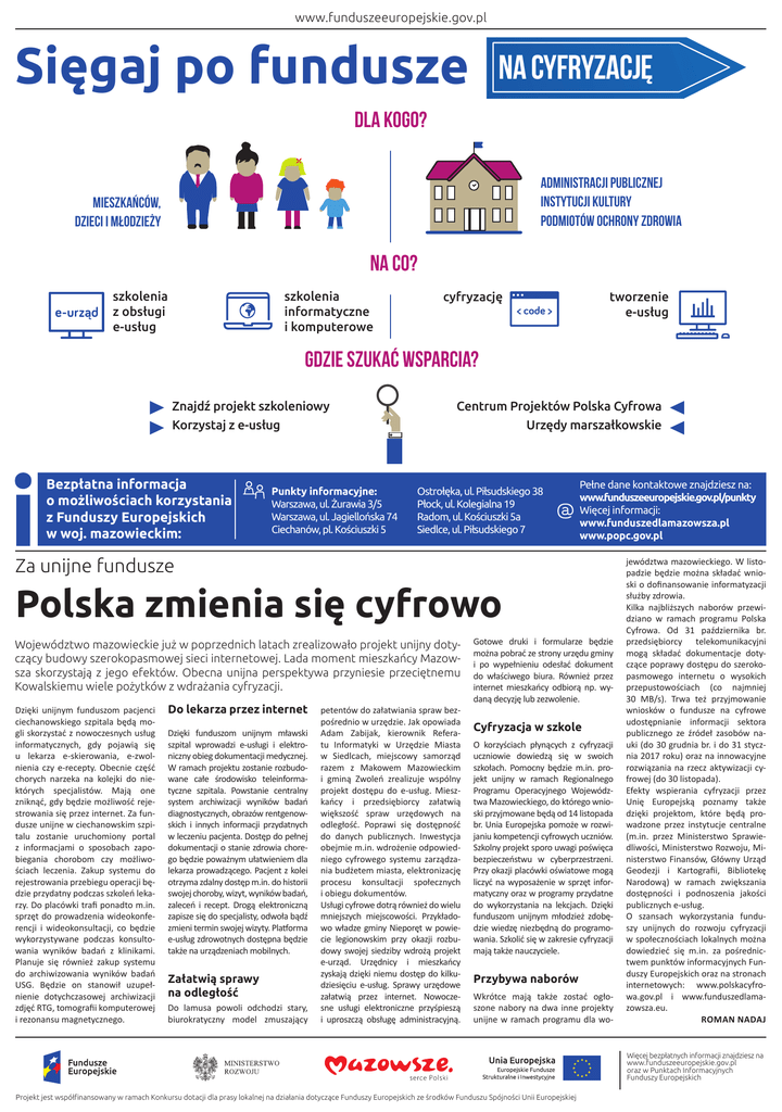 www.funduszeeuropejskie.gov.pl Sięgaj po fundusze na cyfryzację Dla kogo? administracji publicznej instytucji kultury podmiotów ochrony zdrowia Mieszkańców, dzieci i Młodzieży NA CO? szkolenia informatyczne i komputerowe szkolenia z obsługi e-usług cyfryzację tworzenie e-usług Gdzie szukać wsparcia? Znajdź projekt szkoleniowy Korzystaj z e-usług Bezpłatna informacja o możliwościach korzystania z Funduszy Europejskich w woj. mazowieckim: Punkty informacyjne: Warszawa, ul. Żurawia 3/5 Warszawa, ul. Jagiellońska 74 Ciechanów, pl. Kościuszki 5 Centrum Projektów Polska Cyfrowa Urzędy marszałkowskie Ostrołęka, ul. Piłsudskiego 38 Płock, ul. Kolegialna 19 Radom, ul. Kościuszki 5a Siedlce, ul. Piłsudskiego 7 Pełne dane kontaktowe znajdziesz na: www.funduszeeuropejskie.gov.pl/punkty Więcej informacji: www.funduszedlamazowsza.pl www.popc.gov.pl Za unijne fundusze Polska zmienia się cyfrowo Województwo mazowieckie już w poprzednich latach zrealizowało projekt unijny dotyczący budowy szerokopasmowej sieci internetowej. Lada moment mieszkańcy Mazowsza skorzystają z jego efektów. Obecna unijna perspektywa przyniesie przeciętnemu Kowalskiemu wiele pożytków z wdrażania cyfryzacji. Dzięki unijnym funduszom pacjenci ciechanowskiego szpitala będą mogli skorzystać z nowoczesnych usług informatycznych, gdy pojawią się u lekarza e-skierowania, e-zwolnienia czy e-recepty. Obecnie część chorych narzeka na kolejki do niektórych specjalistów. Mają one zniknąć, gdy będzie możliwość rejestrowania się przez internet. Za fundusze unijne w ciechanowskim szpitalu zostanie uruchomiony portal z informacjami o sposobach zapobiegania chorobom czy możliwościach leczenia. Zakup systemu do rejestrowania przebiegu operacji będzie przydatny podczas szkoleń lekarzy. Do placówki trafi ponadto m.in. sprzęt do prowadzenia wideokonferencji i wideokonsultacji, co będzie wykorzystywane podczas konsultowania wyników badań z klinikami. Planuje się również zakup systemu do archiwizowania wyników badań USG. Będzie on stanowił uzupełnienie dotychczasowej archiwizacji zdjęć RTG, tomografii komputerowej i rezonansu magnetycznego. Do lekarza przez internet Dzięki funduszom unijnym mławski szpital wprowadzi e-usługi i elektroniczny obieg dokumentacji medycznej. W ramach projektu zostanie rozbudowane całe środowisko teleinformatyczne szpitala. Powstanie centralny system archiwizacji wyników badań diagnostycznych, obrazów rentgenowskich i innych informacji przydatnych w leczeniu pacjenta. Dostęp do pełnej dokumentacji o stanie zdrowia chorego będzie poważnym ułatwieniem dla lekarza prowadzącego. Pacjent z kolei otrzyma zdalny dostęp m.in. do historii swojej choroby, wizyt, wyników badań, zaleceń i recept. Drogą elektroniczną zapisze się do specjalisty, odwoła bądź zmieni termin swojej wizyty. Platforma e-usług zdrowotnych dostępna będzie także na urządzeniach mobilnych. Załatwią sprawy na odległość Do lamusa powoli odchodzi stary, biurokratyczny model zmuszający petentów do załatwiania spraw bezpośrednio w urzędzie. Jak opowiada Adam Zabijak, kierownik Referatu Informatyki w Urzędzie Miasta w Siedlcach, miejscowy samorząd razem z Makowem Mazowieckim i gminą Zwoleń zrealizuje wspólny projekt dostępu do e-usług. Mieszkańcy i przedsiębiorcy załatwią większość spraw urzędowych na odległość. Poprawi się dostępność do danych publicznych. Inwestycja obejmie m.in. wdrożenie odpowiedniego cyfrowego systemu zarządzania budżetem miasta, elektronizację procesu konsultacji społecznych i obiegu dokumentów. Usługi cyfrowe dotrą również do wielu mniejszych miejscowości. Przykładowo władze gminy Nieporęt w powiecie legionowskim przy okazji rozbudowy swojej siedziby wdrożą projekt e-urząd. Urzędnicy i mieszkańcy zyskają dzięki niemu dostęp do kilkudziesięciu e-usług. Sprawy urzędowe załatwią przez internet. Nowoczesne usługi elektroniczne przyśpieszą i uproszczą obsługę administracyjną. Gotowe druki i formularze będzie można pobrać ze strony urzędu gminy i po wypełnieniu odesłać dokument do właściwego biura. Również przez internet mieszkańcy odbiorą np. wydaną decyzję lub zezwolenie. Cyfryzacja w szkole O korzyściach płynących z cyfryzacji uczniowie dowiedzą się w swoich szkołach. Pomocny będzie m.in. projekt unijny w ramach Regionalnego Programu Operacyjnego Województwa Mazowieckiego, do którego wnioski przyjmowane będą od 14 listopada br. Unia Europejska pomoże w rozwijaniu kompetencji cyfrowych uczniów. Szkolny projekt sporo uwagi poświęca bezpieczeństwu w cyberprzestrzeni. Przy okazji placówki oświatowe mogą liczyć na wyposażenie w sprzęt informatyczny oraz w programy przydatne do wykorzystania na lekcjach. Dzięki funduszom unijnym młodzież zdobędzie wiedzę niezbędną do programowania. Szkolić się w zakresie cyfryzacji mają także nauczyciele. Przybywa naborów Wkrótce mają także zostać ogłoszone nabory na dwa inne projekty unijne w ramach programu dla wo- jewództwa mazowieckiego. W listopadzie będzie można składać wnioski o dofinansowanie informatyzacji służby zdrowia. Kilka najbliższych naborów przewidziano w ramach programu Polska Cyfrowa. Od 31 października br. przedsiębiorcy telekomunikacyjni mogą składać dokumentacje dotyczące poprawy dostępu do szerokopasmowego internetu o wysokich przepustowościach (co najmniej 30 MB/s). Trwa też przyjmowanie wniosków o fundusze na cyfrowe udostępnianie informacji sektora publicznego ze źródeł zasobów nauki (do 30 grudnia br. i do 31 stycznia 2017 roku) oraz na innowacyjne rozwiązania na rzecz aktywizacji cyfrowej (do 30 listopada). Efekty wspierania cyfryzacji przez Unię Europejską poznamy także dzięki projektom, które będą prowadzone przez instytucje centralne (m.in. przez Ministerstwo Sprawiedliwości, Ministerstwo Rozwoju, Ministerstwo Finansów, Główny Ur