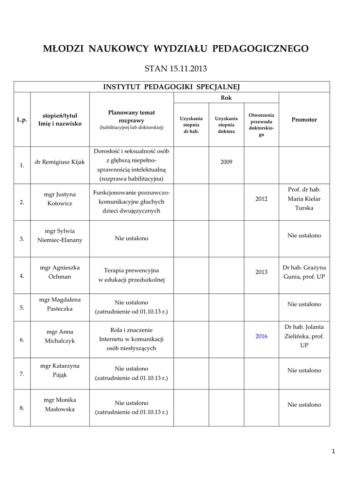 MŁODZI NAUKOWCY WYDZIAŁU PEDAGOGICZNEGO STAN 15.11.2013 INSTYTUT PEDAGOGIKI SPECJALNEJ Rok L.p. stopień/tytuł Imię i nazwisko Planowany temat rozprawy (habilitacyjnej lub doktorskiej) Uzyskania stopnia dr hab. Uzyskania stopnia doktora Otworzenia przewodu doktorskiego Promotor Dorosłość i seksualność osób 1. dr Remigiusz Kijak z głębszą niepełno- 2009 sprawnością intelektualną (rozprawa habilitacyjna) 2. mgr Justyna Funkcjonowanie poznawczo- Kotowicz komunikacyjne głuchych Prof. dr hab. 2012 Turska dzieci dwujęzycznych mgr Sylwia 3. Niemiec-Elanany mgr Agnieszka 4. Ochman mgr Magdalena 5. 6. mgr Anna Rola i znaczenie Michalczyk Internetu w komunikacji mgr Monika 8. Nie ustalono (zatrudnienie od 01.10.13 r.) Pająk Masłowska 2013 w edukacji przedszkolnej Pasteczka mgr Katarzyna 7. Nie ustalono Nie ustalono Terapia prewencyjna Maria Kielar Dr hab. Grażyna Gunia, prof. UP Nie ustalono Dr hab. Jolanta 2016 Zielińska, prof. osób niesłyszących UP Nie ustalono Nie ustalono (zatrudnienie od 01.10.13 r.) Nie ustalono Nie ustalono (zatrudnienie od 01.10.13 r.) 1 INSTYTUT PEDAGOGIKI PRZEDSZKOLNEJ I SZKOLNEJ Rok L.p. Stopień/tytuł Imię i nazwisko Planowany temat rozprawy (habilitacyjnej lub doktorskiej) 1. mgr Joanna Szczyrba Kształtowanie umiejętności dydaktycznych studentów Uniwersytetu Pedagogicznego im. Komisji Edukacji Narodowej w Krakowie do nauczania muzyki w przedszkolu oraz klasach początkowych 2. mgr Rafał Fudala Nauczyciele wobec wyzwań wielokulturowości Uzyskania stopnia dr hab. Uzyskania stopnia doktora Otworzenia przewodu doktorskiego 2014 prof. dr hab. Bożena Muchacka 2014 nieustalony Edukacja kulturalna 3. mgr Aleksandra dorosłych i jej efekty na Litawa przykładzie amatorskich prof. zw. dr hab. 2014 dr hab. Proces cyfryzacji edukacji mgr Katarzyna Myśliwiec dr Katarzyna Slany 5. wczesnoszkolnej – szanse 2015 i zagrożenia Fantazmat w literaturze dla dzieci i młodzieży Tadeusz Aleksander zespołów chóralnych 4. Promotor Krzysztof Kraszewski prof. UP 2023 2013 Pedagogiczne uwarunkowania 6. mgr Monika Waligóra prawidłowej intonacji u dzieci w wieku 2015 prof. dr hab. Bożena Muchacka nie ustalono dr hab. Iwona Czaja-Chudyba, prof. UP przedszkolnym 7. mgr Aneta Wojnarowska Recepcja systemu pedagogicznego Marii Montessori w placówkach wychowania i edukacji małego dziecka (na terenie Polski). 2 lub Możliwości aplikacji wybranych elementów systemu pedagogicznego Marii Montessori w konwencjonalnych placówkach wychowania i edukacji małego dziecka 8. 9. dr Anna Włoch dr Justyna Wojniak Przemiany w szkolnictwie europejskim w kontekście zmian w polityce edukacyjnej Unii Europejskiej 2012 Rola kobiet w zarządzaniu amerykańskim systemem edukacji. 2010 INSTYTUT NAUK O WYCHOWANIU Rok L.p. stopień/tytuł Imię i nazwisko Planowany temat rozprawy (habilitacyjnej lub doktorskiej) 1. mgr Anna Kaczmarska Zasoby podmiotowe jako wyznacznik radzenia sobie z chorobą bliskiej osoby. Badanie osób wspierających chorych na nowotwór. 2. mgr Roman Solecki Cyberprzestrzeń środowiskiem aktywności pokolenia cyfrowego dr Łukasz Albański Międzyrasowe adopcje w Kanadzie i Stanach Zjednoczonych. Kulturowe i socjobiologiczne dyskursy na temat rasy, pokrewieństwa i dziedziczenia 3. Uzyskania stopnia dr hab. Uzyskania stopnia doktora 2015 2018 Otworzenia przewodu doktorskiego Promotor 2013 dr hab. prof. UP Helena WronaPolańska 2013 dr hab. prof. UP Barbara Kędzierska 2011 3 4. dr Łukasz Albański Międzyrasowe adopcje w Kanadzie i Stanach Zjednoczonych. Kulturowe i socjobiologiczne dyskursy na temat rasy, pokrewieństwa i dziedziczenia 5. mgr Patrycja Curyło-Sikora Radzenie sobie z tremą, a zdrowie młodzieży uzdolnionej muzycznie 6. mgr Anna Czekaj Szkoła środowiskiem kształtowania zrównoważonej jednostki dr Anna Bieniarz Poczucie osamotnienia u młodzieży akademickiej – analiza teoretyczna i empiryczna Versus: Fenomen opieki w psychologii, pedagogice i medycynie – analiza metateoretyczna 8. mgr Barbara Pietryga Wiedza o zdrowiu i poczucie koherencji jako wyznaczniki zachowań zdrowotnych młodzieży studiującej 9. dr Joanna WnękGozdek Dotyczyć będzie współczesnych przemian w edukacji (jakości kształcenia) 7. 2018 2011 2016 2016 dr hab. prof. UP Helena WronaPolańska 2014/ 2015 dr hab. prof. UP Barbara Kędzierska 2013 Prof. dr hab. Helena WronaPolańska 2012 2016 2018 2011 2012 4 INSTYTUT PRACY SOCJALNEJ Rok L.p. 1. 2. 3. 4. stopień/tytuł Imię i nazwisko dr Maciej Soliński dr Ewelina Zdebska mgr Katarzyna Białożyt mgr Tomasz Wardzała Planowany temat rozprawy (habilitacyjnej lub doktorskiej) Zastosowanie innowacyjnych metod przy aktywizacji społeczności lokalnej dzielnicy XI w Krakowie. Propozycje zmian oraz solucje. Usługi społeczne jako fundament wsparcia i aktywizacji osób starszych, chorych i niepełnosprawnych. Lokalna koalicja wsparcia na przykładzie miasta Krakowa (temat roboczy) Aktywność społeczna osób starszych a jakość ich życia Wychowanie do pracy osób niepełnosprawnych intelektualnie Uzyskania stopnia dr hab. Uzyskania stopnia doktora Otworzenia przewodu doktorskiego Promotor 2012 2013 2016 dr hab. Norbert Pikuła, prof. UP 2010 dr hab. Adam Solak, prof. UP 5 KATEDRA BEZPIECZEŃSTWA I EDUKACJI OBYWATELSKIEJ Rok stopień/tytuł Imię i nazwisko Planowany temat rozprawy Otworzenia przewodu doktorskiego (habilitacyjnej lub doktorskiej) Uzyskania stopnia dr hab. Uzyskania stopnia doktora dr Katarzyna Pabis Bezpieczeństwo kulturowe mniejszości etnicznych i narodowych w Polsce. 2019 2010 2. mgr Łukasz Czekaj Edukacja obywatelska w Polsce po 1989 roku na przykładzie Fundacji im. Stefana Batorego. 2014 2011 dr hab. Ireneusz Kawecki, prof. UP 3. mgr Magdalena Szumiec System awansu nauczycieli w kontekście ich rozwoju zawodowego. 2014 2010 prof. dr hab. Mirosław Szymański mgr Ewelina Biel Kreatywność nauczyciela czynnikiem sprzyjającym jakości procesu dydaktycznego. 2015 2011 dr hab. Barbara K