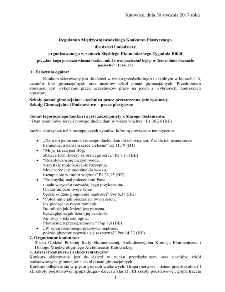 Katowice, dnia 30 stycznia 2017 roku Regulamin Międzywojewódzkiego Konkursu Plastycznego dla dzieci i młodzieży organizowanego w ramach Śląskiego Ekumenicznego Tygodnia Biblii pt. „Jak kogo pociesza własna matka, tak Ja was pocieszać będę; w Jerozolimie doznacie pociechy” (Iz 66,13) 1. Założenia ogólne: Konkurs skierowany jest do dzieci w wieku przedszkolnym i szkolnym w klasach 1-6, uczniów klas gimnazjalnych oraz uczniów szkół ponad gimnazjalnych. Przedmiotem konkursu jest wykonanie przez uczestników pracy na jeden z wybranych, poniższych tematów: Szkoły ponad gimnazjalne: - technika prace przestrzenna (nie rysunek): Szkoły Gimnazjalne i Podstawowe - prace plastyczne Temat tegorocznego konkursu jest zaczerpnięty z Starego Testamentu: “Dam wam nowe serce i nowego ducha dam w wasze wnętrze” Ez 36,26 (BE) można skorzystać też z następujących cytatów, które są powiązane tematycznie: „Dam im jedno serce i nowego ducha dam do ich wnętrza. Z ciała ich usunę serce kamienne, a dam im serce cielesne” Ez 11,19 (BT) “Moją tarczą jest Bóg, zbawca tych, którzy są prawego serca” Ps 7,11 (BE) “Rozpływam się niczym woda, wszystkie moje kości się rozsypują Moje serce jest podobne do wosku, roztapia się w moim wnętrzu” Ps 22,15 (BE) “Rozmyślaj nad poleceniami Pana i nade wszystko rozważaj Jego przykazania. On zaś umocni twoje serce będzie ci dane pragnienie mądrości” Syr 6,37 (BE) “Połóż mnie jak pieczęć na twym sercu, jak pieczęć na twym ramieniu. Bo miłość jak śmierć jest potężna, bezwzględna jak Szeol jej zazdrość. Jej iskry – iskrami ognia, Płomieniem przeogromnym.” Pnp 8,6 (BE) „W sercu rozumnego przebywa mądrość, pośród głupców pozwala się rozpoznać” Prz 14,33 (BE) 2. Organizator konkursu: Śląski Oddział Polskiej Rady Ekumenicznej, Archidiecezjalna Komisja Ekumeniczna i Dialogu Międzyreligijnego Archidiecezji Katowickiej 3. Adresat konkursu i zakres tematyczny: Konkurs skierowany jest do dzieci w wieku przedszkolnym oraz uczniów szkół podstawowych, gimnazjów i szkół ponad gimnazjalnych. Konkurs odbędzie się w pięciu grupach wiekowych: Grupa pierwsza - dzieci przedszkolne i I kl. szkoły podstawowej; grupa druga - dzieci z klas II i III szkoły podstawowej; grupa trzecia 1 – dzieci z klas od IV do VI szkoły podstawowej, grupa czwarta - klasy gimnazjalne, grupa piąta młodzież ponad gimnazjalna. Wg założeń organizatorów prace, które będą nagrodzone w konkursie będą wykorzystywane jako materiał edukacyjny dla młodzieży szkolnej na lekcjach religii. 4. Cel Konkursu - zachęcanie do lektury Pisma Świętego - nawiązanie do tradycji związanych ze studiowaniem i dobrą znajomością ksiąg biblijnych Starego i Nowego Testamentu - kształtowanie i umacnianie wiary poprzez regularny kontakt ze Słowem Bożym - zachęcenie uczniów do aktywności intelektualnej i zaangażowania religijnego związanych z tą problematyką. 5. Warunki uczestnictwa w konkursie: ●konkurs skierowany jest do dzieci w wieku przedszkolnym, uczniów szkół podstawowych, gimnazjów oraz szkół ponad gimnazjalnych ● praca może być wykonana indywidualnie lub w zespole dwuosobowym ● do konkursu można zgłosić maksymalnie jedną pracę ● do konkursu mogą być zgłaszane wyłącznie prace nienaruszające praw autorskich osób trzecich, nigdzie poprzednio w wersji oryginalnej niepublikowane; korzystanie z treści autorstwa innych osób wymaga powołania się na materiał źródłowy. 6. Zasady przeprowadzenia konkursu: ● Praca powinna być wykonana w technice malarskiej – kredki, kredki świecowe, pastelowe; ● format: A-4 ● szkoły ponad gimnazjalne, technika wykonania pracy: praca przestrzenna (nie rysunek) 7. Sposób opisania prac konkursowych: ● praca powinna zawierać na odwrocie szczegółowe dane osobowe i adresowe zarówno uczestnika konkursu jak i opiekuna (katechety) i jednostki organizacyjnej (Parafii czy szkoły) (również dane meilowe) wraz ze zgodą na przetwarzanie danych osobowych. 8. Zasady oceny ● zgodność wykonanych prac z regulaminem, ● pomysłowość, ● wartość przekazu, ● czytelność przekazu, ● estetyka wykonania. 9. W konkursie przewidziano cenne nagrody i wyróżnienia w każdej grupie wiekowej 10. Terminy. Termin przekazania prac konkursowych - do dnia 12 marca 2017 r. na adres: Parafia Ewangelicko-Augsburska w Katowicach ul. Warszawska 18, PL 40-006 Katowice, tel./fax: 32 253 99 81, z dopiskiem: KONKURS Informacje o laureatach zostanie zamieszczona w formie elektronicznej w dniu 15.03.2017 r. na stronie internetowej www.katowice.luteranie.pl Prace nagrodzone i wyróżnione zostaną zaprezentowane podczas centralnego nabożeństwa ekumenicznego na rozpoczęcie Ekumenicznych Dni Biblii w dniu 19 marca 2017 roku o godz. 16.30 w katedrze ewangelickiej Zmartwychwstania Pańskiego w Katowicach ul. Warszawska 18 2 ..................................... .................................... ..................................... (miejscowość, data) ..................................... (imię, nazwisko, adres) Oświadczenie o wyrażeniu zgody na przetwarzanie danych osobowych oraz na publikację pracy Ja niżej podpisany/podpisana oświadczam, że wyrażam zgodę na przetwarzanie moich danych osobowych zgodnie z ustawą z dnia 29 sierpnia 1997r o ochronie danych osobowych ( Dz. U z 2002r. Nr. 101, poz.926), oraz na publikację pracy. ....................................... (podpis czytelny rodzica lub opiekuna) Metryczka Prosimy pisać czytelnie Metryczkę proszę przykleić do pracy ucznia na odwrocie Imię i nazwisko ucznia: …………………………………………………. Klasa: …………………………………………………. Dane dotyczące szkoły: …………………………………………………. …………………………………………………. …………………………………………