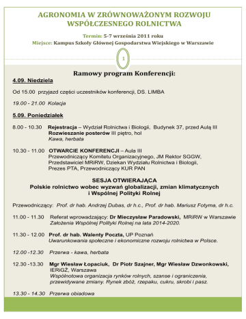 AGRONOMIA W ZRÓWNOWAŻONYM ROZWOJU WSPÓŁCZESNEGO ROLNICTWA Termin: 5-7 września 2011 roku Miejsce: Kampus Szkoły Głównej Gospodarstwa Wiejskiego w Warszawie 1 Ramowy program Konferencji: 4.09. Niedziela Od 15.00 przyjazd części uczestników konferencji, DS. LIMBA 19.00 - 21.00 Kolacja 5.09. Poniedziałek 8.00 - 10.30 Rejestracja – Wydział Rolnictwa i Biologii, Budynek 37, przed Aulą III Rozwieszanie posterów III piętro, hol Kawa, herbata 10.30 - 11.00 OTWARCIE KONFERENCJI – Aula III Przewodniczący Komitetu Organizacyjnego, JM Rektor SGGW, Przedstawiciel MRiRW, Dziekan Wydziału Rolnictwa i Biologii, Prezes PTA, Przewodniczący KUR PAN SESJA OTWIERAJĄCA Polskie rolnictwo wobec wyzwań globalizacji, zmian klimatycznych i Wspólnej Polityki Rolnej Przewodniczący: Prof. dr hab. Andrzej Dubas, dr h.c., Prof. dr hab. Mariusz Fotyma, dr h.c. 11.00 - 11.30 Referat wprowadzający: Dr Mieczysław Paradowski, MRiRW w Warszawie Założenia Wspólnej Polityki Rolnej na lata 2014-2020. 11.30 - 12.00 Prof. dr hab. Walenty Poczta, UP Poznań Uwarunkowania społeczne i ekonomiczne rozwoju rolnictwa w Polsce. 12.00 -12.30 Przerwa - kawa, herbata 12.30 -13.30 Mgr Wiesław Łopaciuk, Dr Piotr Szajner, Mgr Wiesław Dzwonkowski, IERiGŻ, Warszawa Wspólnotowa organizacja rynków rolnych, szanse i ograniczenia, przewidywane zmiany. Rynek zbóż, rzepaku, cukru, skrobi i pasz. 13.30 - 14.30 Przerwa obiadowa AGRONOMIA W ZRÓWNOWAŻONYM ROZWOJU WSPÓŁCZESNEGO ROLNICTWA Termin: 5-7 września 2011 roku Miejsce: Kampus Szkoły Głównej Gospodarstwa Wiejskiego w Warszawie 2 SESJA OTWIERAJĄCA c.d. Przewodniczący: Prof. dr hab. Franciszek Borówczak, Prof. dr hab. Danuta Parylak 14.30 -15.00 Referat wprowadzający: Prof. dr hab. Zbigniew W. Kundzewicz, Instytut Środowiska Rolniczego i Leśnego PAN w Poznaniu Zmiany klimatyczne, przewidywane konsekwencje dla rolnictwa, możliwości przeciwdziałania oraz działania dostosowawcze. 15.00 - 15.30 Prof. dr hab. Edward Gacek, COBORU, Słupia Wielka Stan hodowli i nasiennictwa roślin rolniczych w Polsce. 15.30 - 16.00 Wystąpienia przedstawicieli związków producentów rolnych i sponsorów konferencji. 16.00 - 16.30 Panel dyskusyjny: referenci i prowadzący sesję 16.30 - 16.50 Przerwa, kawa, herbata SESJA I Biologiczne podstawy produkcyjności roślin Przewodniczący: Prof. dr hab. Józef Tworkowski, Prof. dr hab. Stefan Szczukowski 16.50 – 17.20 Referat wprowadzający: Prof. dr hab. Franciszek Rudnicki, UTP Bydgoszcz Postęp hodowlany - metody jego oceny i wykorzystanie w praktyce rolniczej w Polsce. 17.20-17.35 Mgr Andrzej Latusek, prof. dr hab. Henryk Bujak, UP Wrocław Stabilność plonowania odmian żyta ozimego w warunkach Dolnego Śląska. 17.35-17.50 Mgr Jan Golba, Prof. dr hab. Jan Rozbicki, Prof. dr hab. Wiesław Mądry, Dr Dariusz Gozdowski, Mgr Marcin Studnicki, Mgr Lidia Kurzyńska, Mgr Mariusz Piechociński, SGGW w Warszawie Uwarunkowanie plonu ziarna 25 odmian pszenicy ozimej przez składowe plonu w doświadczeniach PDO. 17.50-18.00 Dyskusja AGRONOMIA W ZRÓWNOWAŻONYM ROZWOJU WSPÓŁCZESNEGO ROLNICTWA Termin: 5-7 września 2011 roku Miejsce: Kampus Szkoły Głównej Gospodarstwa Wiejskiego w Warszawie 3 SESJA DYDAKTYCZNA Przewodniczący: Prof. dr hab. Janusz Prusiński, Prof. dr hab. Piotr Stypiński 18.00-18.15 Prof. dr hab. Franciszek Rudnicki, UTP Bydgoszcz Stan obecny i problemy w kształceniu na kierunku rolnictwo. 18.15-18.30 Prof. dr hab. Sławomir Podlaski, Prof. dr hab. Andrzej Radecki, SGGW w Warszawie Tendencje zmian w szkolnictwie wyższym, Krajowe Ramy Kwalifikacji. 18.30-18.45 Prof. dr hab. Jan Rozbicki, SGGW w Warszawie Innowacyjne metody kształcenia – e-learning. 18.45-19.00 Dyskusja 19.15 Kolacja 6.09. Wtorek 7.00 - 8.00 Śniadanie SESJA II Surowce roślinne na cele żywnościowe i energetyczne oraz technologie ich produkcji Przewodniczący: Prof. dr hab. Zbigniew Skinder, Dr hab. Barbara Gąsiorowska, prof. nadzw. Prezentacje ustne (prezentacja + 3 min pytania i dyskusja) 8.00-8.50 Referat wprowadzający: Prof. dr hab. Wojciech Budzyński, dr h.c UWM Olsztyn Postęp w technologii produkcji i wykorzystaniu pszenicy i rzepaku. 8.50- 9.20 Prof. dr hab. Tadeusz Michalski, UP Poznań Kukurydza – innowacje w technologii produkcji i użytkowania. AGRONOMIA W ZRÓWNOWAŻONYM ROZWOJU WSPÓŁCZESNEGO ROLNICTWA Termin: 5-7 września 2011 roku Miejsce: Kampus Szkoły Głównej Gospodarstwa Wiejskiego w Warszawie 4 SESJA II c.d. 9.20-9.35 Prof. dr hab. Janusz Prusiński, Dr Magdalena Borowska, Dr Ewa Kaszkowiak, UTP Bydgoszcz Wpływ międzyplonu, Bradyrhizobium lupini i izoflawonoidów na rozwój i plonowanie grochu siewnego (Pisum sativum L.). 9.35-9.50 Prof. dr hab. Krystyna Rykaczewska, IHAR Radzików Wyniki najnowszych badań z zakresu agronomii ziemniaka - na postawie konferencji EAPR (24-29 Lipca, Oulu, Finlandia). 9.50-10.05 Dr hab. Leszek Rachoń, prof. nadzw., Dr Grzegorz Szumiło, UP Lublin, Prof. dr hab. Sławomir Stankowski, ZUT Szczecin Porównanie wybranych wskaźników wartości technologicznej ziarna pszenicy zwyczajnej (Triticum aestivum ssp. vulgare), twardej (Triticum durum) i orkiszowej (Triticum aestivum ssp. spelta). 10.05-10.30 Dyskusja: referenci i prowadzący sesję 10.30-11.00 Przerwa - kawa, herbata SESJA III Systemy uprawy roli i rolnictwa Przewodniczący: Prof. dr hab. Andrzej Blecharczyk, Prof. dr hab. Zenon Woźnica Prezentacje ustne (prezentacja + 3 min pytania i dyskusja) 11.00-11.30 Referat wprowadzający: Prof. dr hab. Leszek Kordas, UP Wrocław Agrotechniczne i ekonomiczne aspekty uproszczeń uprawy roli. 11.30-11.45 Dr hab. Stanisław Lenart, prof. nadzw. , Dr Grzegorz Gryziak, IHAR Radzików, Dr Krassimira Ilieva-Makulec, Dr Grzegorz Makulec, Dr Izabela Olejniczak, CBE w Dziekanowie Leśnym, Dr hab. Alina Kusińska, prof. nadzw., SGGW w Warszawie Znaczenie siewu bezpośredniego dla zachowania zasobów substancji organicznej i struktury gleby oraz różnorodności fauny glebowej. AGRO