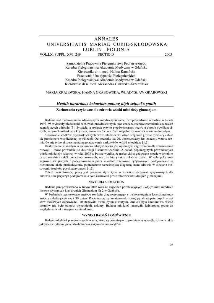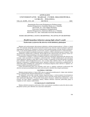 ANNALES UNIVERSITATIS MARIAE CURIE-SKŁODOWSKA LUBLIN - POLONIA VOL.LX, SUPPL. XVI, 249 SECTIO D 2005 Samodzielna Pracownia Pielęgniarstwa Pediatrycznego Katedra Pielęgniarstwa Akademia Medyczna w Gdańsku Kierownik: dr n. med. Halina Kamińska Pracownia Umiejętności Pielęgniarskich Katedra Pielęgniarstwa Akademia Medyczna w Gdańsku Kierownik: dr n. med. Aleksandra Gaworska-Krzemińska MARIA KRAJEWSKA, HANNA GRABOWSKA, WŁADYSŁAW GRABOWSKI Health hazardous behaviors among high school’s youth Zachowania ryzykowne dla zdrowia wśród młodzieży gimnazjum Badania nad zachowaniami zdrowotnymi młodzieży szkolnej przeprowadzone w Polsce w latach 1997 -98 wykazały niedostatki zachowań prozdrowotnych oraz znaczne rozpowszechnienie zachowań zagrażających zdrowiu [5]. Sytuacja ta stwarza ryzyko przedwczesnego rozwoju chorób cywilizacyjnych, w tym chorób układu krążenia, nowotworów, urazów i niepełnosprawności w wieku dorosłym. Stosowanie środków psychoaktywnych przez młodzież w Polsce przybrało groźne rozmiary i stało się problemem współczesnej cywilizacji. Od początku lat 90. obserwowany jest znaczny wzrost rozmiarów nie tylko eksperymentalnego zażywania narkotyków wśród młodzieży [1,2]. Uzależnienie w każdym, a zwłaszcza młodym wieku jest ogromnym zagrożeniem dla zdrowia oraz rozwoju i może prowadzić do destrukcji i samozniszczenia. Z badań populacyjnych prowadzonych wśród młodzieży szkolnej w roku 2003 w Polsce wynika, że narkotyki są zażywane przede wszystkim przez młodzież szkół ponadpodstawowych, oraz że biorą także młodsze dzieci. W celu pokazania zagrożeń związanych z podejmowaniem przez młodzież zachowań ryzykownych podejmowane są różnorodne akcje profilaktyczne, poprzedzone wcześniejszą diagnozą stanu zdrowia w aspekcie stosowania środków psychoaktywnych [1,2]. Celem prezentowanej pracy jest poznanie stylu życia w aspekcie zachowań ryzykownych dla zdrowia oraz przyczyn podejmowania tych zachowań przez młodzież klas drugich gimnazjum. MATERIAŁ I METODA Badania przeprowadzono w lutym 2005 roku na zajęciach pozalekcyjnych i objęto nimi młodzież losowo wybranych klas drugich Gimnazjum Nr 2 w Gdańsku. W badaniach zastosowano metodę sondażu diagnostycznego z wykorzystaniem kwestionariusza ankiety składającego się z 30 pytań. Dwadzieścia pytań stanowiło formę pytań zaopatrzonych w zestaw możliwych odpowiedzi, 10 stanowiło formę pytań otwartych. Ankieta była anonimowa, wśród uczniów nie było odmów wypełnienia ankiety. Badana młodzież stanowiła jednorodną grupę ze względu na wiek i miejsce zamieszkania. WYNIKI BADAŃ I OMÓWIENIE Badana młodzież przejawia zachowania, które są poważnym czynnikiem ryzyka dla zdrowia takie jak palenie tytoniu, picie alkoholu oraz zażywanie narkotyków. 106 Palenie tytoniu Tab. 1. Rozpowszechnienie palenia tytoniu Czy palisz papierosy? Tak Nie N % N % Chłopcy 7 31,8 15 61,8 Dziewczęta 3 9,6 28 90,3 Palenie tytoniu jest poważnym czynnikiem ryzyka dla zdrowia. Efekty działania nikotyny nie są natychmiastowe, lecz występują zazwyczaj po długoletnim paleniu tytoniu. Palenie tytoniu jest przyczyną wielu poważnych schorzeń [4]. Systematycznie pali papierosy 31,8% chłopców i 9,6%, natomiast z grupy palących chłopców 16,7% pali papierosy okazjonalnie. Największa grupa badanych chłopców (66,6%) wypala dziennie do 10 papierosów, natomiast najwięcej z palących dziewcząt (66,6%) wypala do 20 papierosów dziennie. Tab. 2. Liczba wypalanych papierosów do 5 N 1 1 Chłopcy Dziewczęta Liczba wypalanych papierosów dziennie do 10 do 15 do 20 % N % N % N % 16,6 4 66,6 0 0 1 16,6 33,3 0 0 0 0 2 66,6 Tab. 3. Pierwsze próby palenia ze względu na płeć i wiek 7 Wiek Chłopcy Dziewczęta N 1 0 11 % 14,3 N 1 0 12 % 14,3 N 2 1 13 % 28,6 33,3 N 0 1 14 % 0 33,3 N 3 1 % 42,8 33,3 Pierwsze próby palenia tytoniu badani chłopcy podejmowali już od 7 roku życia, a dziewczęta od 12 roku życia. Częstotliwość podejmowania palenia wzrasta wraz z wiekiem, zwłaszcza wśród badanych chłopców. Picie alkoholu Tab. 4. Spożywanie alkoholu Tak Chłopcy Dziewczęta N 10 3 % 45,4 9,6 Czy pijesz alkohol? Nie N % 4 18,1 8 25,8 Okazjonalnie N % 8 36,3 20 64,5 Picie alkoholu jest równie niebezpieczne jak palenie tytoniu, szczególnie dla młodzieży. O ile u osób dorosłych jednorazowe umiarkowane spożycie alkoholu przechodzi prawie bez śladu, a dopiero brak umiaru powoduje nieodwracalne zaburzenia w stanie zdrowia, to dla młodzieży niebezpieczne są już nawet małe dawki alkoholu ze względu na wrażliwość komórek młodych będących w fazie wzrostu [4]. W związku z tym niepokojące są wyniki uzyskane podczas badań. Do picia alkoholu przyznaje się 81,8% uczniów i 74,1% uczennic z tego 36,3% chłopców i 64,5% dziewcząt pije okazjonalnie. Chłopcy Dziewczęta Tab. 5. Rodzaj pitego alkoholu Rodzaj alkoholu Piwo Wino N % N % 18 100 7 38,8 17 73,9 9 39,1 Wódka N % 14 77,7 5 21,7 107 Badana młodzież najczęściej sięga po piwo (100% chłopców i 73,9% dziewcząt), niepokojący jest fakt, że 77,7% chłopców pije wódkę. 1× w tygodniu Chłopcy Dziewczęta N 6 2 % 33,3 8,6 Tab. 6. Częstotliwość picia alkoholu Częstotliwość picia alkoholu Częściej niż 1×w 2× w 1× w miesiącu Tygodniu Miesiącu N % N % N % 1 5,5 3 16,6 6 33,3 1 4,3 3 13,0 6 26,0 Rzadziej niż 1× w miesiącu N % 2 11,1 11 47,8 Najwięcej badanych chłopców (33,3%) podaje, że alkohol pije raz w tygodniu, natomiast w grupie dziewcząt najwięcej (47,8%) pije rzadziej niż raz w miesiącu. Na pytanie jaki wpływ na zdrowie ma picie alkoholu - 81,8% chłopców i 61,2% dziewcząt odpowiada, że ma wpływ negatywny. Niepokój może budzić fakt, że 13,6% badanych chłopców i 38,7% dziewcząt twierdzi, że picie alkoholu nie ma wpływu na zdrowie. Zażywanie narkotyków Stosowanie środków uzależniających to jeden z najbardziej bulwersujących opinię public