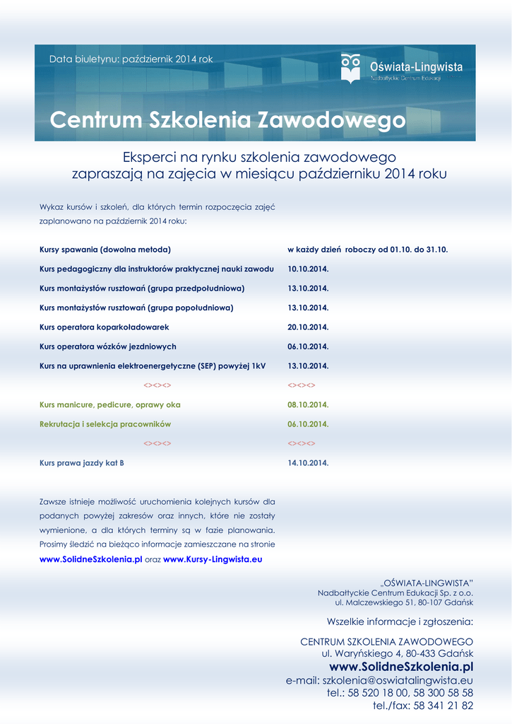 Data biuletynu: październik 2014 rok Centrum Szkolenia Zawodowego Eksperci na rynku szkolenia zawodowego zapraszają na zajęcia w miesiącu październiku 2014 roku Wykaz kursów i szkoleń, dla których termin rozpoczęcia zajęć zaplanowano na październik 2014 roku: Kursy spawania (dowolna metoda) w każdy dzień roboczy od 01.10. do 31.10. Kurs pedagogiczny dla instruktorów praktycznej nauki zawodu 10.10.2014. Kurs montażystów rusztowań (grupa przedpołudniowa) 13.10.2014. Kurs montażystów rusztowań (grupa popołudniowa) 13.10.2014. Kurs operatora koparkoładowarek 20.10.2014. Kurs operatora wózków jezdniowych 06.10.2014. Kurs na uprawnienia elektroenergetyczne (SEP) powyżej 1kV 13.10.2014. <><><> <><><> Kurs manicure, pedicure, oprawy oka 08.10.2014. Rekrutacja i selekcja pracowników 06.10.2014. <><><> Kurs prawa jazdy kat B <><><> 14.10.2014. Zawsze istnieje możliwość uruchomienia kolejnych kursów dla podanych powyżej zakresów oraz innych, które nie zostały wymienione, a dla których terminy są w fazie planowania. Prosimy śledzić na bieżąco informacje zamieszczane na stronie www.SolidneSzkolenia.pl oraz www.Kursy-Lingwista.eu „OŚWIATA-LINGWISTA” Nadbałtyckie Centrum Edukacji Sp. z o.o. ul. Malczewskiego 51, 80-107 Gdańsk Wszelkie informacje i zgłoszenia: CENTRUM SZKOLENIA ZAWODOWEGO ul. Waryńskiego 4, 80-433 Gdańsk www.SolidneSzkolenia.pl e-mail: [email protected] tel.: 58 520 18 00, 58 300 58 58 tel./fax: 58 341 21 82