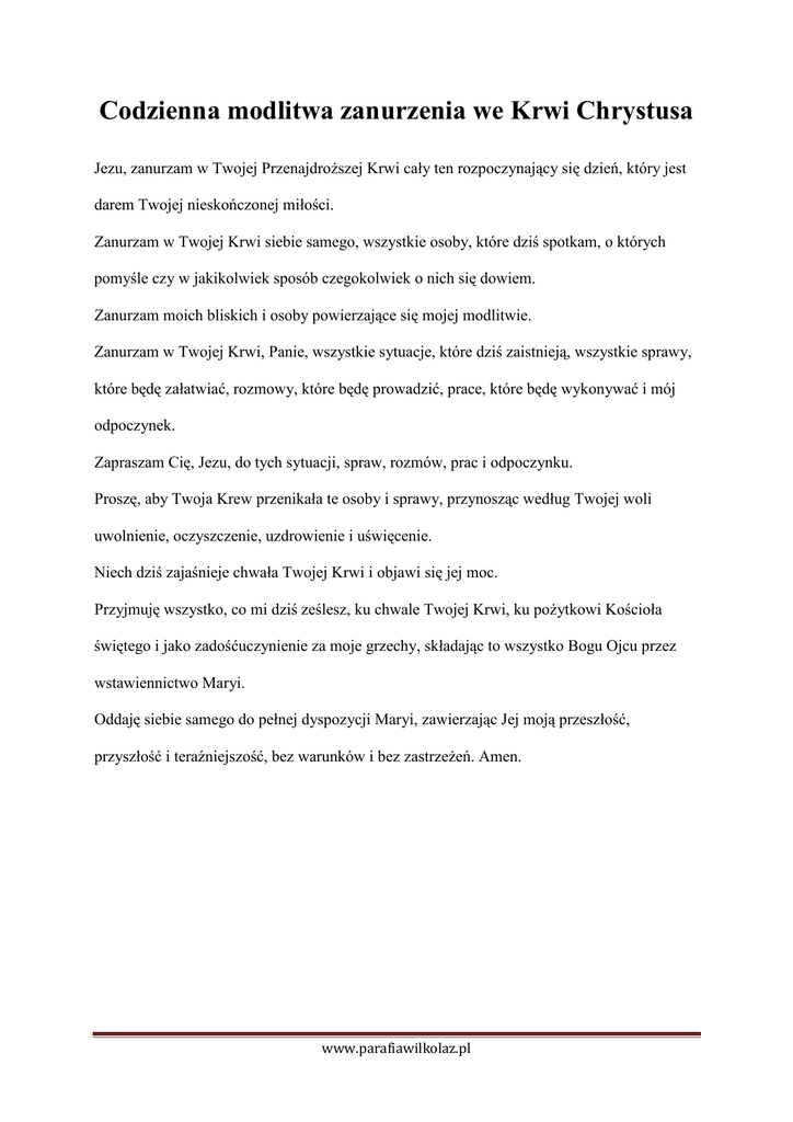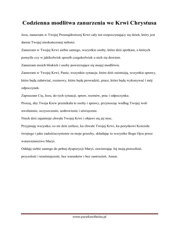Codzienna modlitwa zanurzenia we Krwi Chrystusa Jezu, zanurzam w Twojej Przenajdroższej Krwi cały ten rozpoczynający się dzień, który jest darem Twojej nieskończonej miłości. Zanurzam w Twojej Krwi siebie samego, wszystkie osoby, które dziś spotkam, o których pomyśle czy w jakikolwiek sposób czegokolwiek o nich się dowiem. Zanurzam moich bliskich i osoby powierzające się mojej modlitwie. Zanurzam w Twojej Krwi, Panie, wszystkie sytuacje, które dziś zaistnieją, wszystkie sprawy, które będę załatwiać, rozmowy, które będę prowadzić, prace, które będę wykonywać i mój odpoczynek. Zapraszam Cię, Jezu, do tych sytuacji, spraw, rozmów, prac i odpoczynku. Proszę, aby Twoja Krew przenikała te osoby i sprawy, przynosząc według Twojej woli uwolnienie, oczyszczenie, uzdrowienie i uświęcenie. Niech dziś zajaśnieje chwała Twojej Krwi i objawi się jej moc. Przyjmuję wszystko, co mi dziś ześlesz, ku chwale Twojej Krwi, ku pożytkowi Kościoła świętego i jako zadośćuczynienie za moje grzechy, składając to wszystko Bogu Ojcu przez wstawiennictwo Maryi. Oddaję siebie samego do pełnej dyspozycji Maryi, zawierzając Jej moją przeszłość, przyszłość i teraźniejszość, bez warunków i bez zastrzeżeń. Amen. www.parafiawilkolaz.pl