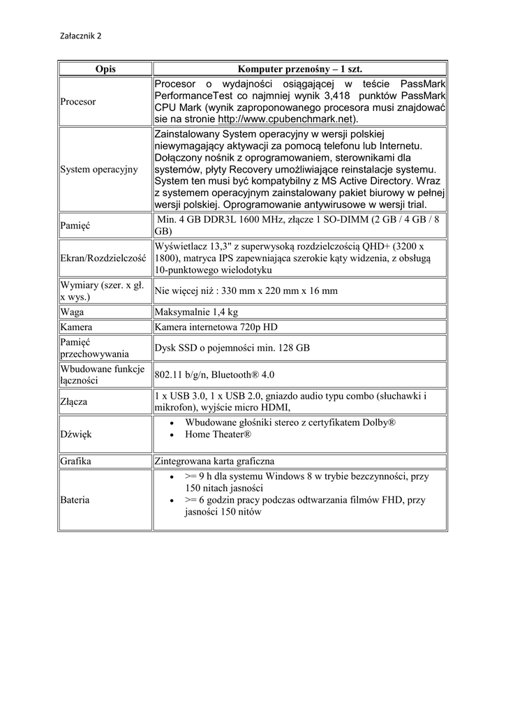 Załacznik 2 Komputer przenośny – 1 szt. Procesor o wydajności osiągającej w teście PassMark PerformanceTest co najmniej wynik 3,418 punktów PassMark Procesor CPU Mark (wynik zaproponowanego procesora musi znajdować sie na stronie http://www.cpubenchmark.net). Zainstalowany System operacyjny w wersji polskiej niewymagający aktywacji za pomocą telefonu lub Internetu. Dołączony nośnik z oprogramowaniem, sterownikami dla System operacyjny systemów, płyty Recovery umożliwiające reinstalacje systemu. System ten musi być kompatybilny z MS Active Directory. Wraz z systemem operacyjnym zainstalowany pakiet biurowy w pełnej wersji polskiej. Oprogramowanie antywirusowe w wersji trial. Min. 4 GB DDR3L 1600 MHz, złącze 1 SO-DIMM (2 GB / 4 GB / 8 Pamięć GB) Wyświetlacz 13,3" z superwysoką rozdzielczością QHD+ (3200 x Ekran/Rozdzielczość 1800), matryca IPS zapewniająca szerokie kąty widzenia, z obsługą 10-punktowego wielodotyku Wymiary (szer. x gł. Nie więcej niż : 330 mm x 220 mm x 16 mm x wys.) Waga Maksymalnie 1,4 kg Kamera Kamera internetowa 720p HD Pamięć Dysk SSD o pojemności min. 128 GB przechowywania Wbudowane funkcje 802.11 b/g/n, Bluetooth® 4.0 łączności 1 x USB 3.0, 1 x USB 2.0, gniazdo audio typu combo (słuchawki i Złącza mikrofon), wyjście micro HDMI, Wbudowane głośniki stereo z certyfikatem Dolby® Home Theater® Dźwięk Opis Grafika Bateria Zintegrowana karta graficzna >= 9 h dla systemu Windows 8 w trybie bezczynności, przy 150 nitach jasności >= 6 godzin pracy podczas odtwarzania filmów FHD, przy jasności 150 nitów