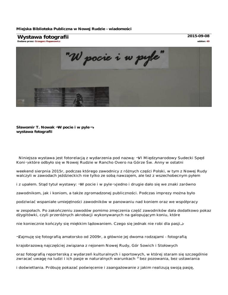 Miejska Biblioteka Publiczna w Nowej Rudzie - wiadomości Wystawa fotografii 2015-09-08 Dodane przez: Grzegorz Rapanowicz odsłon: 49 Sławomir T. Nowak „W pocie i w pyle” wystawa fotografii Niniejsza wystawa jest fotorelacją z wydarzenia pod nazwą: „VI Międzynarodowy Sudecki Spęd Koni”, które odbyło się w Nowej Rudzie w Rancho Overo na Górze Św. Anny w ostatni weekend sierpnia 2015r, podczas którego zawodnicy z różnych części Polski, w tym z Nowej Rudy walczyli w zawodach jeździeckich nie tylko ze sobą nawzajem, ale też z wszechobecnym pyłem i z upałem. Stąd tytuł wystawy: „W pocie i w pyle”. Jedno i drugie dało się we znaki zarówno zawodnikom, jak i koniom, a także zgromadzonej publiczności. Podczas imprezy można było podziwiać wspaniałe umiejętności zawodników w panowaniu nad koniem oraz we współpracy w zespołach. Po zakończeniu zawodów pomimo zmęczenia część zawodników dała dodatkowo pokaz dżygitówki, czyli przeróżnych akrobacji wykonywanych na galopującym koniu, które nie koniecznie kończyły się miękkim lądowaniem. Czego się jednak nie robi dla pasji… „Zajmuję się fotografią amatorsko od 2009r, a głównie jej dwoma rodzajami - fotografią krajobrazową najczęściej związana z rejonem Nowej Rudy, Gór Sowich i Stołowych oraz fotografią reporterską z wydarzeń kulturalnych i sportowych, w której staram się szczególnie zwracać uwagę na ludzi i ich pasje w naturalnych warunkach – bez pozowania, bez ustawiania i doświetlania. Próbuję pokazać poświęcenie i zaangażowanie z jakim realizują swoją pasję, ich sukcesy i porażki, wzloty i upadki, radość, zmęczenie, ból i ciężką pracę, a także ich opłacone długimi treningami umiejętności.” (Sławomir Nowak) Wystawę można oglądać do końca października w holu naszej biblioteki. Powered by TCPDF (www.tcpdf.org)
