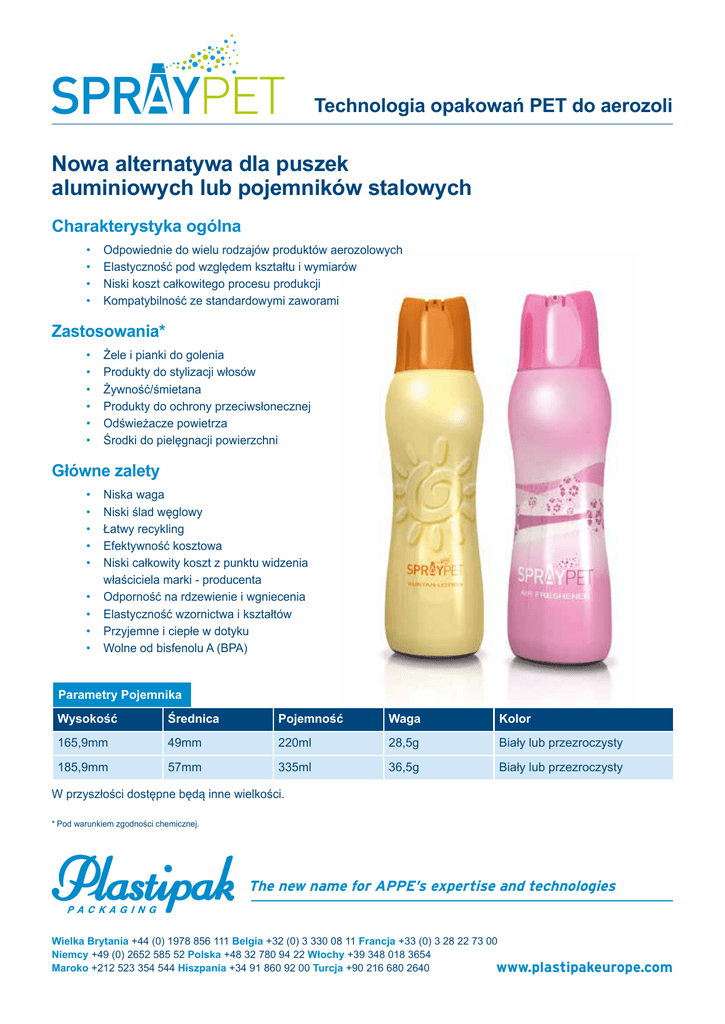 Technologia opakowań PET do aerozoli Nowa alternatywa dla puszek aluminiowych lub pojemników stalowych Charakterystyka ogólna • • • • Odpowiednie do wielu rodzajów produktów aerozolowych Elastyczność pod względem kształtu i wymiarów Niski koszt całkowitego procesu produkcji Kompatybilność ze standardowymi zaworami Zastosowania* • • • • • • Żele i pianki do golenia Produkty do stylizacji włosów Żywność/śmietana Produkty do ochrony przeciwsłonecznej Odświeżacze powietrza Środki do pielęgnacji powierzchni Główne zalety • • • • • • • • • Niska waga Niski ślad węglowy Łatwy recykling Efektywność kosztowa Niski całkowity koszt z punktu widzenia właściciela marki - producenta Odporność na rdzewienie i wgniecenia Elastyczność wzornictwa i kształtów Przyjemne i ciepłe w dotyku Wolne od bisfenolu A (BPA) Parametry Pojemnika Wysokość Średnica Pojemność Waga Kolor 165,9mm 49mm 220ml 28,5g Biały lub przezroczysty 185,9mm 57mm 335ml 36,5g Biały lub przezroczysty W przyszłości dostępne będą inne wielkości. *Pod warunkiem zgodności chemicznej. The new name for APPE’s expertise and technologies Wielka Brytania +44 (0) 1978 856 111 Belgia +32 (0) 3 330 08 11 Francja +33 (0) 3 28 22 73 00 Niemcy +49 (0) 2652 585 52 Polska +48 32 780 94 22 Włochy +39 348 018 3654 Maroko +212 523 354 544 Hiszpania +34 91 860 92 00 Turcja +90 216 680 2640 www.plastipakeurope.com