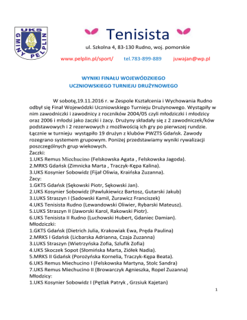 Tenisista ul. Szkolna 4, 83-‐130 Rudno, woj. pomorskie w ww.pelplin.pl/sport/ t el.783-‐899-‐889 Rudno,21.08.2012. [email protected] WYNIKI FINAŁU WOJEWÓDZKIEGO UCZNIOWSKIEGO TURNIEJU DRUŻYNOWEGO W sobotę,19.11.2016 r. w Zespole Kształcenia i Wychowania Rudno odbył się Finał Wojewódzki Uczniowskiego Turnieju Drużynowego. Wystąpiły w nim zawodniczki i zawodnicy z roczników 2004/05 czyli młodziczki i młodzicy oraz 2006 i młodsi jako żaczki i żacy. Drużyny składały się z 2 zawodniczek/ków podstawowych i 2 rezerwowych z możliwością ich gry po pierwszej rundzie. Łącznie w turnieju wystąpiło 19 drużyn z klubów PWZTS Gdańsk. Zawody rozegrano systemem grupowym. Poniżej przedstawiamy wyniki rywalizacji poszczególnych grup wiekowych. Żaczki: 1.UKS Remus Miechucino (Felskowska Agata , Felskowska Jagoda). 2.MRKS Gdańsk (Zimnicka Marta , Traczyk-‐Kępa Kalina). 3.UKS Kosynier Sobowidz (Fijał Oliwia, Kraińska Zuzanna). Żacy: 1.GKTS Gdańsk (Sękowski Piotr, Sękowski Jan). 2.UKS Kosynier Sobowidz (Pawlukiewicz Bartosz, Gutarski Jakub) 3.LUKS Straszyn I (Sadowski Kamil, Żurawicz Franciszek) 4.UKS Tenisista Rudno (Lewandowski Oliwier, Rybarski Mateusz). 5.LUKS Straszyn II (Jaworski Karol, Rakowski Piotr). 6.UKS Tenisista II Rudno (Luchowski Hubert, Gdaniec Damian). Młodziczki: 1.GKTS Gdańsk (Dietrich Julia, Krakowiak Ewa, Pręda Paulina) 2.MRKS I Gdańsk (Licbarska Adrianna, Czaja Zuzanna) 3.LUKS Straszyn (Wietrzyńska Zofia, Szlufik Zofia) 4.UKS Skoczek Sopot (Słomińska Marta, Ziółek Nadia). 5.MRKS II Gdańsk (Porożyńska Kornelia, Traczyk-‐Kępa Beata). 6.UKS Remus Miechucino I (Felskowska Martyna, Stolc Sandra) 7.UKS Remus Miechucino II (Browarczyk Agnieszka, Ropel Zuzanna) Młodzicy: 1.UKS Kosynier Sobowidz I (Pętlak Patryk , Grzsiuk Kajetan) 1 2.UKS Remus Miechucino (Krzebietke Kacper, Głodowski Wiktor) 3.UKS Kosynier Sobowidz II (Pawlukiewicz Kacper, Kiciński Jakub) Zwycięskie zespoły otrzymały pamiątkowe dyplomy metalowe na podkładzie drewnianym. Zawodnikom i ich opiekunom za miejsca I-‐III wręczono medale . Wydatek dofinansowany ze środków PWZTS Gdańsk. Turniej przebiegał w miłej atmosferze za co organizator składa podziękowania przybyłym rodzicom i opiekunom. Uwaga : w sali pozostawiono mały niebieski plecak i buty.(Tel.783-‐899-‐889) Ślę pozdrowienia – Jan Juwa 2