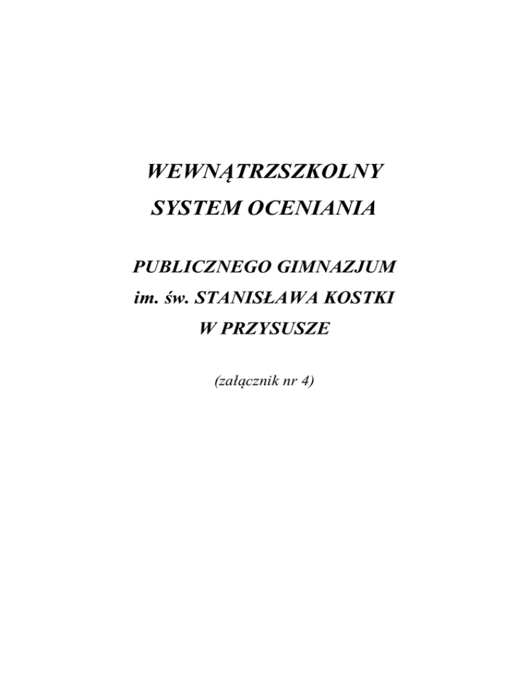 WEWNĄTRZSZKOLNY SYSTEM OCENIANIA PUBLICZNEGO GIMNAZJUM im. św. STANISŁAWA KOSTKI W PRZYSUSZE (załącznik nr 4) PUBLICZNE GIMNAZJUM IM.ŚW. STANISŁAWA KOSTKI W PRZYSUSZE _______________________________________________________________________________________________________________________________________ § 1. Na podstawie ustawy z dnia 7 września 1991 r. o systemie oświaty (Dz. U. z 2004 r. Nr 256, poz. 2572, z późn. zm.) oraz rozporządzenia MEN z dnia 10.06.2015 r. określa się warunki i sposób oceniania, klasyfikowania, promowania uczniów oraz przeprowadzania egzaminów klasyfikacyjnych, poprawkowych i sprawdzianów w ramach oceniania wewnątrzszkolnego w Publicznym Gimnazjum im. św. Stanisława Kostki w Przysusze. § 2. Rok szkolny dzieli się na dwa półrocza. Termin klasyfikacji śródrocznej i klasyfikacji rocznej ustala Dyrektor Szkoły w ,,Kalendarzu roku szkolnego”. § 3. Wymagania edukacyjne 1. Ocenianie osiągnięć edukacyjnych i zachowania ucznia odbywa się w ramach oceniania wewnątrzszkolnego, którego cele określa ustawa o systemie oświaty. 2. Nauczyciele poszczególnych przedmiotów po wybraniu odpowiedniego programu nauczania obowiązani są do opracowania wymagań edukacyjnych na dany rok szkolny i złożenia w formie pisemnej u Dyrektora Szkoły na początku roku szkolnego. 3. W pierwszym tygodniu nauki nauczyciele zobowiązani są zapoznać uczniów z wymaganiami edukacyjnymi, sposobami sprawdzania osiągnięć szkolnych oraz z warunkami i trybem uzyskania wyższej niż przewidywana rocznej oceny klasyfikacyjnej z zajęć edukacyjnych. Informacje te winne być przekazane rodzicom (prawnym opiekunom) na pierwszym zebraniu każdego roku szkolnego. 4. W pierwszym tygodniu nauki wychowawcy klas zobowiązani są do poinformowania uczniów o: a) warunkach i sposobie oraz kryteriach oceniania zachowania; b) warunkach i trybie uzyskania wyższej niż przewidywana rocznej oceny klasyfikacyjnej zachowania. Informacje te winne być przekazane rodzicom (prawnym opiekunom) na pierwszym zebraniu każdego roku szkolnego. 5. Nauczyciel na podstawie pisemnej opinii poradni psychologiczno-pedagogicznej lub innej poradni specjalistycznej jest zobowiązany dostosować wymagania edukacyjne w stosunku do ucznia, u którego stwierdzono specyficzne trudności w uczeniu się lub deficyty rozwojowe. W przypadku ucznia posiadającego orzeczenie o potrzebie kształcenia specjalnego albo indywidualnego nauczania nauczyciel winien dostosować wymagania edukacyjne do indywidualnych potrzeb psychofizycznych i edukacyjnych ucznia zgodnie z orzeczeniem. 5a. Nauczyciel jest zobowiązany dostosować wymagania edukacyjne w stosunku do ucznia nieposiadającego orzeczenia lub opinii, na podstawie rozpoznania indywidualnych potrzeb rozwojowych i edukacyjnych oraz indywidualnych możliwości psychofizycznych dokonanego przez nauczycieli i specjalistów. 6. W uzasadnionych przypadkach uczeń może być zwolniony na czas określony z zajęć wychowania fizycznego, informatyki. Decyzję o zwolnieniu ucznia podejmuje Dyrektor Szkoły na podstawie opinii o ograniczonych możliwościach uczestniczenia w tych zajęciach wydanej przez lekarza na czas określony w tej opinii. 2 PUBLICZNE GIMNAZJUM IM.ŚW. STANISŁAWA KOSTKI W PRZYSUSZE _______________________________________________________________________________________________________________________________________ 6a. Nauczyciel wychowania fizycznego na podstawie opinii lekarza o ograniczonych możliwościach wykonywania przez ucznia określonych ćwiczeń fizycznych jest zobowiązany do dostosowania wymagań edukacyjnych do możliwości psychofizycznych ucznia na podstawie tej opinii. Decyzję o zwolnieniu ucznia z wykonywania określonych ćwiczeń fizycznych na zajęciach wychowania fizycznego podejmuje Dyrektor Szkoły na podstawie opinii o ograniczonych możliwościach wykonywania przez ucznia tych ćwiczeń wydanej przez lekarza na czas określony w tej opinii. 7. Jeżeli okres zwolnienia ucznia z zajęć wychowania fizycznego, informatyki uniemożliwia ustalenie śródrocznej lub rocznej oceny klasyfikacyjnej, w dokumentacji przebiegu nauczania zamiast oceny klasyfikacyjnej wpisuje się „zwolniony” albo „zwolniona”. 8. Dyrektor Szkoły na wniosek rodziców (prawnych opiekunów) oraz na podstawie opinii poradni psychologiczno-pedagogicznej zwalnia do końca danego etapu edukacyjnego ucznia z wadą słuchu, z głęboką dysleksją rozwojową, z afazją, z niepełnosprawnościami sprzężonymi lub z autyzmem, w tym z zespołem Aspergera, z nauki drugiego języka obcego. 9. W przypadku ucznia posiadającego orzeczenie o potrzebie kształcenia specjalnego albo indywidualnego nauczania zwolnienie z drugiego języka obcego może nastąpić na podstawie tego orzeczenia. 10. Informacje o zwolnieniu Dyrektor Szkoły przekazuje wychowawcy oraz rodzicom (prawnym opiekunom) w formie pisemnej. 11. W przypadku zwolnienia ucznia z zajęć w dokumentacji przebiegu nauczania zamiast oceny klasyfikacyjnej wpisuje się „zwolniony”. 12. W przypadku czasowego zwolnienia, nieprzekraczającego połowy zajęć w półroczu, należy przeprowadzić normalną klasyfikację ucznia. § 4. Skala i sposób oceniania bieżącego 1. Ocenianiu bieżącemu podlegają: a) osiągnięcia edukacyjne ucznia; b) zachowanie ucznia. 2. Ocenianie osiągnięć edukacyjnych ucznia polega na rozpoznawaniu przez nauczycieli poziomu i postępów w opanowaniu przez ucznia wiadomości i umiejętności w stosunku do wymagań edukacyjnych wynikających z podstawy programowej, określonej w odrębnych przepisach, i realizowanych w szkole programów nauczania, uwzględniających tę podstawę. 2a. Ocenianie bieżące z zajęć edukacyjnych ma na celu monitorowanie pracy ucznia oraz przekazywanie uczniowi informacji o jego osiągnięciach edukacyjnych pomagających w uczeniu się, poprzez wskazanie, co uczeń robi dobrze, co i jak wymaga poprawy, jak powinien dalej się uczyć o