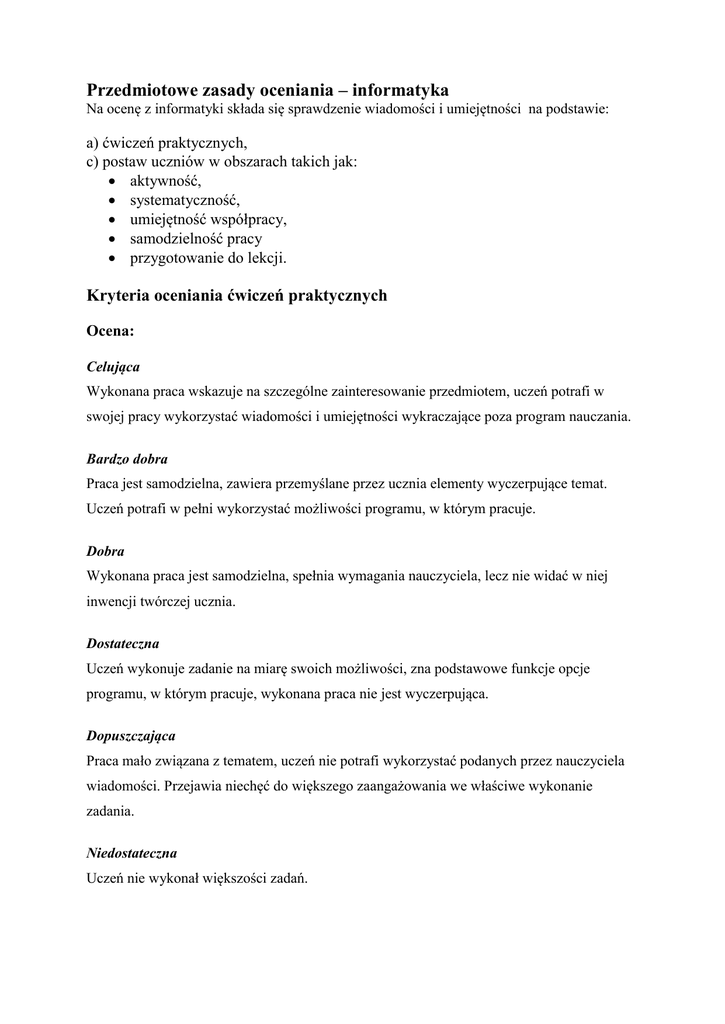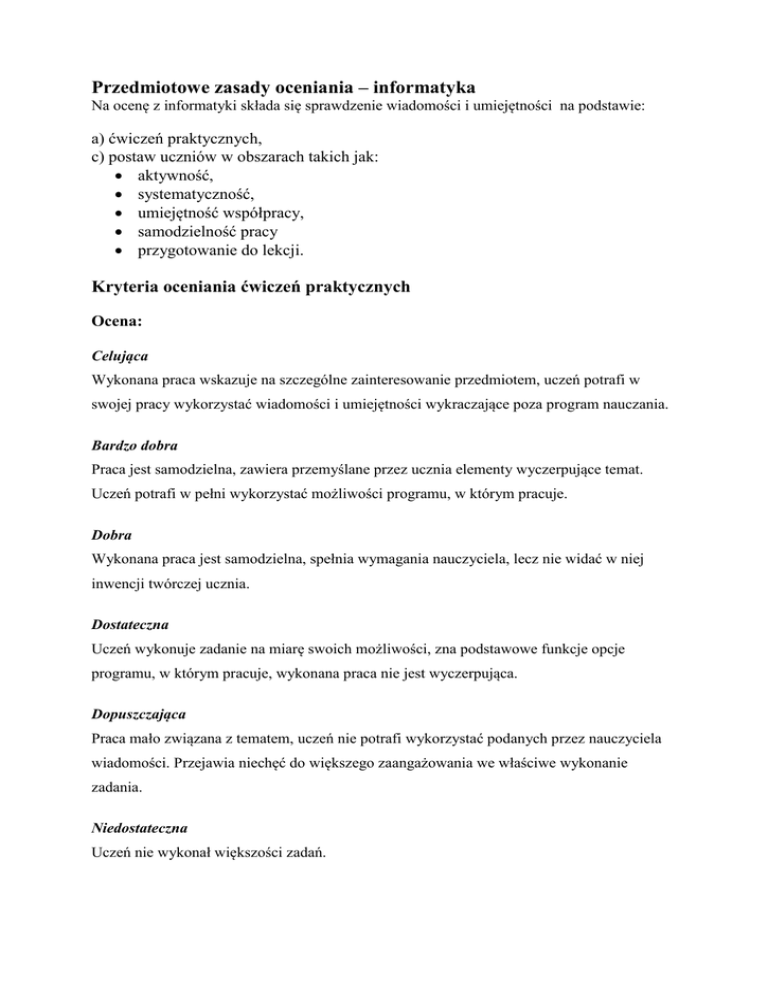 Przedmiotowe zasady oceniania – informatyka Na ocenę z informatyki składa się sprawdzenie wiadomości i umiejętności na podstawie: a) ćwiczeń praktycznych, c) postaw uczniów w obszarach takich jak: aktywność, systematyczność, umiejętność współpracy, samodzielność pracy przygotowanie do lekcji. Kryteria oceniania ćwiczeń praktycznych Ocena: Celująca Wykonana praca wskazuje na szczególne zainteresowanie przedmiotem, uczeń potrafi w swojej pracy wykorzystać wiadomości i umiejętności wykraczające poza program nauczania. Bardzo dobra Praca jest samodzielna, zawiera przemyślane przez ucznia elementy wyczerpujące temat. Uczeń potrafi w pełni wykorzystać możliwości programu, w którym pracuje. Dobra Wykonana praca jest samodzielna, spełnia wymagania nauczyciela, lecz nie widać w niej inwencji twórczej ucznia. Dostateczna Uczeń wykonuje zadanie na miarę swoich możliwości, zna podstawowe funkcje opcje programu, w którym pracuje, wykonana praca nie jest wyczerpująca. Dopuszczająca Praca mało związana z tematem, uczeń nie potrafi wykorzystać podanych przez nauczyciela wiadomości. Przejawia niechęć do większego zaangażowania we właściwe wykonanie zadania. Niedostateczna Uczeń nie wykonał większości zadań. Kryteria oceniania kartkówek Ocena: Celująca Odpowiedzi wskazują na szczególne zainteresowanie ucznia przedmiotem, spełnia kryteria oceny bardzo dobrej, wykracza poza program, zawiera własne, oryginalne przemyślenia i oceny lub treści zaczerpnięte ze źródeł poza podręcznikowych. Bardzo dobra Odpowiedzi wyczerpujące. Treść nie wykracza poza program. Dobra Odpowiedzi zasadniczo samodzielne, zawierają większość wymaganych treści, poprawne pod względem języka, ale nie wyczerpują zagadnienia. Dostateczna Uczeń zna najważniejsze fakty dotyczące pracy z komputerem, zna klawiaturę, umie poruszać się w środowisku znanego systemu operacyjnego (np. Windows). Odpowiedzi odbywają się przy niewielkim ukierunkowaniu ze strony nauczycielka. Występują nieliczne błędy rzeczowe i językowe. Dopuszczająca Wymagane przynajmniej 50% wiedzy i umiejętności. Chodzi tu o uzyskanie przez ucznia wiedzy i umiejętności niezbędnych do korzystania z komputera jako narzędzia do pracy i rozrywki. Wiedz ta jest nieodzowna w toku dalszego kształcenia. W odpowiedziach możliwe są liczne błędy, zarówno w zakresie wiedzy merytorycznej, jak i sposobie jej prezentowania. Uczeń zna jednak podstawowe fakty i przy pomocy nauczyciela udzielić odpowiedzi na postawione pytania. Niedostateczna Odpowiedzi nie spełniają wymagań podanych kryteriów ocen pozytywnych Kryteria oceniania w zakresie postaw uczniów Ocena: Celująca Podczas wykonywania zadań uczeń wykazuje się dużą starannością i sumiennością. Dąży do samodoskonalenia i twórczego rozwoju własnych uzdolnień. Przygotowuje dodatkowe informacje na zajęcia, wykonuje prace długoterminowe. Samodzielnie wykonuje wszystkie zadania teoretyczne i praktyczne. Zaangażowany w pracę klasy, grupy, motywuje innych uczestników zajęć do pokonywania trudności. Przestrzega wszelkich zasad bezpieczeństwa i higieny i organizacji pracy. Przejawia inicjatywę, nauczyciel może na niego zawsze liczyć. Odnosi sukcesy w konkursach informatycznych. Bardzo dobra Podczas wykonywania zadań uczeń wykazuje się duża starannością i sumiennością. Stara się przy tym być samodzielny. Zaangażowany w pracę klasy , grupy, stara się być aktywny i odpowiedzialny. Zachęca do dobrej współpracy w grupie, okazuje szacunek innym jej członkom. Efektywnie wykorzystuje czas pracy. Dobra Podczas wykonywania zadań uczeń stara się być samodzielny, brak mu jednak staranności i systematyczności w działaniu. Zaangażowany w pracę klasy, grupy, stara się być aktywny. Nie zawsze okazuje szacunek innym członkom grupy. Niezbyt efektywnie wykorzystuje czas pracy. Dostosowuje się do obowiązujących zasad bezpiecznej i higienicznej pracy z komputerem. Dostateczna Podczas wykonywania zadań teoretycznych i praktycznych uczeń wymaga czasami mobilizacji i pomocy ze strony nauczyciela i innych uczniów. Mało samodzielny przy wykonywaniu ćwiczeń. Słabo zaangażowany w pracę klasy, grupy. Nie zawsze przestrzega zasad bezpiecznej i higienicznej pracy z komputerem Dopuszczająca Podczas wykonywania zadań teoretycznych i praktycznych uczeń wymaga stałej mobilizacji i pomocy ze strony nauczyciela. Jego praca cechuje się małą samodzielnością. Słabo zaangażowany w pracę klasy, grupy. Rzadko wspiera dobrą komunikację w grupie rzadko okazuje szacunek innym jej członkom. Nie zawsze przestrzega zasad bezpiecznej pracy z komputerem. Niedostateczna Nie potrafi wykonać zadań teoretycznych i praktycznych nawet przy pomocy nauczyciela. Nie wykonuje prac samodzielnie. Nie jest zaangażowany w pracę klasy, grupy. Rzadko wspiera dobrą komunikację w grupie i nie okazuje szacunku innym jej członkom. Nie przestrzega zasad bezpiecznej i higienicznej pracy z komputerem Uwagi! 1) Jeżeli uczeń nie odrobi zadania domowego, otrzymuje „-„ (chyba, że ma usprawiedliwienie). Trzy minusy w semestrze dają ocenę niedostateczną. 2) Jeżeli uczeń nie ma zeszytu, otrzymuje znaczek „z”. Trzy znaczki w semestrze dają ocenę niedostateczną. 3) Udział w konkursach i olimpiadach przedmiotowych (przynajmniej w drugim etapie) daje dodatkową ocenę celującą. 4) Ocena końcowa nie jest średnią ocen cząstkowych. 5) Każdy sprawdzian i praca klasowa będą omawiane z całą grupą/klasą po sprawdzeniu przez nauczyciela. Uczniowie otrzymają też indywidualne ustne i pisemne wskazówki dotyczące materiału nad którym muszą jeszcze popracować oraz zostaną poinformowani o sposobach lepszego opanowania danego zagadnienia. Na zebraniach, dniach otwartych i indywidualnych konsultacjach rodzice również będą otrzymywać ww. informacje. Wiktor Horbaczewski