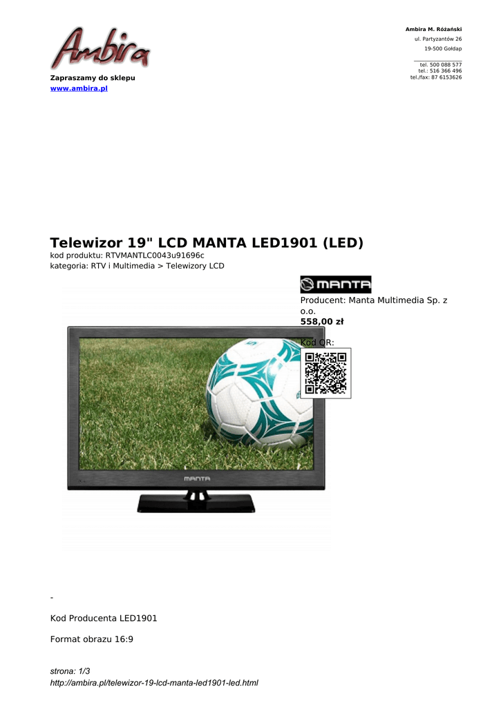 Ambira M. Różański ul. Partyzantów 26 19-500 Gołdap ___________________ tel. 500 088 577 tel.: 516 366 496 tel./fax: 87 6153626 Zapraszamy do sklepu www.ambira.pl Telewizor 19" LCD MANTA LED1901 (LED) kod produktu: RTVMANTLC0043u91696c kategoria: RTV i Multimedia > Telewizory LCD Producent: Manta Multimedia Sp. z o.o. 558,00 zł Kod QR: Kod Producenta LED1901 Format obrazu 16:9 strona: 1/3 http://ambira.pl/telewizor-19-lcd-manta-led1901-led.html Przekątna ekranu 19cale Nominalna rozdzielczość 1366x768 HD Ready Tak Full HD Nie Jasność 220cd/m2 Kontrast Dynamiczny 1000:1 Czas reakcji matrycy 5ms Kąt widzenia w pionie 170Stopni Kąt widzenia w poziomie 160Stopni Tuner 1 (typ) DVB-T (Cyfrowy naziemny z obsługą MPEG-4) Tuner 2 (typ) Analogowy oraz DVB-T (Cyfrowy naziemny) Ilość pamięci programów 1000szt. Procesor dźwięków Obsługiwane standardy fonii TV analogowej Obsługiwane systemy stereo NICAM Wzmacniacz Głośniki Wbudowane Głośniki wbudowane (szczegóły) moc głośników 6W Możliwość podłączenia głośników zewnętrznych Nie Gniazdo słuchawkowe (ilość) 1szt. Gniazdo HDMI (ilość) 1szt. Mozliwość podłączenia komputera PC Tak Gniazdo SCART (Eurozłącze) (ilość) 1szt. Gniazdo USB (ilość) 1szt. Wyjście audio cyfrowe SPDIF Wejście audio cyfrowe SPDIF Wejście RGB Gniazda dodatkowe VGA Wyjście Audio/Video z wbudowanego tunera Pilot Tak strona: 2/3 http://ambira.pl/telewizor-19-lcd-manta-led1901-led.html Telegazeta Tak Czytnik kart Nie Wbudowany mikrofon Nie Wbudowany twardy dysk Nie Pojemność twardego dysku Napięcie zasilania Pobór mocy (praca/czuwanie) 26W/1W Możliwość zawieszenia na ścianie Brak Kolor obudowy czarna Wyposażenie Zgodność z normami Deklaracja zgodności: Odbiornik cyfrowy jest zgodny z wymaganiami określonymi w przepisach dotyczących wymagań technicznych i eksploatacyjnych dla urządzeń konsumenckich służących do odbioru cyfrowych naziemnych transmisji telewizyjnych. strona: 3/3 http://ambira.pl/telewizor-19-lcd-manta-led1901-led.html