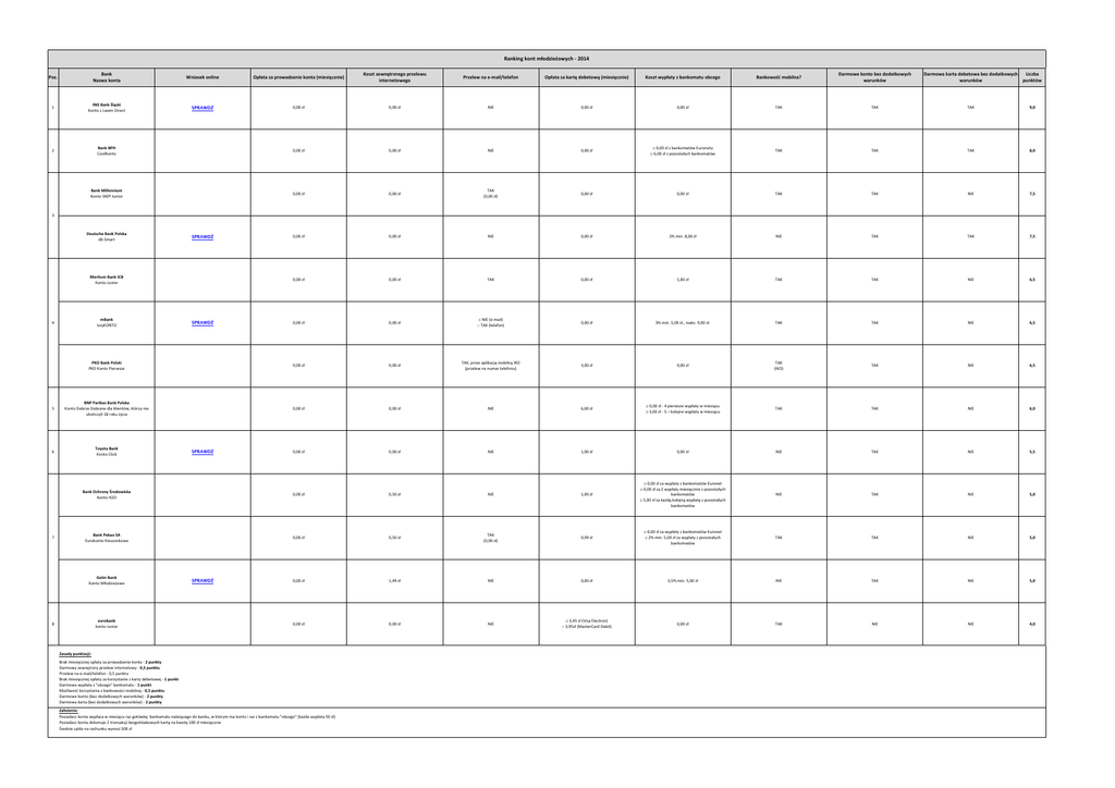 Ranking kont młodzieżowych -‐ 2014 Poz. Bank Nazwa konta Wniosek online Opłata za prowadzenie konta (miesięcznie) Koszt zewnętrznego przelewu internetowego Przelew na e-‐mail/telefon Opłata za kartę debetową (miesięcznie) Koszt wypłaty z bankomatu obcego Bankowość mobilna? Darmowe konto bez dodatkowych warunków Darmowa karta debetowa bez dodatkowych Liczba warunków punktów 1 ING Bank Śląski Konto z Lwem Direct SPRAWDŹ 0,00 zł 0,00 zł NIE 0,00 zł 0,00 zł TAK TAK TAK 9,0 2 Bank BPH CoolKonto 0,00 zł 0,00 zł NIE 0,00 zł :: 0,00 zł z bankomatów Euronetu :: 6,00 zł z pozostałych bankomatów TAK TAK TAK 8,0 Bank Millennium Konto 360º Junior 0,00 zł 0,00 zł TAK (0,00 zł) 0,00 zł 0,00 zł TAK TAK NIE 7,5 0,00 zł 0,00 zł NIE 0,00 zł 2% min. 8,00 zł NIE TAK TAK 7,5 0,00 zł 0,00 zł TAK 0,00 zł 1,00 zł TAK TAK NIE 6,5 0,00 zł 0,00 zł :: NIE (e-‐mail) :: TAK (telefon) 0,00 zł 3% min. 5,00 zł., maks. 9,00 zł. TAK TAK NIE 6,5 PKO Bank Polski PKO Konto Pierwsze 0,00 zł 0,00 zł TAK, przez aplikację mobilną IKO (przelew na numer telefonu) 3,00 zł 0,00 zł TAK (IKO) TAK NIE 6,5 5 BNP Paribas Bank Polska Konto Dobrze Dobrane dla klientów, którzy nie ukończyli 18 roku życia 0,00 zł 0,00 zł NIE 6,00 zł :: 0,00 zł -‐ 4 pierwsze wypłaty w miesiącu :: 3,00 zł -‐ 5. i kolejne wypłaty w miesiącu TAK TAK NIE 6,0 6 Toyota Bank Konto Click 0,00 zł 0,00 zł NIE 1,00 zł 0,00 zł NIE TAK NIE 5,5 Bank Ochrony Środowiska Konto H2O 0,00 zł 0,50 zł NIE 1,00 zł :: 0,00 zł za wypłaty z bankomatów Euronet :: 0,00 zł za 2 wypłaty miesięcznie z pozostałych bankomatów :: 5,00 zł za każdą kolejną wypłatę z pozostałych bankomatów NIE TAK NIE 5,0 Bank Pekao SA Eurokonto Kieszonkowe 0,00 zł 0,50 zł TAK (0,00 zł) 0,99 zł :: 0,00 zł za wypłaty z bankomatów Euronet :: 2% min. 5,00 zł za wypłaty z pozostałych bankomatów TAK TAK NIE 5,0 0,00 zł 1,49 zł NIE 0,00 zł 3,5% min. 5,00 zł NIE TAK NIE 5,0 0,00 zł 0,00 zł NIE :: 3,45 zł (Visa Electron) :: 3,95zł (MasterCard Debit) 0,00 zł TAK NIE NIE 4,0 3 Deutsche Bank Polska db Smart SPRAWDŹ Meritum Bank ICB Konto Junior mBank IzzyKONTO 4 7 Getin Bank Konto Młodzieżowe eurobank konto Junior 8 SPRAWDŹ SPRAWDŹ SPRAWDŹ Zasady punktacji: Brak miesięcznej opłaty za prowadzenie konta -‐ 2 punkty Darmowy zewnętrzny przelew internetowy -‐ 0,5 punktu Przelew na e-‐mail/telefon -‐ 0,5 punktu Brak miesięcznej opłaty za korzystanie z karty debetowej -‐ 1 punkt Darmowa wypłata z "obcego" bankomatu -‐ 1 punkt Możliwość korzystania z bankowości mobilnej -‐ 0,5 punktu Darmowe konto (bez dodatkowych warunków) -‐ 2 punkty Darmowa karta (bez dodatkowych warunków) -‐ 2 punkty Założenia: Posiadacz konta wypłaca w miesiącu raz gotówkę bankomatu należącego do banku, w którym ma konto i raz z bankomatu "obcego" (każda wypłata 50 zł) Posiadacz konta dokonuje 2 transakcji bezgotówkowych kartą na kwotę 100 zł miesięcznie Średnie saldo na rachunku wynosi 500 zł