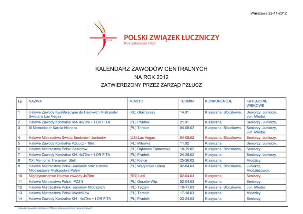 Warszawa 22-11-2012 KALENDARZ ZAWODÓW CENTRALNYCH NA ROK 2012 ZATWIERDZONY PRZEZ ZARZĄD PZŁUCZ Lp. NAZWA MIASTO TERMIN KONKURENCJE KATEGORIE WIEKOWE 1 Halowe Zawody Kwalifikacyjne do Halowych Mistrzostw Świata w Las Vegas (PL) Głuchołazy 14.01 Klasyczna, Bloczkowa, Seniorzy, Juniorzy, Jun. Młodsi, 2 Halowe Zawody Kontrolne KN- 4x70m + I OR FITA (PL) Prudnik 21.01 Klasyczna, Seniorzy, Juniorzy, 3 III Memoriał dr Karola Hibnera (PL) Teresin 04-05.02 Klasyczna, Bloczkowa, Seniorzy, Juniorzy, Jun. Młodsi, 4 Halowe Mistrzostwa Świata Seniorów i Juniorów (US) Las Vegas 04-09.02 Klasyczna, Bloczkowa, Seniorzy, Juniorzy, 5 Halowe Zawody Kontrolne PZŁucz - 18m. (PL) Milówka 11.02 Klasyczna, Seniorzy, Juniorzy, 6 Halowe Mistrzostwa Polski Seniorów (PL) Dąbrowa Tarnowska 18-19.02 Klasyczna, Bloczkowa, Seniorzy, 7 Halowe Zawody Kontrolne KN- 4x70m + I OR FITA (PL) Prudnik 24-25.02 Klasyczna, Seniorzy, Juniorzy, 8 XXI Memoriał Trenerów Stelli (PL) Kielce 25-26.02 Klasyczna, Młodzicy, 9 Halowe Mistrzostwa Polski Juniorów oraz Halowe Młodzieżowe Mistrzostwa Polski (PL) Węgierska Górka 02-04.03 Klasyczna, Bloczkowa, Juniorzy, Młodzieżowcy, 10 Międzynarodowe Halowe zawody 4x70m (RO) Lasi 02-04.03 Klasyczna, Seniorzy, 11 Halowe Mistrzostwa Polski -PZSN (PL) Gorzów Wlp. 02-04.03 Klasyczna, Seniorzy, 12 Halowe Mistrzostwa Polski Juniorów Młodszych (PL) Tyczyn 10-11.03 Klasyczna, Bloczkowa, Jun. Młodsi, 13 Halowe Mistrzostwa Polski Młodzików (PL) Teresin 17-18.03 Klasyczna, Młodzicy, 14 Halowe Zawody Kontrolne KN - 4x70m + I OR FITA (PL) Prudnik 23-24.03 Klasyczna, Seniorzy, Kalendarz zawodów centralnych PZŁucz. pobrany ze strony (www.archery.pl) 15 VIII Wiosenny Turniej Łuczniczy na 30m - Zawody o Pietruszkę (PL) Radzymin 24-25.03 Klasyczna, Młodzicy, 16 Kwalifikacyjne Zawody Kontrolne KN - 2x70m + I OR FITA (PL) Legnica 31.03 Klasyczna, Seniorzy, 17 Międzynarodowy Turniej łuczniczy z okazji 771 Rocznicy Bitwy pod Legnicą (PL) Legnica 01.04 Klasyczna, Bloczkowa, Seniorzy, Juniorzy, Jun. Młodsi, 18 I runda Pucharu Świata Seniorów (CN) Shanghai 10-15.04 Klasyczna, Bloczkowa, Seniorzy, 19 Międzynarodowy Puchar Gór Opawskich i memoriał Romana Karawana (PL) Prudnik 14-15.04 Klasyczna, Seniorzy, Juniorzy, Jun. Młodsi, 20 I runda Pucharu Polski Seniorów i Juniorów, I runda DMP Kobiet i Mężczyzn (PL) Żywiec 21-22.04 Klasyczna, Bloczkowa, Seniorzy, Juniorzy, 21 I Runda Pucharu Polski - (PL) Polska 27-29.04 Klasyczna, Seniorzy, Juniorzy, 22 XXI MEMORIAŁ MICHAŁA SAWICKIEGO (PL) Radom 28.04 Klasyczna, Bloczkowa, Seniorzy, Juniorzy, 23 II runda Pucharu Świata Seniorów (TR) Antalya 01-06.05 Klasyczna, Bloczkowa, Seniorzy, 24 Paraolympic Test Event (GB) London 03-06.05 Klasyczna, Bloczkowa, Seniorzy, 25 Ogólnopolski Turniej o Puchar Łuczniczki (PL) Bydgoszcz 05-06.05 Klasyczna, Seniorzy, Juniorzy, Jun. Młodsi, 26 Puchar Europy Juniorów (HR) Poreć 07-12.05 Klasyczna, Juniorzy, Jun. Młodsi, 27 II Runda Pucharu Polski - (PL) Polska 11-13.05 Klasyczna, Bloczkowa, Seniorzy, 28 II runda Pucharu Polski Seniorów i Juniorów, II runda DMP Kobiet i Mężczyzn (PL) Kielce 12-13.05 Klasyczna, Bloczkowa, Seniorzy, Juniorzy, 29 I Puchar Polski - Turniej Kwalifikacyjny Juniorów Młodszych (PL) Radom 19.05 Klasyczna, Jun. Młodsi, 30 Mistrzostwa Europy Seniorów oraz Europejski Turniej Kwalifikacyjny do IO w Londynie (NL) Amsterdam 21-25.05 Klasyczna, Bloczkowa, Seniorzy, 31 XXX Memoriał Antoniego Gromskiego i XII Memoriał Katarzyny Wiśniowskiej (PL) Rzeszów 26.05 Klasyczna, Dzieci, Młodzicy, 32 VII Międzynarodowy Memoriał Mieczysława Nowakowskiego - 3x70m, 3x60m, 3x50m (PL) Warszawa 26-27.05 Klasyczna, Bloczkowa, Seniorzy, Juniorzy, Jun. Młodsi, 33 III Runda Pucharu Polski - (PL) Gorzów Wlkp. 01-03.06 Klasyczna, Bloczkowa, Seniorzy, 34 II Puchar Polski - Turniej Kwalifikacyjny Juniorów Młodszych (PL) Kołobrzeg 02.06 Klasyczna, Jun. Młodsi, 35 Puchar Bałkanów - Zawody Międzynarodowe (RS) Belgrad 02-03.06 Klasyczna, Bloczkowa, Seniorzy, 36 I runda Pucharu Europy (CY) Cypr 04-09.06 Klasyczna, Bloczkowa, Seniorzy, 37 III runda Pucharu Polski Seniorów i Juniorów, III runda DMP Kobiet i Mężczyzn (PL) Kraków 09-10.06 Klasyczna, Bloczkowa, Seniorzy, Juniorzy, 38 Strefy do OOM (PL) OZŁucz-e 16.06 Klasyczna, Jun. Młodsi, 39 Ogólnopolski Puchar Ziemi Dolnośląskiej (PL) Wrocław 16-17.06 Klasyczna, Juniorzy, Jun. Młodsi, 40 Mistrzostwa Polski Studentów (PL) Kraków 17.06 Klasyczna, Bloczkowa, Seniorzy, Juniorzy, Kalendarz zawodów centralnych PZŁucz. pobrany ze strony (www.archery.pl) 41 III runda Pucharu Świata oraz Drużynowy i Indywidualny Końcowy Turniej Kwalifikacyjny do IO w Londynie (US) Ogden 17-23.06 Klasyczna, Bloczkowa, Seniorzy, 42 III Puchar Polski - Turniej Kwalifikacyjny Juniorów Młodszych (PL) Nowa Ruda 23.06 Klasyczna, Jun. Młodsi, 43 VIII Międzynarodowe Zawody - (GB) Stoke Mandeville 24-30.06 Klasyczna, Bloczkowa, Seniorzy, 44 Mistrzostwa Zrzeszenia LZS (PL) Dobrcz 30.06-01.07 Klasyczna, Juniorzy, Jun. Młodsi, Młodzieżowcy, 45 Mistrzostwa Europy Juniorów (DK) Nykobing 03-07.07 Klasyczna, Bloczkowa, Juniorzy, Jun. Młodsi, 46 Akademickie Mistrzostwa Świata (ES) Cordoba 04-07.07 Klasyczna, Bloczkowa, Studenci, 47 II runda Pucharu Europy (BG) Sofia 09-14.07 Klasyczna, Bloczkowa, Seniorzy, 48 Międzynarodowy Turniej Rankingowy - (CZ) Nove Mesto nad Metuji 10-15.07 Klasyczna, Seniorzy, 49 Ogólnopolska Olimpiada Młodzieży (PL) do ustalenia 20-22.07 Klasyczna, Jun. Młodsi, 50 Mistrzostwa Polski Juniorów (PL) Zamość 28-29.07 Klasyczna, Bloczkowa, Juniorzy, 51 Międzynarodowe Zawody 2x70m + OR FITA (RO) Oradea 28-29.07 Klasyczna, Juniorzy, 52 Igrzyska Olimpijskie - łucznictwo (GB) London 28.07-04.08 Klasyczna, Seniorzy, 53 Młodzieżowe Mistrzostwa Polski o puchar Prezesa PKOL (PL) Żywiec 04-05.08 Klasyczna, Bloczkowa, Młodzieżowcy, 54 Międzynarodowe Zawody PZŁucz - Memoriał Ireny Szydłowskiej (PL) Warszawa 11-12.08 Kla