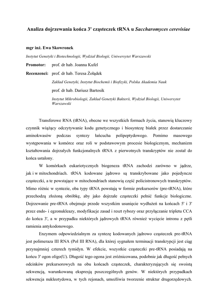 Analiza dojrzewania końca 3' cząsteczek tRNA u Saccharomyces cerevisiae mgr inż. Ewa Skowronek Instytut Genetyki i Biotechnologii, Wydział Biologii, Uniwersytet Warszawski Promotor: prof. dr hab. Joanna Kufel Recenzenci: prof. dr hab. Teresa Żołądek Zakład Genetyki, Instytut Biochemii i Biofizyki, Polska Akademia Nauk prof. dr hab. Dariusz Bartosik Instytut Mikrobiologii, Zakład Genetyki Bakterii, Wydział Biologii, Uniwersytet Warszawski Transferowe RNA (tRNA), obecne we wszystkich formach życia, stanowią kluczowy czynnik wiążący odczytywanie kodu genetycznego i biosyntezę białek przez dostarczanie aminokwasów podczas syntezy łańcucha polipeptydowego. Pomimo masowego występowania w komórce oraz roli w podstawowym procesie biologicznym, mechanizm kształtowania dojrzałych funkcjonalnych tRNA z pierwotnych transkryptów nie został do końca ustalony. W komórkach eukariotycznych biogeneza tRNA zachodzi zarówno w jądrze, jak i w mitochondriach. tRNA kodowane jądrowo są transkrybowane jako pojedyncze cząsteczki, a te powstające w mitochondriach stanowią część policistronowych transkryptów. Mimo różnic w syntezie, oba typy tRNA powstają w formie prekursorów (pre-tRNA), które przechodzą złożoną obróbkę, aby jako dojrzałe cząsteczki pełnić funkcje biologiczne. Dojrzewanie pre-tRNA obejmuje przede wszystkim usunięcie wydłużeń na końcach 5' i 3' przez endo- i egzonukleazy, modyfikacje zasad i reszt rybozy oraz przyłączanie tripletu CCA do końca 3', a w przypadku niektórych jądrowych tRNA również wycięcie intronu z pętli ramienia antykodonowego. Enzymem odpowiedzialnym za syntezę kodowanych jądrowo cząsteczek pre-tRNA jest polimeraza III RNA (Pol III RNA), dla której sygnałem terminacji transkrypcji jest ciąg przynajmniej czterech tymidyn. W efekcie, wszystkie cząsteczki pre-tRNA posiadają na końcu 3' ogon oligo(U). Długość tego ogona jest zróżnicowana, podobnie jak długość pełnych odcinków prekursorowych na obu końcach cząsteczek, charakteryzujących się swoistą sekwencją, warunkowaną ekspresją poszczególnych genów. W niektórych przypadkach sekwencja nukleotydowa, w tych rejonach, umożliwia tworzenie struktur drugorzędowych. Wszystkie powyższe cechy sprawiają, że pula drożdżowych, kodowanych jądrowo prekursorów tRNA stanowi niezwykle heterogenną grupę cząsteczek, a obróbka końca 3’ jest najmniej poznanym procesem w obrębie całego mechanizmu dojrzewania pre-tRNA. Dotychczas wiadomo było, że w drożdżach piekarskich Saccharomyces cerevisiae istnieją dwie ścieżki prowadzące do wykształcenia dojrzałego końca 3' tRNA – endonukleolityczna, proponowana jako główny mechanizm oraz egzonukleolityczna, określana również mianem alternatywnej. Dotrawianie końca 3' pre-tRNA przez egzonukleazy następuje w przypadku niezwiązania ogona 3' pre-tRNA przez białko Lhp1, które jako pierwsze wiąże ogon oligo(U) nowopowstałych pre-tRNA. Spośród enzymów aktywnych w tym procesie zidentyfikowano do tej pory dwie egzonukleazy - Rex1 i Rrp6. Rola drożdżowej RNazy Z (Trz1) wnioskowana była natomiast jedynie na podstawie doświadczeń in vitro oraz funkcji białek homologicznych. Wyniki zaprezentowane w rozprawie doktorskiej dowodzą in vivo zaangażowania endonukleazy Trz1 w obróbkę wydłużeń 3' pre-tRNA. Dodatkowo, potwierdzona została również w szerszym aspekcie rola egzonukleaz Rex1, Rrp6 i Rex2 w ścieżce alternatywnej, co pozwoliło na stwierdzenie, że istnieje pewna hierarchia ważności pomiędzy wyżej wymienionymi białkami, a ich funkcje w tym procesie nie w pełni pokrywają się. Wydaje się, że wbrew wcześniejszym przewidywaniom, większość pre-tRNA ulega dojrzewaniu w obu ścieżkach w podobnym stopniu. Jedynie cząsteczki charakteryzujące się niestandardowo długimi sekwencjami prekursorowymi po stronie 3' są ściśle uzależnione od aktywności Trz1. Możliwe, że trawienie egzonukleolityczne, niezależne od Trz1 i wiązania Lhp1, jest w przypadku tych prekursorów blokowane przez przewidziane in silico struktury typu spinki do włosów w obrębie tych sekwencji. Na przykładzie jednej z takich cząsteczek zaobserwowano, że zablokowanie dojrzewania końca 3' prowadzi do degradacji tRNA, zależnej od oligoadenylacji przez polimerazę poli(A) Trf4, która jest składnikiem kompleksu TRAMP. Zjawisko to stanowi element kontroli jakości tRNA, który zachodzi w jądrze komórkowym. Istnieją jednak przesłanki wskazujące, że adenylacja przez Trf4 może być również sygnałem kierującym niestabilne tRNA do degradacji na drodze RTD (ang. rapid tRNA decay). W ramach tej pracy pokazano, że kodowana jądrowo endonukleaza Trz1 jest odpowiedzialna również za dojrzewanie końca 3' mitochondrialnych tRNA (mt-tRNA). Mutacje w genie TRZ1 przyczyniają się do znacznej niestabilności genomu mitochondrialnego, charakteryzującego się utratą części regionów, szczególnie tych zawierających wyłącznie geny tRNA. Ponadto, brak Trz1 w mitochondriach skutkuje zanikiem dojrzałych form transkryptów mitochondrialnych ulegających ekspresji i akumulacją znacznie większych policistronowych prekursorów. Potwierdzono więc, że zgodnie z wcześniejszymi przewidywaniami, głównymi enzymami odpowiedzialnymi za kształtowanie dojrzałych mt-tRNA są endonukleazy – Trz1 oraz wcześniej zdefiniowana RNaza P. Stanowią one podstawę tzw. punktowego modelu dojrzewania mitochondrialnych policistronowych transkryptów, gdzie wycięcie cząsteczek tRNA przez te dwa enzymy jest jednocześnie pierwszym krokiem dojrzewania innych klas RNA kodowanych w tych samych jednostkach transkrypcyjnych. Przeprowadzone badania ukazały ponadto poboczną rolę innych nukleaz, Nuc1, Rex2 i Pet127, w obróbce mitochondrialnego transkryptu pre-tRNAfMet-RPM1-tRNAPro. Brak tych enzymów powoduje nasilenie akumulacji form prekursorowych lub występowanie dodatkowych produktów przejściowych