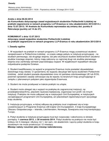 Zasady Wpisany przez Administrator poniedziałek, 20 czerwca 2011 19:54 - Poprawiony wtorek, 18 lutego 2014 13:22 Aneks z dnia 06.02.2014 do Komunikatu dotyczącego zasad wyjazdowych studentów Politechniki Łódzkiej na praktyki zagraniczne w ramach programu LLP-Erasmus w roku akademickim 2013/2014 z dnia 12.07.2013. W Aneksie do Komunikatu wprowadza się zmiany dot. punktu II Rekrutacja (punkty od 14 do 27). KOMUNIKAT z dnia 12.07.2013 dotyczący zasad wyjazdów studentów Politechniki Łódzkiej na praktyki zagraniczne w ramach programu LLP-Eramus w roku akademickim 2013/2014 I. Zasady ogólne 1. W wyjazdach na praktyki w ramach programu LLP-Erasmus mogą uczestniczyć studenci zarejestrowani w Politechnice Łódzkiej - w czasie całego pobytu w instytucji przyjmującej - na studiach pierwszego, lub drugiego stopnia, lub jako słuchacze studiów doktoranckich (studenci studiów trzeciego stopnia), którzy mają zaliczony co najmniej drugi rok studiów pierwszego stopnia oraz zamknięty semestr poprzedzający wyjazd. W wyjątkowych wypadkach decyzje indywidualne podejmie Dziekan. 2. Student kwalifikowany na wyjazd w programie Erasmus może posiadać obywatelstwo dowolnego kraju świata. O uprawnieniu do wyjazdu decyduje fakt bycia studentem Politechniki Łódzkiej. Jeżeli student posiada obywatelstwo inne niż państwa członkowskiego UE lub EOG, powinien sprawdzić zasady odnoszące się do wjazdu na terytorium kraju przyjmującego w związku z planowanym pobytem jako stypendysta Erasmusa. 3. Student nie może przebywać w trakcie praktyki na urlopie. 4. Student może ubiegać się o wyjazd na praktykę do zagranicznej instytucji, np. przedsiębiorstwa/firmy, placówki naukowo-badawczej, organizacji non-profit i do innych instytucji. Praktyka nie może odbywać się w instytucjach Unii Europejskiej, w instytucjach zarządzających programami Unii Europejskiej, ani placówkach dyplomatycznych ojczystego kraju studenta. 5. Instytucja przyjmująca, w której odbywa się praktyka musi znajdować się w kraju uczestniczącym w Programie Erasmus (28 krajów Unii Europejskich, 4 kraje Europejskiego Obszaru Gospodarczego – Islandia, Liechtenstein, Norwegia, Szwajcaria oraz kraj kandydujący Turcja). 6. Pobyt studenta w instytucji przyjmującej musi być rozpoczęty i zakończony w okresie pomiędzy 1 czerwca 2013, a 30 września 2014. Pobyt studenta na praktyce nie może być krótszy niż 3 miesiące i dłuższy niż 1, ten sam, rok akademicki. Łączny pobyt studenta w kraju docelowym nie może przekroczyć 12 miesięcy. Miesiąc należy rozumieć jako miesiąc kalendarzowy. 1 / 12 Zasady Wpisany przez Administrator poniedziałek, 20 czerwca 2011 19:54 - Poprawiony wtorek, 18 lutego 2014 13:22 7. Praktyka nie może być realizowana w dwóch różnych lokalizacjach (uczelniach, miastach, krajach). 8. Student otrzyma grant maksymalnie na 3 miesiące. Miesięczne stypendium dla studentów Politechniki Łódzkiej w ramach Programu Erasmus wyjeżdżających na praktykę w roku akademickim 2013/2014 dla każdego osobomiesiąca wynosi: o 550 Euro – grupa I (Dania, Finlandia, Francja, Irlandia, Islandia, Lichtenstein, Norwegia, Szwajcaria, Szwecja, Wielka Brytania); o 450 Euro – grupa II (Austria, Belgia, Chorwacja, Cypr, Grecja, Hiszpania, Holandia, Luksemburg, Malta, Niemcy, Portugalia, Słowenia, Turcja, Włochy); o 350 Euro – grupa III (Bułgaria, Czechy, Estonia, Litwa, Łotwa, Rumunia, Słowacja, Węgry). 9. Studenci PŁ otrzymują dofinansowanie do kosztów podróży na stypendium w wysokości 250 euro. Dofinansowanie będzie wypłacane w trakcie pobytu na stypendium z Funduszu na poziomie centralnym. Fundusz będzie realizował jednolity zryczałtowany system wypłat dla stypendystów. 10. Osoby niepełnosprawne z udokumentowanym stopniem niepełnosprawności, mogą ubiegać się w Agencji Narodowej Erasmusa o dodatkowe fundusze pochodzące ze specjalnego funduszu przeznaczonego dla osób niepełnosprawnych. O dofinansowanie należy ubiegać się przed wyjazdem na praktyki. Wniosek należy złożyć w pierwszym możliwym terminie, bezzwłocznie po zakwalifikowaniu na wyjazd stypendialny: do 15 czerwca 2013 r., do 1 sierpnia 2013 r., do 1 grudnia 2013 r., do 1 kwietnia 2014 r . Wskazane terminy to data wpłynięcia wniosku do Agencji Narodowej Erasmusa. Złożenie wniosku w późniejszym terminie może skutkować przyznaniem proporcjonalnie niższego dofinansowania lub odrzuceniem wniosku. Wniosek w imieniu Beneficjenta składa Sekcja Umiędzynarodowienia Edukacji DWZ PŁ. Zasady dotyczące wnioskowania i wzory formularzy są dostępne na stronie http://erasmus.p.lo dz.pl/dla-niepenosprawnych 11. Stypendium Programu Erasmus przyznaje się w celu odbycia praktyki związanej z kierunkiem kształcenia studenta. Praktyka musi gwarantować możliwość nabycia kompetencji związanych z kierunkiem kształcenia w PŁ. Wyjazd na praktykę wymaga pracy w pełnym wymiarze godzin uzgodnionym z instytucją przyjmującą. 12. Uczelnia macierzysta, instytucja przyjmująca i student zakwalifikowany na praktykę powinny 2 / 12 Zasady Wpisany przez Administrator poniedziałek, 20 czerwca 2011 19:54 - Poprawiony wtorek, 18 lutego 2014 13:22 zapoznać się z Kartą Jakości Praktyki Erasmusa - dokumentem określającym zadania i obowiązki uczelni macierzystej, instytucji przyjmującej i studenta w odniesieniu do organizacji praktyki studenckiej. 13. Student ma prawo wyjechać na praktykę zagraniczną w ramach Programu Erasmus jeden raz. Punkt II zgodnie z Aneksem do Komunikatu otrzymuje następujące brzmienie: II. Rekrutacja 14. Studenci PŁ chcący uzyskać dofinansowanie z Programu Erasmus poszukują indywidualnie miejsca odbycia praktyki. 15. Student zgłasza chęć wyjazdu na praktykę do Wydziałowego Koordynatora Erasmusa ds. Praktyk lub Administracyjnego Koordynatora w CKM PŁ. Student składa następujące dokumenty celem udziału w rekrutacji (wzory zamieszczone na stronie http://erasmus.p