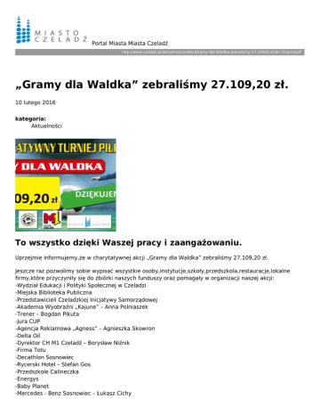 Portal Miasta Miasta Czeladź http://www.czeladz.pl/aktualnosci/index/Gramy-dla-Waldka-zebralismy-27.10920-zl/idn:35/printpdf „Gramy dla Waldka” zebraliśmy 27.109,20 zł. 10 lutego 2016 kategoria: Aktualności To wszystko dzięki Waszej pracy i zaangażowaniu. Uprzejmie informujemy,że w charytatywnej akcji „Gramy dla Waldka” zebraliśmy 27.109,20 zł. Jeszcze raz pozwolimy sobie wypisać wszystkie osoby,instytucje,szkoły,przedszkola,restauracje,lokalne firmy,które przyczyniły się do zbiórki naszych funduszy oraz pomagały w organizacji naszej akcji: -Wydział Edukacji i Polityki Społecznej w Czeladzi -Miejska Biblioteka Publiczna -Przedstawicieli Czeladzkiej Inicjatywy Samorządowej -Akademia Wyobraźni „Kajune” – Anna Polniaszek -Trener – Bogdan Pikuta -Jura CUP -Agencja Reklamowa „Agness” – Agnieszka Skowron -Delta Oil -Dyrektor CH M1 Czeladź – Borysław Niźnik -Firma Totu -Decathlon Sosnowiec -Rycerski Hotel – Stefan Gos -Przedszkole Calineczka -Energys -Baby Planet -Mercedes - Benz Sosnowiec – Łukasz Cichy -Eurocas Volvo – Marcin Feruś -Mad Mick - Drużynom biorącym udział w charytatywnym turnieju "Gramy dla Waldka” oraz wszystkim licytującym nasze przedmioty oraz gadżety podczas naszej imprezy. Wolontariusze z: -Miejskiego Zespołu Szkół w Czeladzi -Gimnazjum nr 2 w Czeladzi -Liceum Ogólnokształcącego im. Stanisława Staszica w Będzinie -Zespół Szkół Ogólnokształcących i Technicznych w Czeladzi Przedszkola: -Przedszkole nr 1,Przedszkole nr 4,Przedszkole nr 5,Przedszkole nr 7,Przedszkole nr 9 ,Przedszkole nr 10,Przedszkole nr 11 Szkoły: -Miejski Zespół Szkół w Czeladzi,Szkoła Podstawowa nr 1 ,Szkoła Podstawowa nr 3,Szkoła Podstawowa nr 7,Gimnazjum nr 2 oraz Liceum Ogólnokształcącego im. Stanisława Staszica w Będzinie, Zespół Szkół Ogólnokształcących i Technicznych w Czeladzi. Miejskie Instytucje: -Urząd Miejski Czeladź -Zakład Inżynierii Komunalnej w Czeladzi -Miejski Ośrodek Sportu i Rekreacji w Czeladzi -Miejski Zarząd Gospodarki Komunalnej -Czeladzkie Towarzystwo Budownictwa Społecznego -Zakład Budynków Komunalnych -Miejska Biblioteka Publiczna -Muzeum „Saturn” w Czeladzi Czeladzkie restauracje: -Cafe desa -Restauracja i hotel rycerski -Restauracja Szafran -Lawendowy dom -Restauracja pod filarami -Art-face -Pizzeria Maximus JESZCZE RAZ WIELKIE DZIĘKI!! SZACUN DLA WAS!!