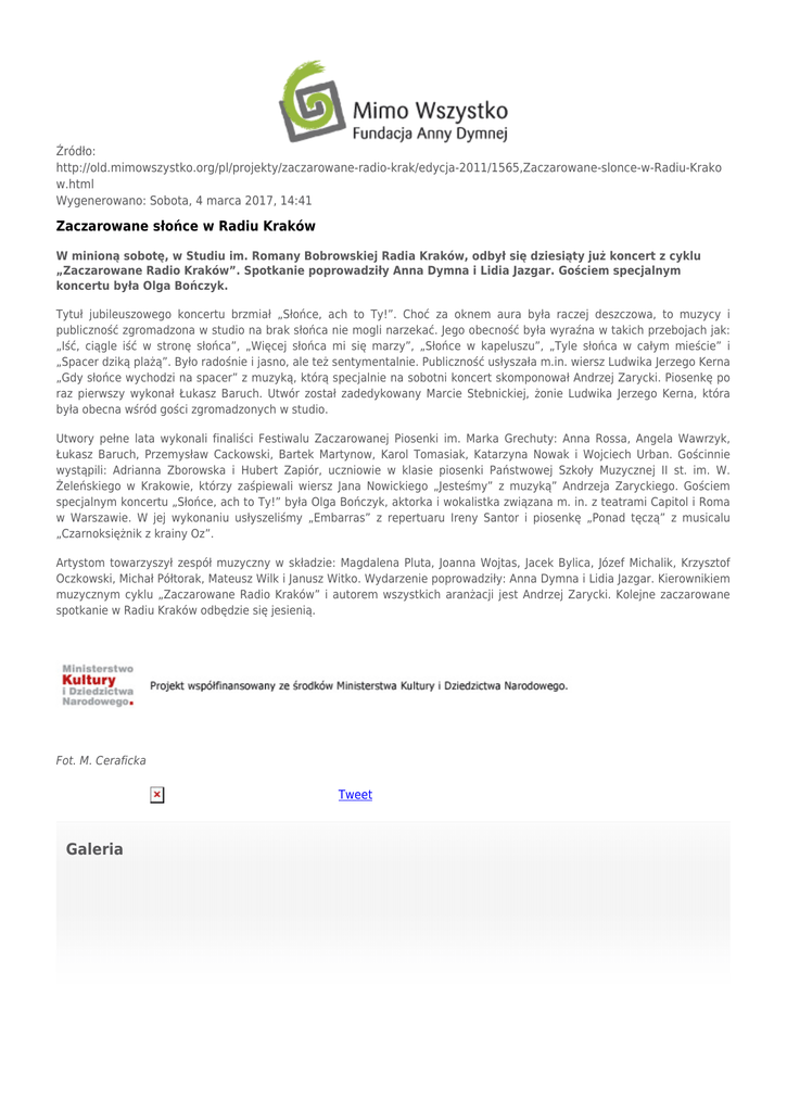 Źródło: http://old.mimowszystko.org/pl/projekty/zaczarowane-radio-krak/edycja-2011/1565,Zaczarowane-slonce-w-Radiu-Krako w.html Wygenerowano: Sobota, 4 marca 2017, 14:41 Zaczarowane słońce w Radiu Kraków W minioną sobotę, w Studiu im. Romany Bobrowskiej Radia Kraków, odbył się dziesiąty już koncert z cyklu „Zaczarowane Radio Kraków”. Spotkanie poprowadziły Anna Dymna i Lidia Jazgar. Gościem specjalnym koncertu była Olga Bończyk. Tytuł jubileuszowego koncertu brzmiał „Słońce, ach to Ty!”. Choć za oknem aura była raczej deszczowa, to muzycy i publiczność zgromadzona w studio na brak słońca nie mogli narzekać. Jego obecność była wyraźna w takich przebojach jak: „Iść, ciągle iść w stronę słońca”, „Więcej słońca mi się marzy”, „Słońce w kapeluszu”, „Tyle słońca w całym mieście” i „Spacer dziką plażą”. Było radośnie i jasno, ale też sentymentalnie. Publiczność usłyszała m.in. wiersz Ludwika Jerzego Kerna „Gdy słońce wychodzi na spacer” z muzyką, którą specjalnie na sobotni koncert skomponował Andrzej Zarycki. Piosenkę po raz pierwszy wykonał Łukasz Baruch. Utwór został zadedykowany Marcie Stebnickiej, żonie Ludwika Jerzego Kerna, która była obecna wśród gości zgromadzonych w studio. Utwory pełne lata wykonali finaliści Festiwalu Zaczarowanej Piosenki im. Marka Grechuty: Anna Rossa, Angela Wawrzyk, Łukasz Baruch, Przemysław Cackowski, Bartek Martynow, Karol Tomasiak, Katarzyna Nowak i Wojciech Urban. Gościnnie wystąpili: Adrianna Zborowska i Hubert Zapiór, uczniowie w klasie piosenki Państwowej Szkoły Muzycznej II st. im. W. Żeleńskiego w Krakowie, którzy zaśpiewali wiersz Jana Nowickiego „Jesteśmy” z muzyką” Andrzeja Zaryckiego. Gościem specjalnym koncertu „Słońce, ach to Ty!” była Olga Bończyk, aktorka i wokalistka związana m. in. z teatrami Capitol i Roma w Warszawie. W jej wykonaniu usłyszeliśmy „Embarras” z repertuaru Ireny Santor i piosenkę „Ponad tęczą” z musicalu „Czarnoksiężnik z krainy Oz”. Artystom towarzyszył zespół muzyczny w składzie: Magdalena Pluta, Joanna Wojtas, Jacek Bylica, Józef Michalik, Krzysztof Oczkowski, Michał Półtorak, Mateusz Wilk i Janusz Witko. Wydarzenie poprowadziły: Anna Dymna i Lidia Jazgar. Kierownikiem muzycznym cyklu „Zaczarowane Radio Kraków” i autorem wszystkich aranżacji jest Andrzej Zarycki. Kolejne zaczarowane spotkanie w Radiu Kraków odbędzie się jesienią. Fot. M. Ceraficka Tweet Galeria Koncert prowadziły Anna Dymna i Lidia Jazgar Koncert rozpoczął się piosenką „Zacznij od Bacha” w wykonaniu Bartka Martynówa Łukasz Baruch zaśpiewał utwór „Gdy słońce wychodzi na spacer”, do którego muzykę, specjalnie na ten koncert, skomponował Andrzej Zarycki Katarzyna Nowak, poza występem, zaprosiła słuchaczy Radia Kraków na premierę swojej książki, pt. „12 kropel życia”, która ukaże się jesienią tego roku Wojtek Urban Andrzej Zarycki Adrianna Zborowska i Hubert Zapiór, uczniowie Andrzeja Zaryckiego Angela Wawrzyk Publiczność jak zawsze dopisała! Przemek Cackowski, laureat 6. Edycji Festiwalu Zaczarowanej Piosenki Anna Rossa zaśpiewała publiczności zgromadzonej w studio, wielki przebój zespołu Maanam, pt. „Cykady na cykladach” Gościem specjalnym koncertu była Olga Bończyk, która przyjechała do nas specjalnie z Warszawy Olga Bończyk zaśpiewała dwie piosenki: „Embarras” z repertuaru Ireny Santor oraz „Ponad tęczą” z musicalu „Czarnoksiężnik z krainy Oz” W pewnym momencie zrobiło się całkiem tęczowo :-) Karol Tomasiak wykonał finałową piosenkę, pt. „Tyle słońca w całym mieście” A na bis, całkiem z zaskoczenia, zaśpiewała podopieczna Warsztatów Terapii Artystycznej w Radwanowicach A na koniec... autografy i pamiątkowe zdjęcia