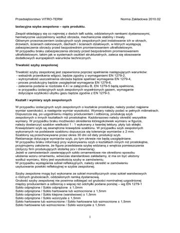 Przedsiębiorstwo VITRO-TERM Norma Zakładowa 2010.02 Izolacyjna szyba zespolona – opis produktu. Zespół składający się co najmniej z dwóch tafli szkła, oddzielonych ramkami dystansowymi, hermetycznie uszczelniony wzdłuż obrzeża, mechanicznie stabilny i trwały. Głównym przeznaczeniem izolacyjnych szyb zespolonych jest instalowanie ich w oknach, drzwiach, ścianach osłonowych, dachach i ścianach działowych, w których występują zabezpieczenia obrzeży przed bezpośrednim promieniowaniem ultrafioletowym. W przypadku braku zabezpieczenia obrzeży przed bezpośrednim promieniowaniem ultrafioletowym, takim jak w systemach oszkleń strukturalnych, zaleca się stosowanie dodatkowych europejskich warunków technicznych. Trwałość szyby zespolonej Trwałość szyby zespolonej jest zapewniona poprzez spełnienie następujących warunków: - wskaźnik przenikania wilgoci, będzie zgodny z wymaganiami EN 1279-2, - wytrzymałość uszczelnienia obrzeża będzie spełniać wymagania EN 1279-4, - proces produkcyjny będzie uwzględniał wymagania EN 1279-6, - zalecenia podane w rozdziale 4.4 i w załączniku B, EN 1279-5 będą spełnione, - w przypadku izolacyjnych szyb zespolonych wypełnionych gazem, wymaganie dotyczące szybkości ubytku gazu będzie zgodne z EN 1279-3. Kształt i wymiary szyb zespolonych W przypadku izolacyjnych szyb zespolonych o kształcie prostokąta, należy podać najpierw wymiar szerokości, a następnie wymiar wysokości. Wymiary należy podać w pełnych milimetrach. Dopuszcza się, po uzgodnieniu między producentem i odbiorcą, produkcję szyb zespolonych o innych kształtach niż prostokątne. Każdorazowo należy określić wszystkie wymiary. W przypadku braku możliwości określenia któregokolwiek wymiaru w figurze, należy dostarczyć szablon wielkości 1 : 1 wykonany z twardej tektury, płyty lub sklejki. Krawędziami szyb są zewnętrzne krawędzie szablonu. W przypadku szyb zespolonych wykonanych na podstawie szablonu dopuszcza się tolerancje wymiarów ± 2 mm. Szablony są przechowywane przez okres 30 dni od daty produkcji szyb. Reklamacje dotyczące wymiarów szyb, po tym okresie nie będą uwzględniane. W przypadku braku informacji przy wykonywaniu szyb o kształtach innych niż prostokątne, przyjmujemy założenie, że figura przedstawia szybę widzianą z wnętrza pomieszczenia (dotyczy firm produkujących stolarkę pcv i drewnianą). Jeżeli w zamówieniach zawierających szkło ornamentowe nie określono sposobu ułożenia wzoru ornamentu, wówczas standardowo zakładamy, iż ma on być ułożony wzdłuż wymiaru, który jest wysokością szyby w zamówieniu. W przypadku wystąpienia szkieł refleksyjnych, należy określić w zamówieniu usytuowanie powłoki refleksyjnej w szybie zespolonej. Szyby zespolone mogą być wykonane ze szkieł monolitycznych oraz szkieł warstwowych o różnych grubościach, oddzielonych ramką dystansową. Grubość szyby zespolonej nie powinna odbiegać od grubości nominalnej uzgodnionej między producentem a odbiorcą o więcej niż odchyłki podane poniżej – wg EN 1279-1 Szkło odprężone / Szkło odprężone ± 1,0mm Szkło odprężone / Szkło hartowane lub wzmocnione ± 1,5mm Szkło odprężone / Szkło klejone (warstwowe) ± 1,5mm Szkło odprężone / Szkło wzorzyste ± 1,5mm Szkło hartowane lub wzmocnione / Szkło hartowane lub wzmocnione ± 1,5mm Szkło hartowane lub wzmocnione / Szkło wzorzyste ± 1,5mm 1 Przedsiębiorstwo VITRO-TERM Norma Zakładowa 2010.02 Skuteczność uszczelnienia szyb zespolonych wg PN-EN 1279 Szkło w budownictwie. Szyby zespolone izolacyjne. Przenikanie pary wodnej – obowiązująca metoda PN-EN 1279-2 Adhezja szczeliwa do szkła – obowiązująca metoda PN-EN 1279-4 Szybkość ubytku gazu – obowiązująca metoda PN-EN 1279-3 Koncentracja gazu – obowiązująca metoda PN-EN 1279-6 Załącznik A.3 Materiały Szkło. Rodzaj i jakość szkła uzgadnia się miedzy producentem i odbiorcą przed przystąpieniem do wykonywania zlecenia. W zespoleniach stosuje się: a) podstawowe wyroby ze szkła według EN 572-1: • • • • • szkło float wg EN 572-2 szkło zbrojone polerowane według EN 572-3 szkło płaskie ciągnione według EN 572-4 wzorzyste szkło walcowane według EN 572-5 wzorzyste szkło zbrojone wg EN 572-6 b) podstawowe wyroby ze szkła specjalnego: • szkło borokrzemianowe według EN 1748-1-1 • tworzywa szklano-krystaliczne według EN 1748-2-1 • szkło krzemianowe z tlenkami metali ziem alkalicznych według prEN 14178-1 c) szkła przetworzone: • termicznie wzmocnione szkło sodowo-wapniowo-krzemianowe według EN 1863-1 • termicznie hartowane szkło sodowo-wapniowo-krzemianowe według EN 12150-1 • termicznie hartowane, wygrzewane, bezpieczne szkło sodowo-wapniowo-krzemianowe według prEN 14179-1 • chemicznie wzmocnione szkło sodowo-wapniowo-krzemianowe według EN 12337-1 • termicznie hartowane bezpieczne szkło borokrzemianowe według EN 13024-1 • termicznie hartowane bezpieczne szkło krzemianowe z tlenkami metali ziem alkalicznych według prEN 14321-1 szkło warstwowe i bezpieczne szkło warstwowe według EN 12543 –1,-2,-3 • szkło powlekane według EN 1096-1 • szkło o obrabianej powierzchni (np. piaskowane, wytrawiane kwasem) d) lub inne szkła przetworzone, np. kompozyt szkło-tworzywo sztuczne, składające się co najmniej z jednego wyrobu szklanego podstawowego lub przetworzonego podanego wyżej oraz co najmniej z jednej warstwy płyt tworzywa sztucznego, e) lub inne szkła objęte lub nie, europejskimi specyfikacjami. Tafle szklane, przetworzone lub nie, mogą być: • przezroczyste, przejrzyste lub nieprzezroczyste • bezbarwne lub barwne Pozostałe materiały potrzebne do wykonania szyb zespolonych powinny zapewnić jakość wyrobu zgodną z wymaganiami normy EN 1279 -1÷6 2 Przedsiębiorstwo VITRO-TERM Norma Zakładowa 2010.02 Wykonanie Technologia wykonania szyb ma zapewnić ich odpowiednią jakość. O