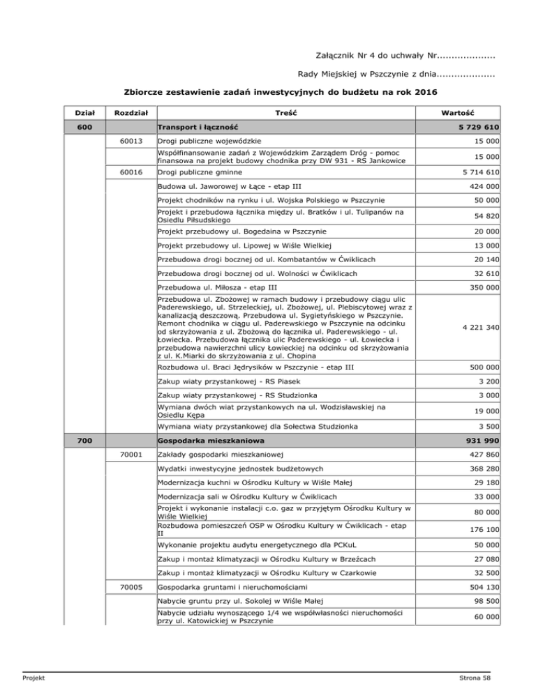 Załącznik Nr 4 do uchwały Nr.................... Rady Miejskiej w Pszczynie z dnia.................... Zbiorcze zestawienie zadań inwestycyjnych do budżetu na rok 2016 Dział Rozdział 600 60013 60016 Budowa ul. Jaworowej w Łące - etap III Projekt chodników na rynku i ul. Wojska Polskiego w Pszczynie 50 000 Projekt i przebudowa łącznika między ul. Bratków i ul. Tulipanów na Osiedlu Piłsudskiego 54 820 Projekt przebudowy ul. Bogedaina w Pszczynie 20 000 Projekt przebudowy ul. Lipowej w Wiśle Wielkiej 13 000 Przebudowa drogi bocznej od ul. Kombatantów w Ćwiklicach 20 140 Przebudowa drogi bocznej od ul. Wolności w Ćwiklicach 32 610 Przebudowa ul. Miłosza - etap III Przebudowa ul. Zbożowej w ramach budowy i przebudowy ciągu ulic Paderewskiego, ul. Strzeleckiej, ul. Zbożowej, ul. Plebiscytowej wraz z kanalizacją deszczową. Przebudowa ul. Sygietyńskiego w Pszczynie. Remont chodnika w ciągu ul. Paderewskiego w Pszczynie na odcinku od skrzyżowania z ul. Zbożową do łącznika ul. Paderewskiego - ul. Łowiecka. Przebudowa łącznika ulic Paderewskiego - ul. Łowiecka i przebudowa nawierzchni ulicy Łowieckiej na odcinku od skrzyżowania z ul. K.Miarki do skrzyżowania z ul. Chopina Rozbudowa ul. Braci Jędrysików w Pszczynie - etap III Zakup wiaty przystankowej - RS Piasek 3 200 Zakup wiaty przystankowej - RS Studzionka 3 000 Wymiana dwóch wiat przystankowych na ul. Wodzisławskiej na Osiedlu Kępa Wymiana wiaty przystankowej dla Sołectwa Studzionka 700 Gospodarka mieszkaniowa 70001 Transport i łączność Wartość 5 729 610 Drogi publiczne wojewódzkie 15 000 Współfinansowanie zadań z Wojewódzkim Zarządem Dróg - pomoc finansowa na projekt budowy chodnika przy DW 931 - RS Jankowice 15 000 Drogi publiczne gminne 5 714 610 424 000 350 000 4 221 340 500 000 19 000 3 500 931 990 Zakłady gospodarki mieszkaniowej 427 860 Wydatki inwestycyjne jednostek budżetowych 368 280 Modernizacja kuchni w Ośrodku Kultury w Wiśle Małej 29 180 Modernizacja sali w Ośrodku Kultury w Ćwiklicach 33 000 Wykonanie projektu audytu energetycznego dla PCKuL 50 000 Zakup i montaż klimatyzacji w Ośrodku Kultury w Brzeźcach 27 080 Zakup i montaż klimatyzacji w Ośrodku Kultury w Czarkowie 32 500 70005 Nabycie gruntu przy ul. Sokolej w Wiśle Małej 98 500 Nabycie udziału wynoszącego 1/4 we współwłasności nieruchomości przy ul. Katowickiej w Pszczynie 60 000 Projekt Treść Projekt i wykonanie instalacji c.o. gaz w przyjętym Ośrodku Kultury w Wiśle Wielkiej Rozbudowa pomieszczeń OSP w Ośrodku Kultury w Ćwiklicach - etap II Gospodarka gruntami i nieruchomościami 80 000 176 100 504 130 Strona 58 Projekt Pomoc finansowa dla Powiatu Pszczyńskiego na wykup gruntów pod Centrum Przesiadkowe w Pszczynie 750 Administracja publiczna 75023 345 630 100 000 Urzędy gmin (miast i miast na prawach powiatu) 100 000 100 000 Zakup elementów aktywnych sieci, drukarek, kserokopiarek, urządzeń wielofunkcyjnych, zestawy komputerowe oraz licencyjne oprogramowanie 754 Bezpieczeństwo publiczne i ochrona przeciwpożarowa 75404 75412 Rozbudowa garażu w OSP W Rudołtowicach Zakup motopompy dla OSP w Wiśle Małej Zakup samochodu ratowniczo-gaśniczego dla OSP Studzionka 801 Oświata i wychowanie 80101 Budowa skoczni w dal przy ZS2 w Pszczynie 34 870 Projekt i budowa chodnika przy ZSP w Wiśle Małej 19 200 Projekt i rozbudowa ZSP w Piasku 250 000 Rozbudowa SP Nr 15 w Jankowicach 340 000 Wykonanie projektu rozbudowy SP Nr 11 w Porębie o salę gimnastyczną z zapleczem w sołectwie Poręba 52 890 Zagospodarowanie i rozbudowa placu zabaw przy ZSP w Czarkowie 20 000 Zagospodarowanie terenu przy ZSP w Studzienicach oraz kontynuacja budowy boiska wielofunkcyjnego ogólnodostępnego wraz z zagospodarowaniem terenu przy ZSP Studzienice 70 880 Zagospodarowanie terenu wokół ZSP w Jankowicach 83 940 Zakup i montaż sceny modułowej przy ZSP w Wiśle Wielkiej 61 150 Zakup urządzenia wielofunkcyjnego do ZSP w Studzienicach 11 000 80104 400 830 Komendy wojewódzkie Policji 36 000 Dofinansowanie zakupu samochodu dla KPP w Pszczynie 36 000 Ochotnicze straże pożarne Szkoły podstawowe Poprawa efektywności energetycznej budynków publicznych w gminie Pszczyna - projekt i termomodernizacja SP Nr 1 w Pszczynie Poprawa efektywności energetycznej budynków publicznych w gminie Pszczyna - termomodernizacja SP Nr 13 w Wiśle Małej 364 830 55 000 9 830 300 000 4 796 730 4 443 930 2 500 000 1 000 000 Przedszkola 332 000 250 000 Adaptacja i rozbudowa budynku mieszkalnego w Porębie na przedszkole Budowa placu zabaw przy PP8 - ogródek zabawowy dla najmłodszych 82 000 80148 Stołówki szkolne i przedszkolne 20 800 Zakup zmywarki do PP14 w Studzionce Zakup zmywarki do ZSP w Piasku 851 Ochrona zdrowia 85195 5 000 15 800 100 000 Pozostała działalność 100 000 Dotacja na budowę Hospicjum na terenie Gminy Pszczyna 100 000 853 Pozostałe zadania w zakresie polityki społecznej 12 000 85305 Żłobki 12 000 Zakup wózków 6 osobowych dla dzieci 12 000 900 Gospodarka komunalna i ochrona środowiska 90004 Utrzymanie zieleni w miastach i gminach 5 914 370 40 000 Strona 59 Projekt 90008 Zagospodarowanie ronda na skrzyżowaniu ulic Cieszyńskiej, Bielskiej, Korfantego w Pszczynie 40 000 Ochrona różnorodności biologicznej i krajobrazu 1 500 000 Ochrona różnorodności biologicznej poprzez rewitalizację Parku Zwierzyniec 1 500 000 Oświetlenie ulic, placów i dróg 3 749 370 90015 Budowa oświetlenia na ul. Powstańców Śląskich w Studzionce Budowa oświetlenia przejścia dla pieszych przy ul. Męczenników Oświęcimskich w Pszczynie - ZO Daszyńskiego 4 000 Budowa oświetlenia przy ul. Leśnej w Piasku - RS Piasek 4 000 Budowa oświetlenia przy ul. Powstańców Śląskich w Studzionce - RS Studzionka 9 000 Dobudowa oświetlenia ulicznego w Ćwiklicach koło kościoła 9 020 Przebudowa oświetlenia na terenie gminy Pszczyna Wykonanie projektu oświetlenia ul. Adelajdy w Studzionce 90019 90095 Poprawa efekty