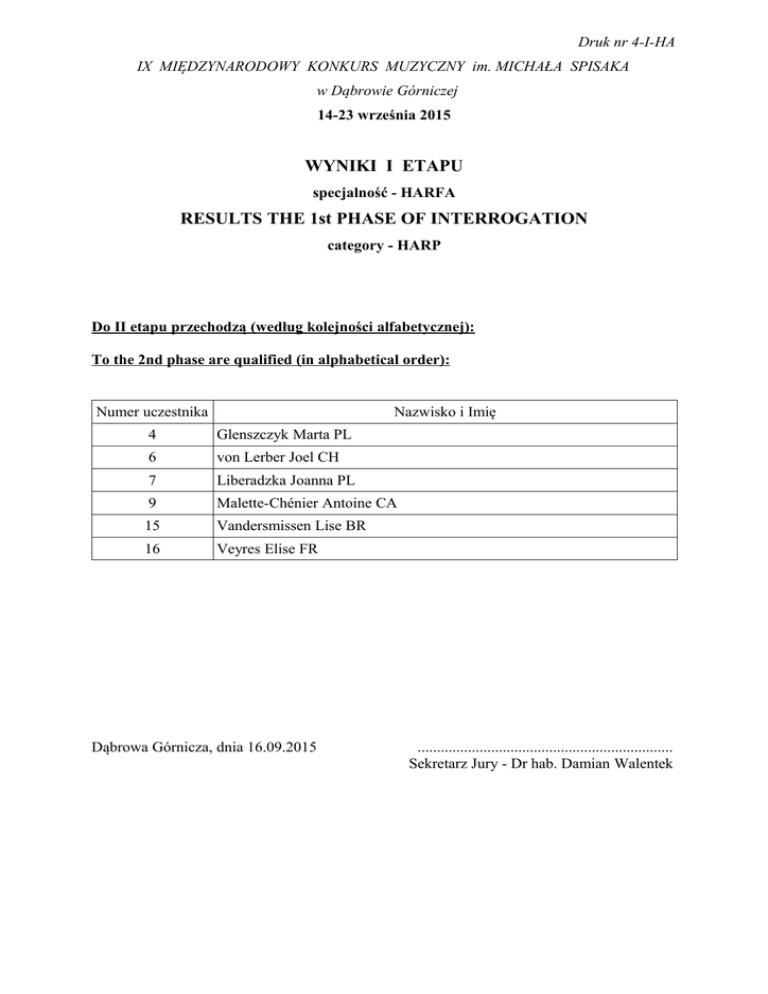 Druk nr 4-I-HA IX MIĘDZYNARODOWY KONKURS MUZYCZNY im. MICHAŁA SPISAKA w Dąbrowie Górniczej 14-23 września 2015 WYNIKI I ETAPU specjalność - HARFA RESULTS THE 1st PHASE OF INTERROGATION category - HARP Do II etapu przechodzą (według kolejności alfabetycznej): To the 2nd phase are qualified (in alphabetical order): Numer uczestnika Nazwisko i Imię 4 Glenszczyk Marta PL 6 von Lerber Joel CH 7 Liberadzka Joanna PL 9 Malette-Chénier Antoine CA 15 Vandersmissen Lise BR 16 Veyres Elise FR Dąbrowa Górnicza, dnia 16.09.2015 .................................................................. Sekretarz Jury - Dr hab. Damian Walentek