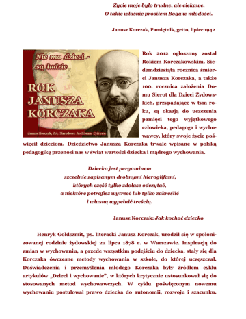 Życie moje było trudne, ale ciekawe. O takie właśnie prosiłem Boga w młodości. Janusz Korczak, Pamiętnik, getto, lipiec 1942 Rok 2012 ogłoszony został Rokiem Korczakowskim. Siedemdziesiąta rocznica śmierci Janusza Korczaka, a także 100. rocznica założenia Domu Sierot dla Dzieci Żydowskich, przypadające w tym roku, są okazją do uczczenia pamięci tego wyjątkowego człowieka, pedagoga i wychowawcy, który swoje życie poświęcił dzieciom. Dziedzictwo Janusza Korczaka trwale wpisane w polską pedagogikę przenosi nas w świat wartości dziecka i mądrego wychowania. Dziecko jest pergaminem szczelnie zapisanym drobnymi hieroglifami, których część tylko zdołasz odczytać, a niektóre potrafisz wytrzeć lub tylko zakreślić i własną wypełnić treścią. Janusz Korczak: Jak kochać dziecko Henryk Goldszmit, ps. literacki Janusz Korczak, urodził się w spolonizowanej rodzinie żydowskiej 22 lipca 1878 r. w Warszawie. Inspiracją do zmian w wychowaniu, a przede wszystkim podejściu do dziecka, stały się dla Korczaka ówczesne metody wychowania w szkole, do której uczęszczał. Doświadczenia i przemyślenia młodego Korczaka były źródłem cyklu artykułów „Dzieci i wychowanie”, w których krytycznie ustosunkował się do stosowanych metod wychowawczych. W cyklu poświęconym nowemu wychowaniu postulował prawo dziecka do autonomii, rozwoju i szacunku. Po śmierci ojca, Korczak w wieku 18 lat wziął na siebie obowiązek utrzymania rodziny dorabiając korepetycjami. W tym samym czasie studiował na Wydziale Lekarskim Uniwersytetu Warszawskiego. Po otrzymaniu dyplomu lekarza w 1903 r. podjął pracę jako pediatra w Szpitalu dla dzieci im. Bersonów i Baumanów. Dzięki swoim publikacjom, a także sumiennie wykonywanej pracy lekarza i podejściu do dziecka stał się znanym i poszukiwanym pediatrą w Warszawie. Studiując również za granicą, w Berlinie i Paryżu, Korczak stale podnosił swoje kwalifikacje, odbywał praktykę w klinikach dziecięcych, analizował metody pracy w zakładach wychowawczych. Współpracował z wieloma redakcjami czasopism, między innymi z „Głosem”, „Przeglądem Społecznym” i „Czytelnią dla Wszystkich”, w których publikował założenia nowych metod wychowawczych. Nie ma dzieci – są ludzie, ale o innej skali pojęć, innym zasobie doświadczenia, innych popędach, innej grze uczuć. Pamiętaj, że my ich nie znamy. Janusz Korczak W 1912 r. Korczak ostatecznie rozstał się z pracą w szpitalu i założył Dom Sierot dla Dzieci Żydowskich w Warszawie, którego dyrektorem pozostał do śmierci. W 1919 r. wraz z Maryną Falską i Marią Podwysocką założył również zakład wychowawczy Nasz Dom w Pruszkowie koło Warszawy. W Domu Sierot przy ulicy Krochmalnej 92 (obecna ulica Jaktorowska) współpracę z Korczakiem podjęła Stefania Wilczyńska, która pomagała Korczakowi wdrażać jego autorskie koncepcje pedagogiczne o ra z sama twórczo przyczyniała się do rozwoju placówki. Sierociniec funkcjonował do 1939 r., a podczas niemieckiej okupacji, dzieci wraz z wychowawcami zmuszone były przenieść się do getta. Dzięki staraniom Korczaka Dom Sierot Żydowskich początkowo przeniesiono do budynku szkoły kupieckiej przy ul. Chłodnej 33, a potem do gmachu Towarzystwa Pracowników Handlowych i Przemysłowych, położonego między ulicami Sienną a Śliską. Życie w getcie stawało się jednak coraz trudniejsze. Dnia 22 lipca 1942 r. rozpoczęła się dramatyczna akcja likwidacyjna getta. 6 sierpnia Janusz Korczak wraz z dziećmi wyprowadzeni zostali na Umschlagplatz, skąd wywiezieno ich do Treblinki. Dzisiaj, przed Pałacem Kultury i Nauki, gdzie znajdował się żydowski sierociniec, stoi pomnik upamiętniający to wyjątkowe miejsce, z którego Korczak wraz z gromadą dwustu dzieci wyruszył na śmierć w komorach gazowych. Jedno słońce nam przyświeca, jeden grad niszczy nasze łany i jedna ziemia kryje kości przodków naszych. Janusz Korczak: Społeczeństwo, 1910 Założenia pedagogiki Janusza Korczaka: dziecku należy się szacunek, powinno być traktowane jako podmiot, gdyż rozwija się dzięki własnej aktywności wychowanie powinno być traktowane jako proces oparty na partnerstwie dziecko powinno mieć zapewnione prawo do opieki całe społeczeństwo dorosłych powinno być odpowiedzialne za warunki życia dziecka powinno się poszukiwać i pogłębiać wiedzę o dziecku wszelkie techniki zastosowane w działaniach pedagogicznych powinny wynikać z założeń danego systemu opiekuńczo – wychowawczego Korczak przyczynił się do rozwoju nurtu tzw. Nowego Wychowania. Uważany jest za człowieka, który zapoczątkował walkę o prawa dziecka. W swoich poglądach nieustannie podkreślał potrzebę indywidualnego podejścia wychowawcy do każdego dziecka, wyjątkową jego rolę w życiu społecznym, akcentowanie i przestrzeganie jego praw. Dzieci to przyszli ludzie. Więc dopiero będą, więc jakby ich jeszcze nie było. A przecież jesteśmy: żyjemy, czujemy, cierpimy. Janusz Korczak: Szare dni, Pisma wybrane t. III