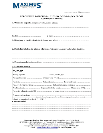 ………………….., dnia ..................... ZGŁOSZENIE ROSZCZENIA Z POLISY OC ZARZĄDCY DROGI (Wypełnia poszkodowany) 1. Właściciel pojazdu /imię i nazwisko, adres, telefon/ ................................................................................................................................................... .................................................................................................................................................. telefon............................................ e-mail: …………………………………………… 2. Kierujący w chwili szkody /imię i nazwisko, adres/ ……………………………………... ………………………………………………………………………………………………… 3. Dokładna lokalizacja miejsca zdarzenia /miejscowość, nazwa ulicy, km drogi itp. / ....................................................................................................................................................... ....................................................................................................................................................... 4. Czas zdarzenia / data , godzina / ............................................................................................ 5. Przedmiot szkody POJAZD Rodzaj pojazdu .................................................. Marka, model, typ ....................................................... Nr rejestracyjny .............................. nr nadwozia (VIN) ............................................................. Nr silnika ............................................. Rok produkcji ................... Kolor nadwozia ............................ Nr dowodu rejestracyjnego ...................................... Badania techniczne waŜne do ............................... Przebieg (km) .................................. Pojemność silnika (cm³) ..................... Moc silnika (kW) …….. Nr polisy ubezpieczenia OC .............................. wydana przez .................................................. Przeznaczenie pojazdu .............................................................................................................................. (uŜytek własny, transport zarobkowy, działalność gospodarcza, inne – opisać) Szkoda poza pojazdem TAK NIE 6. Okoliczności ....................................................................................................................................................... ....................................................................................................................................................... .................................................................................................................................................... .................................................................................................................................................... ..................................................................................................................................................... .................................................................................................................................................... Maximus Broker Sp. z o.o., ul. Szosa Chełmińska 164, 87-100 Toruń NIP 879-22-84-447, Sąd Rejonowy w Toruniu, VII Wydział Gospodarczy ,KRS: 0000030991 Kapitał zakładowy, który został opłacony w całości: 135 000 zł Firma posiada system zarządzania jakością zgodny z wymogami ISO 9001:2008 e-mail : [email protected], tel fax (0-56) 664-47-06 7. Prędkość pojazdu w chwili zdarzenia …………………………………………………… 8. Warunki atmosferyczne / deszcz, śnieg, oblodzenie, bez opadów, noc, dzień/ ...................................................................................................................................................... ZAKRES USZKODZEŃ POJAZDU Opis uszkodzeń powstałych w wyniku ww. zdarzenia Prosimy o zaznaczenie znakiem X uszkodzonych części ....................................................................................... ....................................................................................... ....................................................................................... ....................................................................................... ....................................................................................... ....................................................................................... ....................................................................................... ....................................................................................... ....................................................................................... ....................................................................................... Przód ....................................................................................... ....................................................................................... 9. Czy wypadek zgłoszono Policji lub StraŜy Miejskiej bądź Pogotowiu Ratunkowemu? Czy słuŜby te interweniowały na miejscu zdarzenia ?Jeśli tak podać nazwę jednostki oraz jej adres: ....................................................................................................................................................... ..................................................................................................................................................... 10. Domniemana przyczyna zdarzenia / zdaniem poszkodowanego/ ....................................................................................................................................................... ................................................................................................