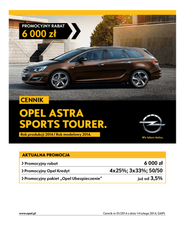 PROMOCYJNY RABAT 6 000 zł Cennik OPEL ASTRA SPORTS TOURER. Rok produkcji 2014 / Rok modelowy 2014. AKTUALNA PROMOCJA Promocyjny rabat Promocyjny Opel Kredyt Promocyjny pakiet „Opel Ubezpieczenie” www.opel.pl 6 000 zł 4x25%; 3x33%; 50/50 już od 3,5% Cennik nr 01/2014 z dnia 14 lutego 2014, GMPL Cennik – Opel Astra Sports Tourer Rok produkcji 2014, rok modelowy 2014 Ceny promocyjne* Essentia Enjoy Cosmo Sport 1.4 Twinport 100 KM M5 61 500 65 400 – – 1.6 Twinport 115 KM M5 64 500 68 400 73 700 73 950 1.6 Twinport 115 KM A6 – 73 400 78 700 78 950 1.4 Turbo 120 KM** M6 67 500 71 400 76 700 76 950 1.4 Turbo 140 KM** M6 69 500 73 400 78 700 78 950 1.4 Turbo 140 KM A6 – 78 400 83 700 83 950 1.4 Turbo 140 KM LPGTEC M6 75 900 78 400 83 700 83 950 1.6 Turbo 170 KM Start/Stop M6 – – 85 400 85 650 1.6 Turbo 170 KM A6 – – 89 200 89 450 1.7 CDTI 110 KM** M6 74 900 78 800 84 100 84 350 1.6 CDTI 110 KM*** M6 – 80 000 85 300 85 550 1.7 CDTI 130 KM** M6 – 81 200 86 500 86 750 1.6 CDTI 136 KM Start/Stop M6 – 82 400 87 700 87 950 2.0 CDTI 165 KM** M6 – – 91 800 92 050 2.0 CDTI 165 KM A6 – – 96 800 97 050 * Liczba modeli w promocji ograniczona. Promocja dostępna do wyczerpania zapasów. Dokładny opis całej oferty promocyjnej znajduje się na stronie www.opel.pl w sekcji promocje lub dostępny jest u Autoryzowanego Dystrybutora marki Opel. Ceny promocyjne dotyczą klientów indywidualnych. Klientów flotowych w sprawie zapytań ofertowych prosimy o kontakt z wybranym Autoryzowanym Dystrybutorem marki Opel. Ceny katalogowe Essentia Enjoy Cosmo Sport 1.4 Twinport 100 KM M5 67 500 71 400 – – 1.6 Twinport 115 KM M5 70 500 74 400 79 700 79 950 1.6 Twinport 115 KM A6 – 79 400 84 700 84 950 1.4 Turbo 120 KM** M6 73 500 77 400 82 700 82 950 1.4 Turbo 140 KM** M6 75 500 79 400 84 700 84 950 1.4 Turbo 140 KM A6 – 84 400 89 700 89 950 1.4 Turbo 140 KM LPGTEC M6 81 900 84 400 89 700 89 950 1.6 Turbo 170 KM Start/Stop M6 – – 91 400 91 650 1.6 Turbo 170 KM A6 – – 95 200 95 450 1.7 CDTI 110 KM** M6 80 900 84 800 90 100 90 350 1.6 CDTI 110 KM*** M6 – 86000 91300 1.7 CDTI 130 KM** M6 – 87 200 92 500 1.6 CDTI 136 KM Start/Stop M6 – 88400 93700 2.0 CDTI 165 KM** M6 – – 97 800 98 050 2.0 CDTI 165 KM A6 – – 102 800 103 050 92 750 ** silnik dostępny z systemem Start/Stop – dopłata 1 200 zł (dla silników 1.4 Turbo 120 KM i 140 KM nie dotyczy wersji Essentia) *** silnik dostępny od kwietnia 2014 Cennik Opla Astry Sports Tourer, rok produkcji 2014, rok modelowy 2014, nr 01/2013 z dnia 14 lutego 2014 1/4 Wyposażenie standardowe Tapicerka materiałowa, czarna Essentia Enjoy Cosmo Sport S S ― ― S S S S S S S S S S S S S S S P P 1 400/P ― ― 900/P ― 1 000 S S S ― S S ― S S S S S S S S S S S S S S S S S S ― ― S S ― ― S S S S S S S S S S S S S S -300 S S ― ― S S ― ― S S S S S S S S S S P S S S -300 ― ― S ― 1 500/P ― ― 850 1 500/P 1 700/P 1 000/P 850/P S S S S S S S S ― 1400 S S TADB ― ― ― ― ― ― P 500/P 450/P ― ― 350 S S S S S 350 S S S S S S SR1 ― 1 600 1 600 S N35 ― ― ― S T3S 2 100 ― ― 3 600 ― ― 2 100 600/P 700 3 600 3 100 700/P 2 100 600/P 700/P 3 600 3 100 700/P 2 100 600/P 700/P 3 600 3 100 700/P A8Z ― 5 200 5 200/P 5 200/P PWP 600 ― ― 0 ― ― ― ― ― 3000 1 600 1 600 ― 4600 3 200 3 200 300/P ― ― 300/P 3 500 600 300/P 3 500 600 300/P 3 500 600 100 ― 100 200 100 ― 100 ― ― ― 5 000 4 650 KA1 1 000 1 000/P 1 000/P 1 000/P UVD ― 1 000 1 000 1 000 DT4 50 ― 50 700 50 700/P 50 700 TACW/ TAJM/TAJI Układ stabilizacji toru jazdy ESP z TCS i ABS Przednie i boczne poduszki powietrzne dla kierowcy i pasażera Klimatyzacja sterowana ręcznie Radioodtwarzacz CD/MP3 300 z 4 głośnikami Elektrycznie sterowane przednie szyby Elektrycznie sterowane i podgrzewane lusterka zewnętrzne w kolorze nadwozia Felgi stalowe 16" Relingi dachowe, czarne Światła do jazdy dziennej Fotel kierowcy z regulacją wysokości Tylne siedzenia dzielone w proporcji 40/60 Kolumna kierownicy regulowana w pionie i poziomie Flex Floor: składana podłoga bagażnika Zaczepy Isofix w oparciach tylnych zewnętrznych siedzeń Sztywna górna osłona bagażnika Kurtynowe poduszki powietrzne dla kierowcy i pasażerów Aktywne zagłówki foteli przednich Radioodtwarzacz CD/MP3 400 z 6 głośnikami Kierownica pokryta skórą Przyciski sterowania na kierownicy Komputer pokładowy Tempomat z ogranicznikiem prędkości Felgi aluminiowe 16" Tapicerka materiałowa z elementami ze sztucznej skóry, czarna, szaro-czarna lub brązowa (dostępność zależna od koloru nadwozia) Klimatyzacja sterowana elektronicznie dwustrefowa Czujniki parkowania, przód i tył Elektrycznie sterowane tylne szyby Reflektory przeciwmgielne Felgi aluminiowe 17" FX3 AJG C67 UYB AEF/AXG DWE PWM V2T T3N AH3 A64 N37 B6U AHN B75 AYC AJF UZZ/UYN N34 UC3 U68 K33 RRZ TADA/TAJK /TAFS CJ2 UD5 AER T3U RTN/PGQ/ RCN/PXS Układ wspomagania ruszania pod górę Konsola centralna z przesuwanym podłokietnikiem i zamykanym schowkiem Pakiet Oświetlenia Wnętrza (lampki do czytania z tyłu, podświetlane lusterka w osłonach przeciwsłonecznych) Relingi dachowe, srebrne Chromowane zewnętrzne listwy dookoła okien bocznych Tapicerka materiałowa, czarna, z ergonomicznymi sportowymi fotelami przednimi Fotele przednie z regulacją długości siedziska i aktywnymi zagłówkami. Fotel kierowcy regulowany w 6 kierunkach z elektryczną regulacją podparcia lędźwiowego . Fotel pasażera regulowany w dwóch kierunkach. (dostępny tylko z wybranymi tapicerkami) Kierownica pokryta perforowaną skórą KB5 DBU TSP VGB MDE Wyposażenie dodatkowe NADWOZIE Lakier metaliczny / perłowy / opalizujący Elektrycznie składane lusterka boczne Tylny spojler dachowy FlexFix - zintegrowany bagażnik rowerowy Okno dachowe Światła do jazdy dziennej w technologii LED Reflektory bi-ksenonowe AFL ze spryskiwaczami, automatycznym sterowaniem światłami drogowymi, światłami 