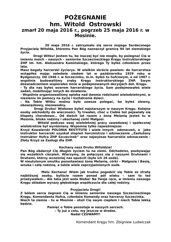 POŻEGNANIE hm. Witold Ostrowski zmarł 20 maja 2016 r., pogrzeb 25 maja 2016 r. w Mosinie. 20 maja 2016 r. zatrzymało się serce mojego Serdecznego Przyjaciela Witolda, któremu Pan Bóg naznaczył granicę 94 lat ziemskiego życia. Drogi Witku! Jestem tu, bo inaczej być nie mogło, by pożegnać Cię w imieniu moich – naszych – seniorów Szczecineckiego Kręgu Instruktorskiego ZHP im. hm. Aleksandra Kamińskiego, którego Ty byłeś członkiem przez lata. Masz bogaty harcerski życiorys. W wielkim skrócie powiem: do harcerstwa wstąpiłeś mając zaledwie siedem lat w październiku 1929 roku w Bydgoszczy. Od 1946 r. w Szczecinku, m.in. byłeś tu hufcowym, a od 1987 r. wspólnie budowaliśmy zręby Kręgu Instruktorskiego ZHP. Swym doświadczeniem wspierałeś mnie w podejmowanych decyzjach dot. Kręgu. - Ty dla nas byłeś wzorem harcerskiego życia. Sam podejmowałeś wiele zadań, mobilizując innych do działania. - Wspólnie organizowaliśmy opiekę nad dwoma rodzinami wielodzietnymi, w niesieniu im pomocy na życie i kształcenie dzieci. - Na Tobie Witku można było zawsze polegać, bo byłeś słowny, obowiązkowy, niezawodny. Drogi Druhu! Wiekowo byłeś najstarszym w naszym Kręgu. Kolejne osoby odchodziły do wieczności. Ty trwałeś, choć u Ciebie też pojawiały się kłopoty chorobowe… Od dwóch lat razem z żoną Melanią jesteś tu w Mosinie, blisko rodziny i ukochanej córki Małgosi. Witold podczas swej wieloletniej pracy zawodowej i społecznej wielokrotnie był wyróżniany. Wspomnę tylko najważniejsze: Krzyż Kawalerski POLONIA RESTITUTA i wiele innych odznaczeń, a jako instruktor harcerski uzyskał stopień harcmistrza i odznaczenie „Zasłużony Instruktor Hufca ZHP Szczecinek” oraz najwyższe harcerskie odznaczenie Złoty Krzyż za Zasługi dla ZHP. Kochany nasz Druhu Witoldzie! Pan Bóg obdarzył Cię długim życiem tu na ziemi. Odchodzisz, pozbywając się wszelkich cierpień. Wierzymy, że połączysz się z naszymi Druhnami i Druhami, którzy wcześniej nas opuścili (było ich 26 osób). W nieutulonym smutku pozostawiasz żonę Melanię, córki – Małgosię i Basię, wnuka i całą rodzinę, a także wiele zaprzyjaźnionych osób. Melu Kochana! Wiem jak trudno pogodzić się Tobie ze stratą najbliższej osoby, byliście razem ponad pół wieku – sam to też przeżywałem… Ale taka jest wola Nieba! Na Twoje ręce, w imieniu naszego Kręgu składam wyrazy głębokiego współczucia dla całej rodziny. Przyjacielu Drogi! Z bólem serca żegnam Cię w imieniu seniorów naszego Szczecineckiego Kręgu, Komendanta Hufca, członków Komendy oraz harcerzy Szczecinka. Niech ta ziemia - tu w Mosinie - otuli Cię swym ciepłem i niech Tobie lekką będzie. Pamięć o Tobie pozostaje w naszych sercach. – Ty już u celu, my jeszcze w drodze. Nadal CZUWAMY! Komendant Kręgu hm. Zbigniew Ludwiczak