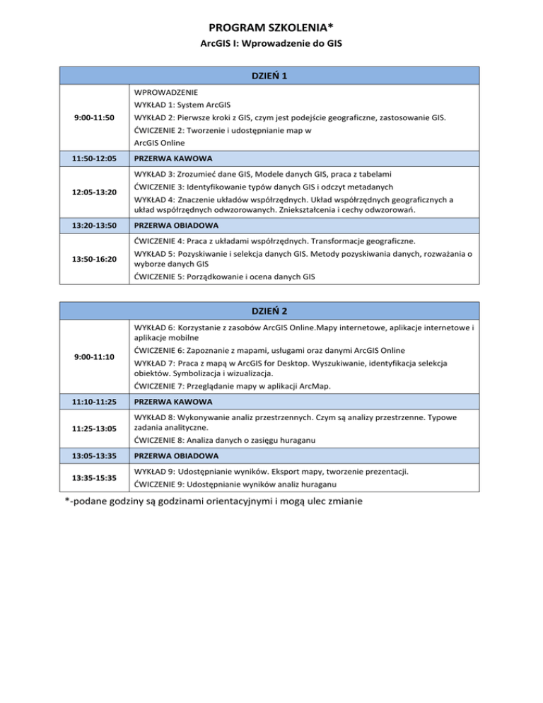 PROGRAM SZKOLENIA* ArcGIS I: Wprowadzenie do GIS DZIEŃ 1 WPROWADZENIE WYKŁAD 1: System ArcGIS 9:00-11:50 WYKŁAD 2: Pierwsze kroki z GIS, czym jest podejście geograficzne, zastosowanie GIS. ĆWICZENIE 2: Tworzenie i udostępnianie map w ArcGIS Online 11:50-12:05 PRZERWA KAWOWA WYKŁAD 3: Zrozumieć dane GIS, Modele danych GIS, praca z tabelami 12:05-13:20 13:20-13:50 ĆWICZENIE 3: Identyfikowanie typów danych GIS i odczyt metadanych WYKŁAD 4: Znaczenie układów współrzędnych. Układ współrzędnych geograficznych a układ współrzędnych odwzorowanych. Zniekształcenia i cechy odwzorowań. PRZERWA OBIADOWA ĆWICZENIE 4: Praca z układami współrzędnych. Transformacje geograficzne. 13:50-16:20 WYKŁAD 5: Pozyskiwanie i selekcja danych GIS. Metody pozyskiwania danych, rozważania o wyborze danych GIS ĆWICZENIE 5: Porządkowanie i ocena danych GIS DZIEŃ 2 WYKŁAD 6: Korzystanie z zasobów ArcGIS Online.Mapy internetowe, aplikacje internetowe i aplikacje mobilne 9:00-11:10 ĆWICZENIE 6: Zapoznanie z mapami, usługami oraz danymi ArcGIS Online WYKŁAD 7: Praca z mapą w ArcGIS for Desktop. Wyszukiwanie, identyfikacja selekcja obiektów. Symbolizacja i wizualizacja. ĆWICZENIE 7: Przeglądanie mapy w aplikacji ArcMap. 11:10-11:25 PRZERWA KAWOWA 11:25-13:05 WYKŁAD 8: Wykonywanie analiz przestrzennych. Czym są analizy przestrzenne. Typowe zadania analityczne. ĆWICZENIE 8: Analiza danych o zasięgu huraganu 13:05-13:35 13:35-15:35 PRZERWA OBIADOWA WYKŁAD 9: Udostępnianie wyników. Eksport mapy, tworzenie prezentacji. ĆWICZENIE 9: Udostępnianie wyników analiz huraganu *-podane godziny są godzinami orientacyjnymi i mogą ulec zmianie