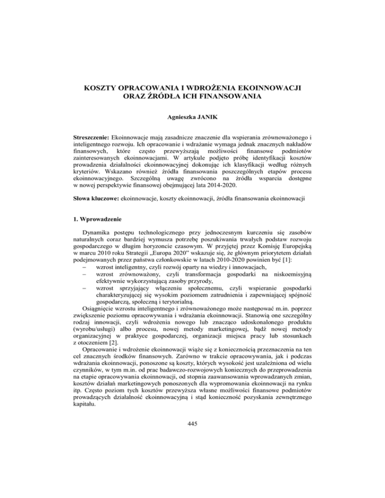 KOSZTY OPRACOWANIA I WDROŻENIA EKOINNOWACJI ORAZ ŹRÓDŁA ICH FINANSOWANIA Agnieszka JANIK Streszczenie: Ekoinnowacje mają zasadnicze znaczenie dla wspierania zrównoważonego i inteligentnego rozwoju. Ich opracowanie i wdrażanie wymaga jednak znacznych nakładów finansowych, które często przewyższają możliwości finansowe podmiotów zainteresowanych ekoinnowacjami. W artykule podjęto próbę identyfikacji kosztów prowadzenia działalności ekoinnowacyjnej dokonując ich klasyfikacji według różnych kryteriów. Wskazano również źródła finansowania poszczególnych etapów procesu ekoinnowacyjnego. Szczególną uwagę zwrócono na źródła wsparcia dostępne w nowej perspektywie finansowej obejmującej lata 2014-2020. Słowa kluczowe: ekoinnowacje, koszty ekoinnowacji, źródła finansowania ekoinnowacji 1. Wprowadzenie Dynamika postępu technologicznego przy jednoczesnym kurczeniu się zasobów naturalnych coraz bardziej wymusza potrzebę poszukiwania trwałych podstaw rozwoju gospodarczego w długim horyzoncie czasowym. W przyjętej przez Komisję Europejską w marcu 2010 roku Strategii „Europa 2020” wskazuje się, że głównym priorytetem działań podejmowanych przez państwa członkowskie w latach 2010-2020 powinien być [1]: wzrost inteligentny, czyli rozwój oparty na wiedzy i innowacjach, wzrost zrównoważony, czyli transformacja gospodarki na niskoemisyjną efektywnie wykorzystującą zasoby przyrody, wzrost sprzyjający włączeniu społecznemu, czyli wspieranie gospodarki charakteryzującej się wysokim poziomem zatrudnienia i zapewniającej spójność gospodarczą, społeczną i terytorialną. Osiągnięcie wzrostu inteligentnego i zrównoważonego może następować m.in. poprzez zwiększenie poziomu opracowywania i wdrażania ekoinnowacji. Stanowią one szczególny rodzaj innowacji, czyli wdrożenia nowego lub znacząco udoskonalonego produktu (wyrobu/usługi) albo procesu, nowej metody marketingowej, bądź nowej metody organizacyjnej w praktyce gospodarczej, organizacji miejsca pracy lub stosunkach z otoczeniem [2]. Opracowanie i wdrożenie ekoinnowacji wiąże się z koniecznością przeznaczenia na ten cel znacznych środków finansowych. Zarówno w trakcie opracowywania, jak i podczas wdrażania ekoinnowacji, ponoszone są koszty, których wysokość jest uzależniona od wielu czynników, w tym m.in. od prac badawczo-rozwojowych koniecznych do przeprowadzenia na etapie opracowywania ekoinnowacji, od stopnia zaawansowania wprowadzanych zmian, kosztów działań marketingowych ponoszonych dla wypromowania ekoinnowacji na rynku itp. Często poziom tych kosztów przewyższa własne możliwości finansowe podmiotów prowadzących działalność ekoinnowacyjną i stąd konieczność pozyskania zewnętrznego kapitału. 445 W niniejszym artykule podjęta została próba identyfikacji rodzajów kosztów generowanych w fazie opracowywania i wdrażania ekoinnowacji oraz źródeł ich finansowania, ze szczególnym uwzględnieniem nowej perspektywy finansowej Europejskiej na lata 2014-2020. 2. Pojęcie ekoinnowacji Ekoinnowacja to każda innowacja polegająca na wprowadzeniu nowego albo znacząco udoskonalonego produktu, usługi lub procesu dostarczającego wartości dodanej konsumentom i przedsiębiorcom przy równoczesnym zmniejszeniu wykorzystania zasobów naturalnych oraz ograniczeniu emisji zanieczyszczeń do środowiska w porównaniu z alternatywnymi rozwiązaniami [3]. Pojęcia ekoinnowacji nie należy utożsamiać jedynie z technologiami, produktami, czy usługami służącymi infrastrukturze ochrony środowiska, gdyż działalność ekoinnowacyjna może być podejmowana w każdym sektorze gospodarki, jeśli w wyniku wprowadzonych innowacyjnych zmian następuje ograniczenie lub eliminacja negatywnego wpływu dotychczasowych rozwiązań na środowisko [4]. Istotą opracowywania i wdrażania ekoinnowacji jest ograniczenie oddziaływania na środowisko w całym cyklu życia, co oznacza, że negatywny wpływ na środowisko rozpatruje się nie tylko w ramach procesu produkcyjnego, ale także bierze się pod uwagę etapy przedprodukcyjne oraz poprodukcyjne [5]. Pozwala to na osiągnięcie szeregu korzyści przez makrosystem gospodarka-środowisko-społeczeństwo, w tym: dla środowiska przyrodniczego to przede wszystkim ograniczenie negatywnego wpływu działalności człowieka na środowisko poprzez redukcję zużycia zasobów naturalnych i emisji zanieczyszczeń w całym cyklu życia, dla gospodarki to ograniczenie poziomu kosztów bieżących (poprzez zmniejszenie wydatków na zakup surowców i materiałów, czy zmniejszenie wysokości opłat środowiskowych za gospodarcze korzystanie ze środowiska) oraz możliwość zdobycia nowych rynków i tym samym wzmacniania pozycji konkurencyjnej, dla społeczeństwa to przede wszystkim poprawa jakości życia (w wyniku zmniejszenia ilości zanieczyszczeń w środowisku) oraz tworzenie nowych miejsc pracy. Jak pokazują wyniki badań [6 i 7] głównym czynnikiem zachęcającym przedsiębiorstwa do wprowadzania ekoinnowacji jest chęć poprawy wizerunku przedsiębiorstwa, możliwość obniżenia kosztów prowadzonej działalności oraz konieczność dostosowania się do obowiązujących regulacji prawnych w zakresie ochrony środowiska. Czynnikami hamującymi wprowadzenie ekoinnowacji są natomiast czynniki finansowe, w tym przede wszystkim niepewny zwrot z inwestycji w ekoinnowacje lub zbyt długi okres zwrotu, brak finansowania zewnętrznego oraz brak środków finansowych w przedsiębiorstwach na pokrycie wysokich kosztów działalności ekoinnowacyjnej. To sprawia, że przedsiębiorstwa często nie podejmują działalności ekoinnowacyjnej ze względu na duże ryzyko finansowego niepowodzenia. 3. Koszty działalności ekoinnowacyjnej i ich klasyfikacja Koszty działalności ekoinnowacyjnej to wszelkie koszty poniesione na opracowanie i wdrożenie ekoinnowacji. W literaturze przedmiotu występują liczne klas