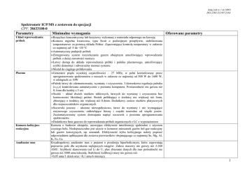Załącznik nr 1 do SIWZ DG-2501/21107/2163 Spektrometr ICP/MS z zestawem do specjacji CPV: 38433100-0 Parametry Układ wprowadzania próbek Plazma Komora kolizyjnoreakcyjna Analizator mas Minimalne wymagania Oferowane parametry • Rozpylacz koncentryczny lub krzyŜowy wykonany z materiału odpornego na korozję • Komora mgielna kwarcowa, typu Scott o podwójnym przepływie, stabilizowana temperaturowo za pomocą układu Peltier. Zapewniająca kontrolę temperatury w zakresie co najmniej od -5 do +20 °C • Automatyczny podajnik próbek • Zintegrowany system rozcieńczania gazem obojętnym umoŜliwiający wprowadzanie próbek o duŜej zawartości matrycy • Łatwy dostęp do układu wprowadzania próbki i palnika plazmowego, umoŜliwiający szybki demontaŜ i odtwarzalny montaŜ systemu • Moduł do ciągłego próbkowania • Generator prądu wysokiej częstotliwości – 27 MHz, w pełni kontrolowany przez oprogramowanie spektrometru o mocach w zakresie co najmniej od 500 W do 1600 W, w odstępach co 10W • Palnik łatwy do zdemontowania, wymiany i czyszczenia. 3-kierunkowa regulacja palnika (x,y,z) kontrolowana automatycznie z poziomu komputera. Powtarzalność nie gorsza niŜ 0,1mm dla kaŜdej z 3 osi • StoŜki – układ dwóch stoŜków niklowych, łatwych do wymiany i czyszczenia bez konieczności likwidacji próŜni. StoŜek próbkujący o średnicy nie większej niŜ 1mm, zbierający o średnicy nie większej niŜ 0,4mm. Dodatkowy zestaw stoŜków platynowych dla rozpuszczalników organicznych • Soczewki jonowe – ułoŜone niewspółosiowo, łatwe do wymiany i nie wymagające rutynowego czyszczenia, oddzielające fotony i cząstki neutralne od wiązki jonów. Zautomatyzowany system dostrajania napięć soczewek z poziomu oprogramowania spektrometru • Dodatkowa linia gazowa do wprowadzania próbek organicznych z LC z wyposaŜeniem Komora o budowie oktopola, usuwająca efektywnie interferencje spektralne z uŜyciem czystego helu. Niedopuszczalne jest uŜycie w komorze mieszanek gazów hel-gaz reakcyjny lub gazów korozyjnych, np. amoniak. Efektywność trybu kolizyjnego naleŜy poprzeć odpowiednimi aplikacjami dla zestawu pierwiastków obejmującego co najmniej Se, Mg, Al, K, Fe, Ca. Kwadrupolowy analizator mas z prętami o przekroju hiperbolicznym, które zapewniają poprawne pole dla uzyskania najlepszych osiągów. Zakres masowy nie gorszy niŜ 2-260 AMU. Szybkość skanowania (od Li do U, plus zbieranie danych dla mas pośrednich) nie gorsza niŜ 3000 amu/sekundę. Stabilność kalibracji masy nie gorsza niŜ: <0,05 amu/1 dzień oraz <0,1 amu/6 miesięcy 1 Detektor mas System próŜniowy Układ chłodzenia Zestaw zapasowych materiałów zuŜywalnych Minimalne wymogi analityczne Detektor mas w postaci powielacza elektronów, pracujący w trybie pulsowym i analogowym. Pozwala na jednoczesne oznaczanie pierwiastków zarówno na poziomie śladowym (ng/l) jak i wysokich stęŜeń (kilkaset mg/l). Czas integracji detektora nie gorszy niŜ 100µs w trybie pulsacyjnym i analogowym. System próŜniowy oparty na pojedynczej pompie turbomolekularnej i pompie wstępnej. Pompa wstępna powinna mieć moŜliwość wystawienia poza laboratorium. Kontrola próŜni musi zabezpieczać system przed nagłym brakiem dopływu zasilania, ustawiając aparat w stan czuwania i automatyczny restart. Chiller chłodzący- system zamknięty wraz ze wszystkimi niezbędnymi przyłączeniami Zestaw eksploatacyjny obejmujący zapasowe części zuŜywalne na co najmniej 1 rok pracy aparatu • Granice wykrywalności (3 σ) w ng/l (ppt), nie gorsze niŜ: 9 Be ≤0,5 (bez gazu w komorze) In ≤ 0,1 (bez gazu w komorze) 78 Se ≤ 1 (z wodorem w komorze) 209 Bi ≤ 0,1 (bez gazu w komorze) 75 As ≤ 20 (z helem w komorze) 115 • Stosunek tlenków nie większy niŜ CeO+ ≤ 1,5% • Sygnał tła nie większy niŜ 2 cps (dla masy 9 amu, bez gazu w komorze) • Precyzja krótkoterminowa (20 min) nie gorsza niŜ 3% RSD (w trybie standardowym i komory zderzeniowej/reakcyjnej) • Precyzja długoterminowa (2 godz.) nie gorsza niŜ 4% RSD (w trybie standardowym i komory kolizyjno-reakcyjnej) Budowa (typ) instrumentu ICP-MS System sterowania Oprogramowanie System ICP-MS typu benchtop – stojący na stole System komputerowy i oprogramowanie do sterowania ICP-MS, oprogramowanie do chromatograficznej obróbki danych. Parametry komputera nie gorsze niŜ Intel Core 2 Duo, 160 GB HDD, 2 GB RAM, DVD-RW, Gigabit LAN, 6xUSB, Windows XP lub nowszy, 20”LCD (2 szt.), drukarka laserowa kolorowa. Oprogramowanie do sterowania spektrometrem (ICP-MS) oraz pozwalające na chromatograficzną obróbkę danych w analizach specjacyjnych - analizę ilościową oraz półilościową dla nieznanego składu próbki. 2 Zestaw do analizy specjacyjnej - zestaw HPLC Chromatograf cieczowy pochodzący od tego samego producenta, w pełni kompatybilny ze spektrometrem ICP-MS, o budowie modułowej z interfejsem i oprogramowaniem, pozwalającym na adaptację spektrometru ICP-MS jako detektora mas w HPLC i uŜycie zestawu do analiz specjacyjnych (zarówno roztworów wodnych jak i organicznych). Chromatograf cieczowy moŜliwy do rozbudowy w późniejszym terminie o detektory tradycyjne typu UV-Vis, z matrycą diodową i mas typu potrójny kwadrupol i/lub analizator czasu przelotu. WyposaŜenie chromatografu cieczowego: • Pompa gradientowa minimum 4-tłokowa z moŜliwością mieszania 2 róŜnych składników w tym samym czasie z moŜliwością wyboru 2 rozpuszczalników spośród 4 dostępnych (z degazerem próŜniowym czterokanałowym zintegrowanym wymiarami z pozostałymi modułami) o precyzji przepływu <0,07 % RSD, zakres przepływu: 0,001 – 5,000 ml/min, dokładność przepływu nie gorsza niŜ 0,001 ml/min, wymagana zintegrowana wymiarami nadstawka na rozpuszczalniki i 4 butelki po 1 L, maksymalne ciśnienie co najmniej 600 bar – przy jednoczesnej moŜliwości pracy zarówno w trybie klasycznej jak i szybkiej chromatografii cie