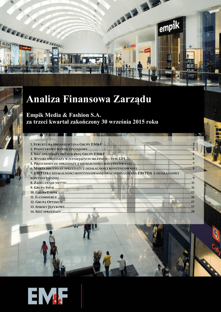 Analiza Finansowa Zarządu Empik Media & Fashion S.A. za trzeci kwartał zakończony 30 września 2015 roku 1. STRUKTURA ORGANIZACYJNA GRUPY EM&F ........................................................................................... 2 2. PODSTAWOWE WYNIKI FINANSOWE .......................................................................................................... 3 3. SIEĆ SPRZEDAŻY DETALICZNEJ GRUPY EM&F ........................................................................................ 6 4. WYNIKI SPRZEDAŻY W ISTNIEJĄCYCH SKLEPACH – TZW. LFL ................................................................... 6 5. PRZYCHODY ZE SPRZEDAŻY Z DZIAŁALNOŚCI KONTYNUOWANEJ ............................................................. 7 6. MARŻA BRUTTO ZE SPRZEDAŻY Z DZIAŁALNOŚCI KONTYNUOWANEJ........................................................ 8 7. EBITDA Z DZIAŁALNOŚCI KONTYNUOWANEJ ORAZ SKORYGOWANA EBITDA Z DZIAŁALNOŚCI KONTYNUOWANEJ........................................................................................................................................ 9 8. ZADŁUŻENIE NETTO ............................................................................................................................... 11 9. GRUPA SMYK ........................................................................................................................................... 11 10. GRUPA EMPIK ........................................................................................................................................ 13 11. E-COMMERCE ........................................................................................................................................ 16 12. GRUPA OPTIMUM................................................................................................................................... 17 13. SZKOŁY JĘZYKOWE................................................................................................................................. 17 14. SIEĆ SPRZEDAŻY .................................................................................................................................... 19 1 1. Struktura organizacyjna Grupy EM&F Na koniec III kwartału 2015 r. w ramach działalności kontynuowanej Grupy EM&F funkcjonuje pięć segmentów: - Grupa Smyk, obejmująca sieć 207 sklepów z produktami dla dzieci pod markami - Smyk w Polsce, Rosji, na Ukrainie i w Rumunii, jak również – Spiele Max w Niemczech, - Grupa Empik, w skład której wchodzą: sieć 222 sklepy Empik (oferujące książki, filmy, muzykę, multimedia, artykuły szkolno-biurowe i artystyczne, zabawki, itp.) oraz segment Publishing, na który składają się Grupa Wydawnicza Foksal i Biblioteka Akustyczna, - Segment E-commerce, w skład którego wchodzą sklepy internetowe: empik.com, smyk.com, empikfoto.pl, empiktravel.pl i gandalf.com.pl oraz spółki segmentu Digital, zajmujące się agregacją i dystrybucją treści w formie cyfrowej w kategoriach „muzyka”, „książka”, „gry”, - Grupa Optimum, która obejmuje spółki Optimum Distribution (dystrybucja artykułów kosmetycznych i produktów optycznych na terenie Polski, Czech i Słowacji) oraz spółki Amersport (dystrybucja hurtowa i detaliczna artykułów sportowych, głównie w Polsce i Rosji). - Pozostałe Segmenty obejmuje spółki prowadzące działalność holdingową. Z kolei w działalności zaniechanej na koniec III kwartału 2015 r. zaprezentowano: - Segment szkół językowych (sieci szkół językowych Speak Up oraz Empik School), który jest w trakcie procesu sprzedaży, - Segment Moda – w ślad za strategiczną decyzją zarządu EM&F o wyjściu z tego segmentu działalności. Zgodnie z zapowiedziami – proces ten został zakończony wraz z końcem II kwartału 2015 r., - Działalność sieci Smyk w Czechach (1 sklep, zakończenie działalności w II kwartale 2014 r.) oraz w Turcji (8 sklepów; Smyk zakończył z powodzeniem wyjście z nierentownych operacji w Turcji w II kwartale 2014 r.) – w związku ze strategiczną decyzją zarządu Grupy Smyk dotyczącą koncentracji rozwoju na najbardziej perspektywicznych rynkach (tj. Polska, Niemcy, Rosja, Ukraina, Rumunia), spółka zakończyła działalność na mniej perspektywicznych rynkach w Czechach i Turcji. 2 2. Podstawowe wyniki finansowe Rachunek wyników * mln PLN Działalność kontynuowana Przychody ze sprzedaży Marża brutto EBITDA Skorygowana EBITDA ** - Grupa Smyk - Grupa Empik - Sklepy Empik - Publishing - E-commerce - Grupa Optimum - Pozostałe segmenty EBIT Strata netto Działalność zaniechana *** Przychody ze sprzedaży Marża brutto EBITDA EBIT Strata netto III kw. 2015 III kw. 2014 zmiana w proc. I-III kw. 2015 I-III kw. 2014 697 274 38 33 18 2 5 -3 6 4 2 16 -21 646 272 34 38 13 14 16 -2 6 4 1 10 -10 50 2 3 -5 5 -11 -11 0 -1 0 1 7 -11 8% 1% 10% -14% 40% -83% -68% 19% -11% 2% 209% 69% 112% 1 983 811 83 78 38 6 12 -7 15 18 2 5 -80 32 24 -5 -8 -5 73 33 -2 -8 -8 -41 -9 -2 0 3 -56% -28% 106% -1% -36% 135 92 -11 -67 -65 zmiana w proc. 1 818 767 68 71 17 22 24 -2 13 22 -3 -3 -57 166 44 15 8 21 -16 -11 -5 2 -4 5 8 -24 9% 6% 23% 11% 127% -74% -48% 267% 17% -19% -169% -241% 42% 271 137 -28 -54 -58 -136 -46 17 -13 -7 -50% -33% -62% 23% 13% * Niektóre informacje liczbowe i procentowe przedstawione w niniejszym dokumencie mogą się nie sumować ze względu na za okrąglenia. ** Skorygowana EBITDA Grupy EM&F wyłącza niegotówkowe zyski z wyceny programów akcji pracowniczych oraz jednorazowe koszty projektów strategicznych. *** Wyniki z działalności zaniechanej zostały zaprezentowane oddzielnie od działalności kontynuowanej. W działalności zaniechanej zostały uwzględnione wyniki segmentów: Szkoły Językowe, Moda oraz wyniki Smyk Turcja i Smyk Czechy (1 sklep). Podsumowanie wyników oraz wydarzeń operacyjnych i finansowych Przychody ze sprzedaży z działalności kontynuowanej Grupy EM&F w III