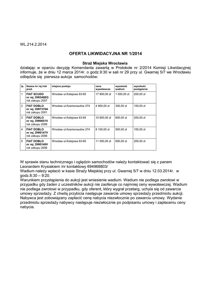 WL.214.2.2014 OFERTA LIKWIDACYJNA NR 1/2014 Straż Miejska Wrocławia działając w oparciu decyzję Komendanta zawartą w Protokole nr 2/2014 Komisji Likwidacyjnej informuje, że w dniu 12 marca 2014r. o godz.9:30 w sali nr 29 przy ul. Gwarnej 5/7 we Wrocławiu odbędzie się pierwsza aukcja samochodów: lp. Nazwa /nr rej./rok prod. miejsce postoju cena wywoławcza wysokość wadium wysokość postąpienia 1 FIAT SCUDO nr rej. DW346EG rok zakupu 2007 Wrocław ul.Kolejowa 63-65 17 800,00 zł 1 000,00 zł 200,00 zł 2 FIAT DOBLO nr rej. DW7378A rok zakupu 2001 Wrocław ul.Kosmonautów 274 4 900,00 zł 300,00 zł 100,00 zł 3 FIAT DOBLO nr rej. DW0651V rok zakupu 2006 Wrocław ul.Kolejowa 63-65 10 600,00 zł 600,00 zł 200,00 zł 4 FIAT DOBLO nr rej. DW0147V rok zakupu 2006 Wrocław ul.Kosmonautów 274 8 100,00 zł 500,00 zł 100,00 zł 5 FIAT DOBLO nr rej. DW0149V rok zakupu 2006 Wrocław ul.Kolejowa 63-65 11 000,00 zł 600,00 zł 200,00 zł W sprawie stanu technicznego i oględzin samochodów należy kontaktować się z panem Leonardem Krysiakiem /nr kontaktowy 694968803/ Wadium należy wpłacić w kasie Straży Miejskiej przy ul. Gwarnej 5/7 w dniu 12.03.2014r. w godz.8:30 – 9:20. Warunkiem przystąpienia do aukcji jest wniesienie wadium. Wadium nie podlega zwrotowi w przypadku gdy żaden z uczestników aukcji nie zaoferuje co najmniej ceny wywoławczej. Wadium nie podlega zwrotowi w przypadku, gdy oferent, który wygrał przetarg, uchyla się od zawarcia umowy sprzedaży. Z chwilą przybicia następuje zawarcie umowy sprzedaży przedmiotu aukcji. Nabywca jest zobowiązany zapłacić cenę nabycia niezwłocznie po zawarciu umowy. Wydanie przedmiotu sprzedaży nabywcy następuje niezwłocznie po podpisaniu umowy i zapłaceniu ceny nabycia.