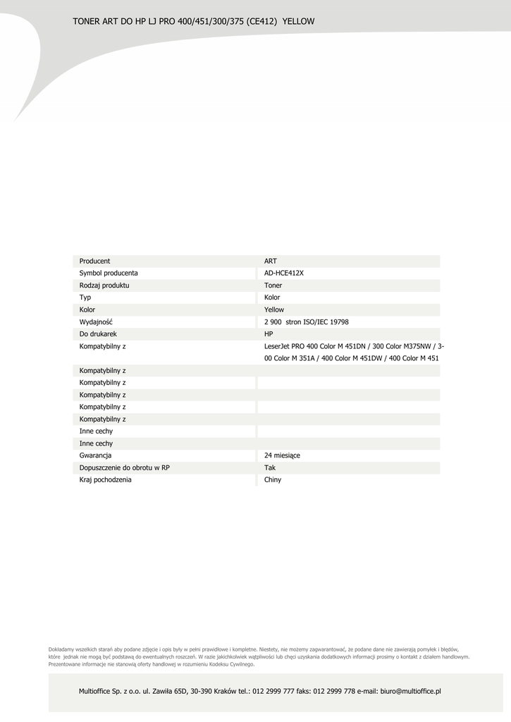 TONER ART DO HP LJ PRO 400/451/300/375 (CE412) YELLOW Producent ART Symbol producenta AD-HCE412X Rodzaj produktu Toner Typ Kolor Kolor Yellow Wydajność 2 900 stron ISO/IEC 19798 Do drukarek HP Kompatybilny z LeserJet PRO 400 Color M 451DN / 300 Color M375NW / 300 Color M 351A / 400 Color M 451DW / 400 Color M 451 Kompatybilny z Kompatybilny z Kompatybilny z Kompatybilny z Kompatybilny z Inne cechy Inne cechy Gwarancja 24 miesiące Dopuszczenie do obrotu w RP Tak Kraj pochodzenia Chiny Dokładamy wszelkich starań aby podane zdjęcie i opis były w pełni prawidłowe i kompletne. Niestety, nie możemy zagwarantować, że podane dane nie zawierają pomyłek i błędów, które jednak nie mogą być podstawą do ewentualnych roszczeń. W razie jakichkolwiek wątpliwości lub chęci uzyskania dodatkowych informacji prosimy o kontakt z działem handlowym. Prezentowane informacje nie stanowią oferty handlowej w rozumieniu Kodeksu Cywilnego. Multioffice Sp. z o.o. ul. Zawiła 65D, 30-390 Kraków tel.: 012 2999 777 faks: 012 2999 778 e-mail: [email protected]
