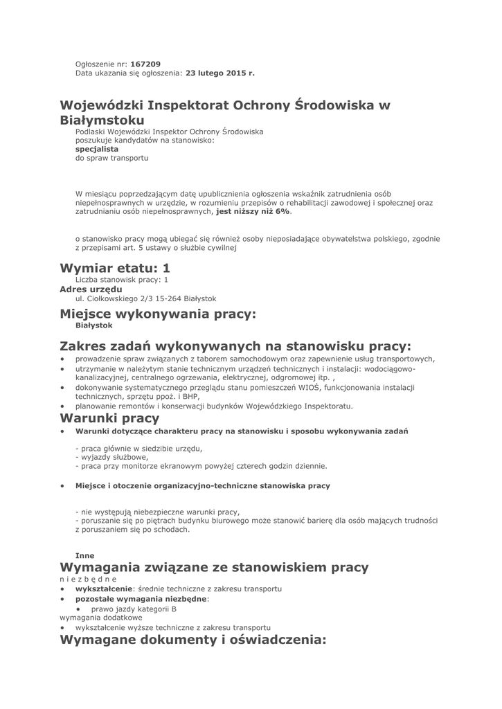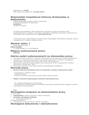 Ogłoszenie nr: 167209 Data ukazania się ogłoszenia: 23 lutego 2015 r. Wojewódzki Inspektorat Ochrony Środowiska w Białymstoku Podlaski Wojewódzki Inspektor Ochrony Środowiska poszukuje kandydatów na stanowisko: specjalista do spraw transportu W miesiącu poprzedzającym datę upublicznienia ogłoszenia wskaźnik zatrudnienia osób niepełnosprawnych w urzędzie, w rozumieniu przepisów o rehabilitacji zawodowej i społecznej oraz zatrudnianiu osób niepełnosprawnych, jest niższy niż 6%. o stanowisko pracy mogą ubiegać się również osoby nieposiadające obywatelstwa polskiego, zgodnie z przepisami art. 5 ustawy o służbie cywilnej Wymiar etatu: 1 Liczba stanowisk pracy: 1 Adres urzędu ul. Ciołkowskiego 2/3 15-264 Białystok Miejsce wykonywania pracy: Białystok Zakres zadań wykonywanych na stanowisku pracy: prowadzenie spraw związanych z taborem samochodowym oraz zapewnienie usług transportowych, utrzymanie w należytym stanie technicznym urządzeń technicznych i instalacji: wodociągowokanalizacyjnej, centralnego ogrzewania, elektrycznej, odgromowej itp. , dokonywanie systematycznego przeglądu stanu pomieszczeń WIOŚ, funkcjonowania instalacji technicznych, sprzętu ppoż. i BHP, planowanie remontów i konserwacji budynków Wojewódzkiego Inspektoratu. Warunki dotyczące charakteru pracy na stanowisku i sposobu wykonywania zadań Warunki pracy - praca głównie w siedzibie urzędu, - wyjazdy służbowe, - praca przy monitorze ekranowym powyżej czterech godzin dziennie. Miejsce i otoczenie organizacyjno-techniczne stanowiska pracy - nie występują niebezpieczne warunki pracy, - poruszanie się po piętrach budynku biurowego może stanowić barierę dla osób mających trudności z poruszaniem się po schodach. Inne Wymagania związane ze stanowiskiem pracy niezbędne wykształcenie: średnie techniczne z zakresu transportu pozostałe wymagania niezbędne: prawo jazdy kategorii B wymagania dodatkowe wykształcenie wyższe techniczne z zakresu transportu Wymagane dokumenty i oświadczenia: życiorys i list motywacyjny oświadczenie kandydata o wyrażeniu zgody na przetwarzanie danych osobowych do celów rekrutacji oświadczenie kandydata o korzystaniu z pełni praw publicznych oświadczenie kandydata o nieskazaniu prawomocnym wyrokiem za umyślne przestępstwo lub umyślne przestępstwo skarbowe kopie dokumentów potwierdzających wykształcenie w przypadku osób nieposiadających obywatelstwa polskiego - kopia dokumentu potwierdzającego znajomość języka polskiego zgodnie z rozporządzeniem Prezesa Rady Ministrów w sprawie określenia rodzajów dokumentów potwierdzających znajomość języka polskiego przez osoby nieposiadające obywatelstwa polskiego, ubiegające się o zatrudnienie w służbie cywilnej kopia dokumentu potwierdzającego posiadane obywatelstwo lub oświadczenie o posiadanym obywatelstwie kopia dokumentu potwierdzającego posiadane obywatelstwo lub oświadczenie o posiadanym obywatelstwie kopia prawa jazdy Inne dokumenty i oświadczenia: kopia dokumentu potwierdzającego niepełnosprawność - w przypadku kandydatów, którzy zamierzają skorzystać z pierwszeństwa w zatrudnieniu w przypadku, gdy znajdą się w gronie najlepszych kandydatów Termin składania dokumentów: 05-03-2015 Miejsce składania dokumentów: Wojewódzki Inspektorat Ochrony Środowiska Ciołkowskiego 2/3 15-264 Białystok z dopiskiem "oferta pracy - specjalista ds. transportu" Inne informacje: Oferty niekompletne lub wpływające po terminie (decyduje data stempla pocztowego) nie będą brane pod uwagę. Życiorys, list motywacyjny oraz oświadczenia powinny być opatrzone własnoręcznym podpisem kandydata. Informacje dla osób zakwalifikowanych do kolejnych etapów rekrutacji zostaną zamieszczone na stronie internetowej urzędu www.wios.bialystok.pl oraz w Biuletynie Informacji Publicznej urzędu. Oferty odrzucone zostaną komisyjnie zniszczone. Dodatkowe informacje można uzyskać pod nr tel: 085- 742 53 78 wew 110. Zachęcamy osoby niepełnosprawne do wzięcia udziału w postępowaniu.